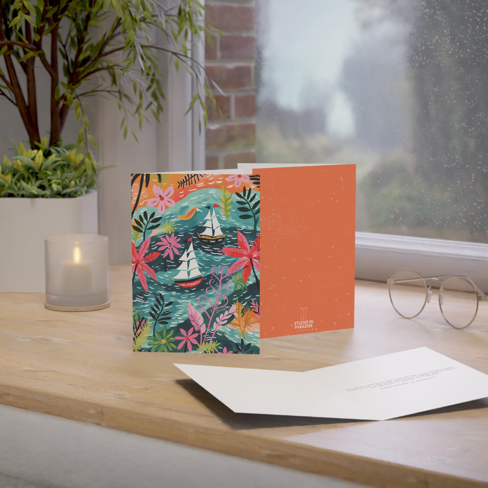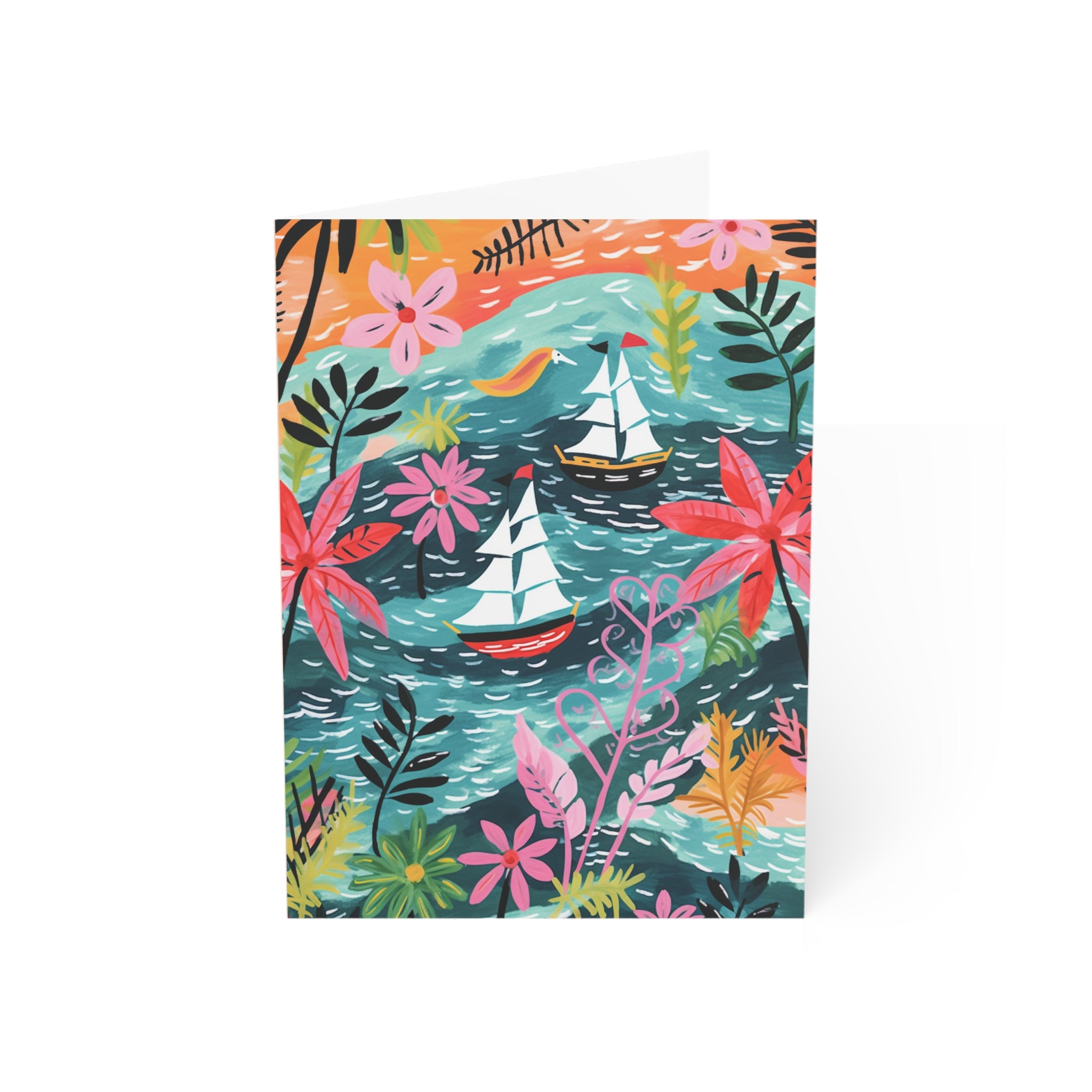 Ahoy, adventurers and seekers of mirth! Behold the "Shipload of Wishes" Birthday Greeting Card, a vibrant masterpiece from our esteemed "A Pirate's Life" Caribbean collection. Inspired by the playful strokes of Matisse, this card transports you to the lively waters of the Caribbean, where pirate ships dance in colorful splendor.