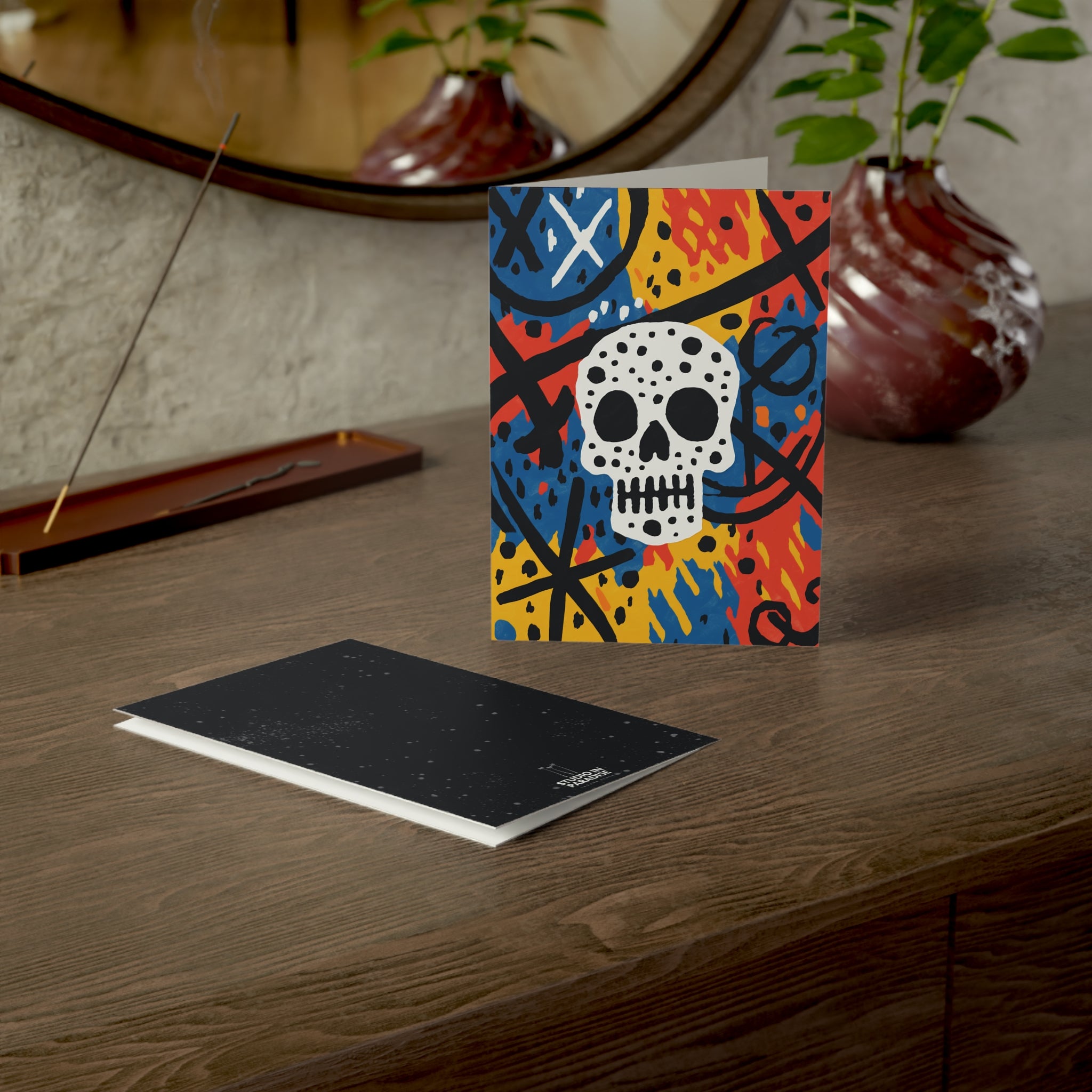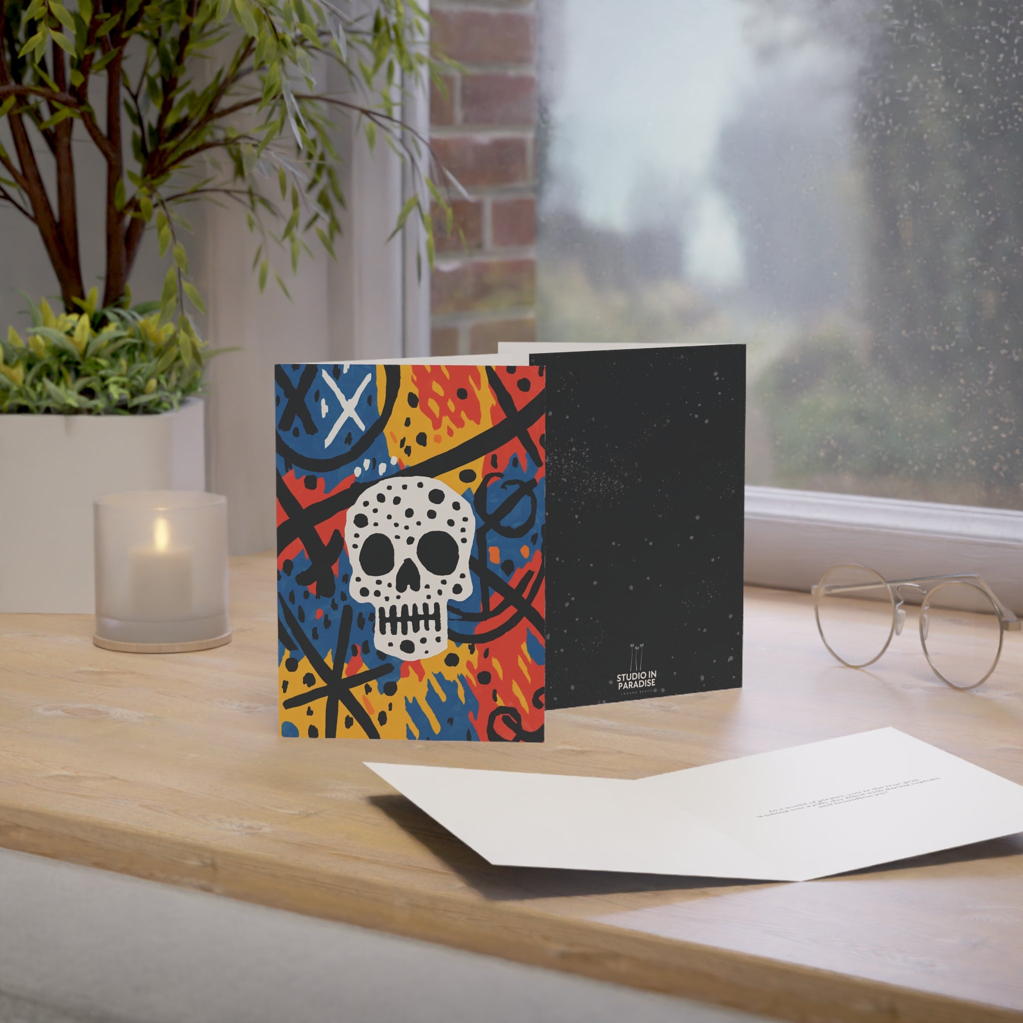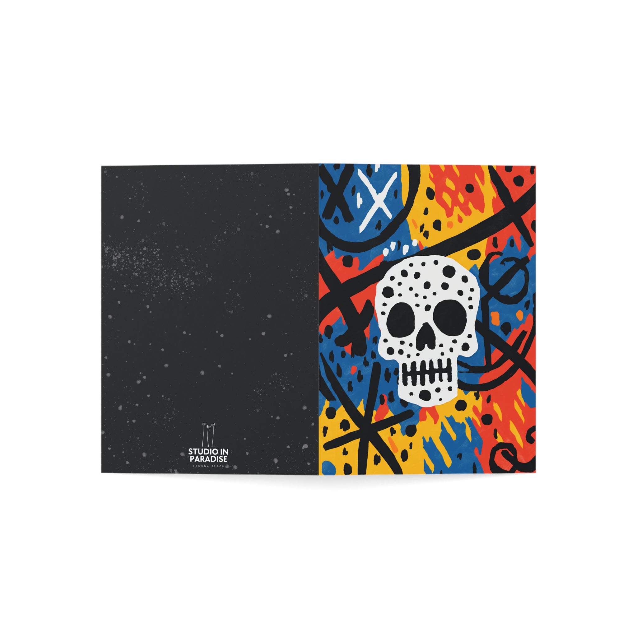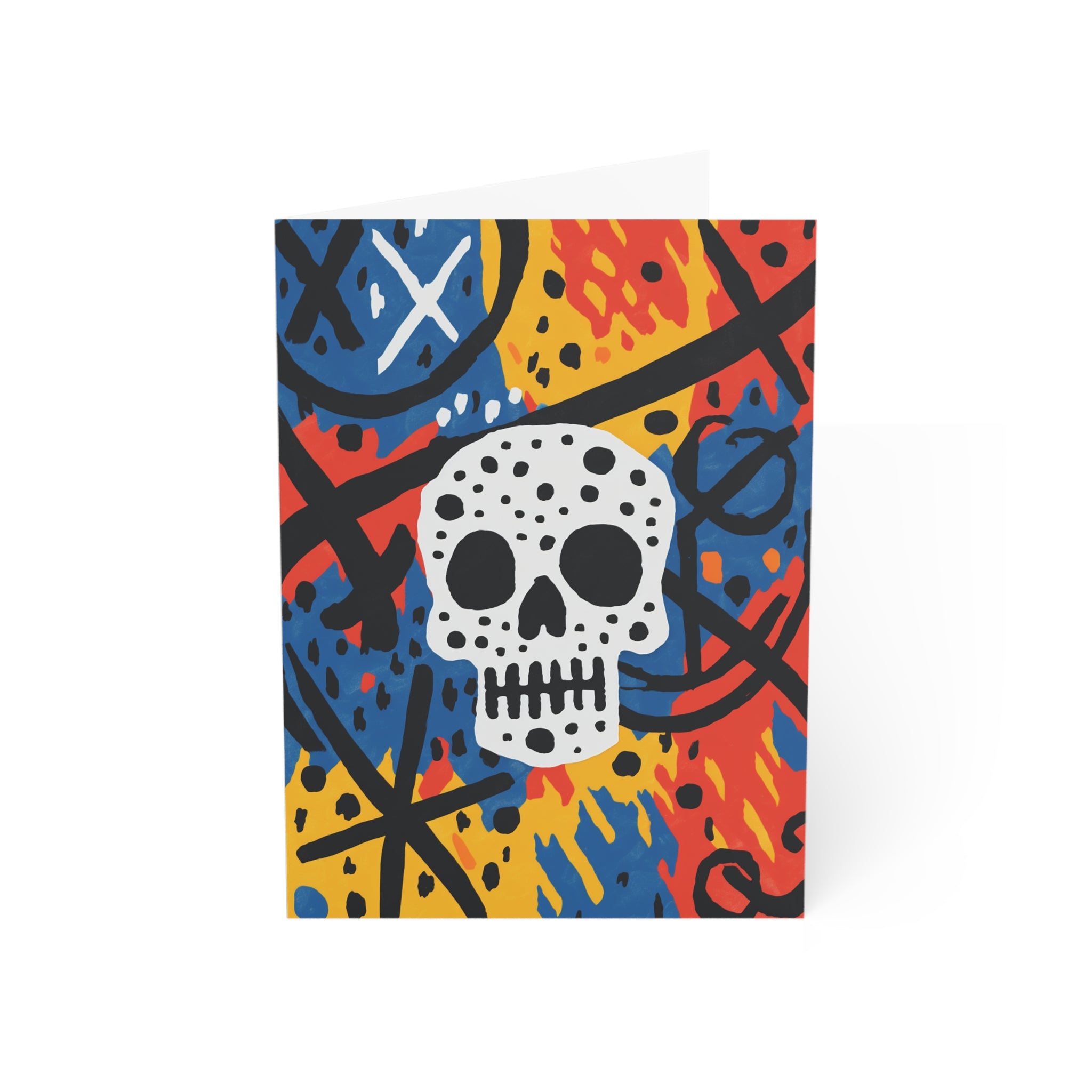 Ahoy, adventurous souls! Check out our "Skull and Crossbones" design! This greeting card is part of our "A Pirate's Life" collection inspired by vibrant Matisse-style bold color illustrations. Transport yourself to the high seas with these whimsical cards that capture the essence of a swashbuckling life. Each card showcases a playful depiction of colorful Caribbean pirate life designs inspired by Matisse's bold colors and unique artistry.