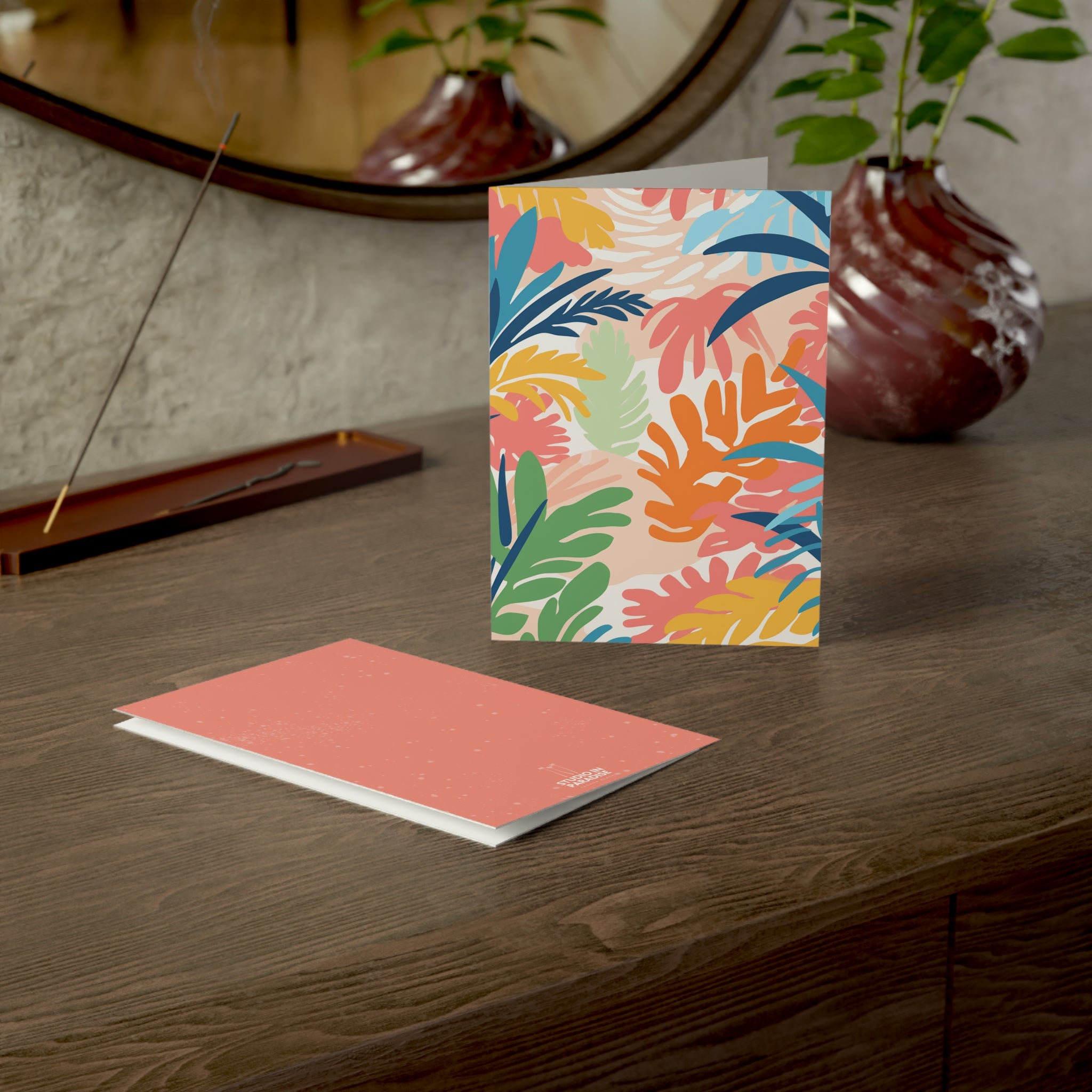 These cards are more than just greetings; they celebrate nature's boundless beauty. The Matisse-style illustrations burst with vivid colors and intricate details, capturing the essence of a vibrant and lush oasis. Whether it's the sultry allure of exotic blooms or the serene elegance of swaying palms, each card is a symphony of tropical enchantment.