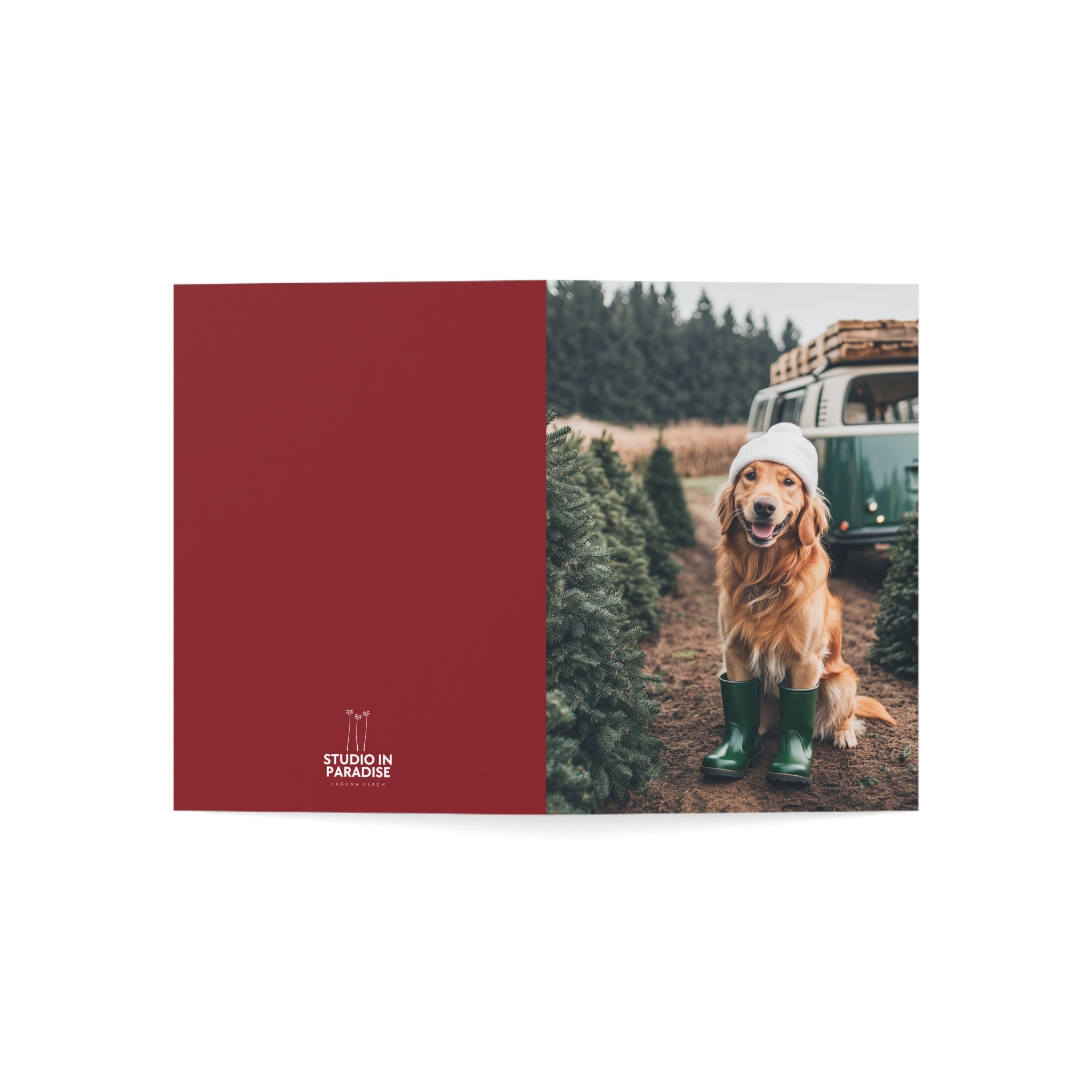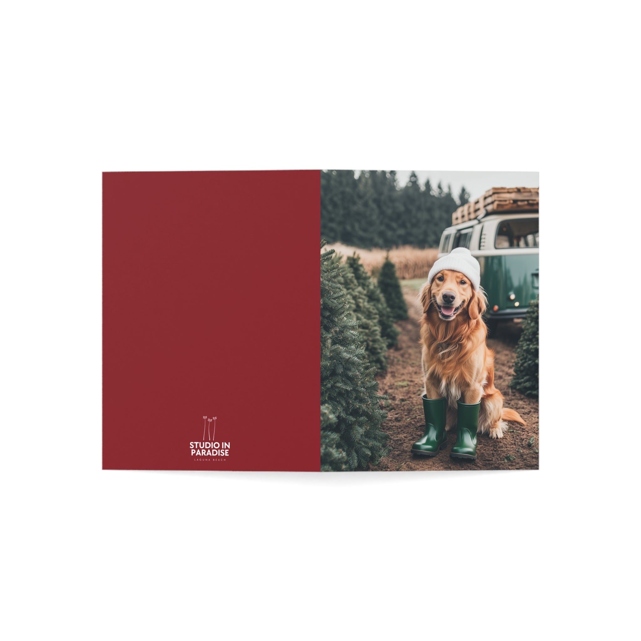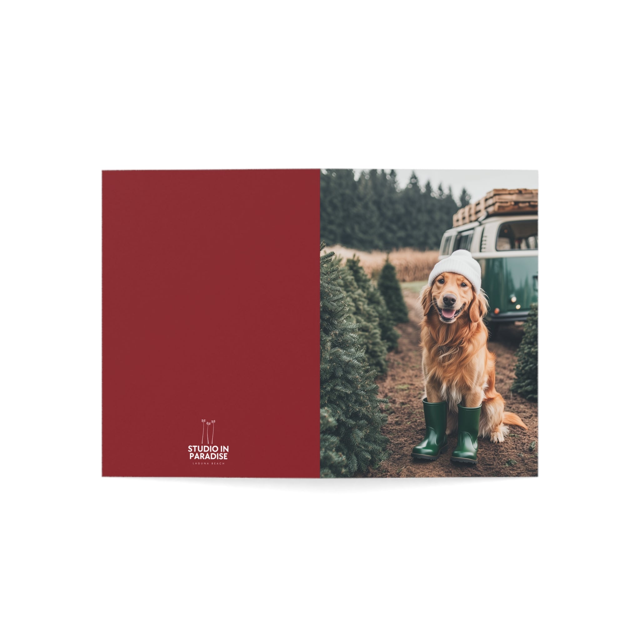 Celebrate the season with our "Powder Paws Collection" – a charming selection of holiday greeting cards featuring adorable dogs and puppies in festive winter scenes. From playful Golden Retriever puppies to cozy canines enjoying snowy landscapes, each card captures the warmth and joy of the holidays. Our Winter Woofs Greeting Card stands out in this collection, capturing a sweet Golden Retriever against a serene winter Christmas Tree Farm backdrop, making it the perfect way to send heartfelt holiday wishes.