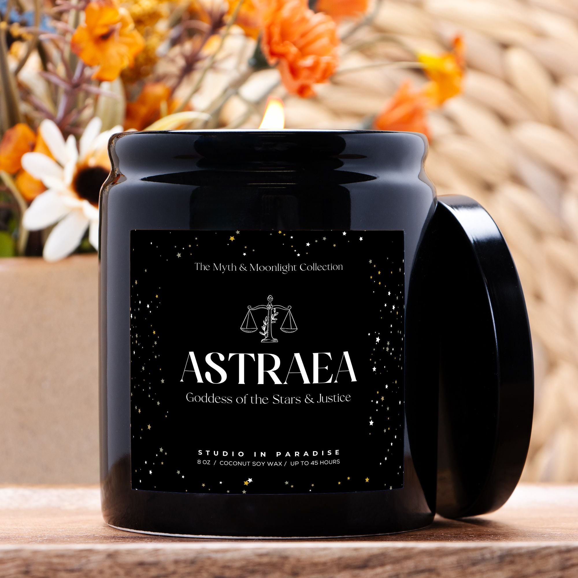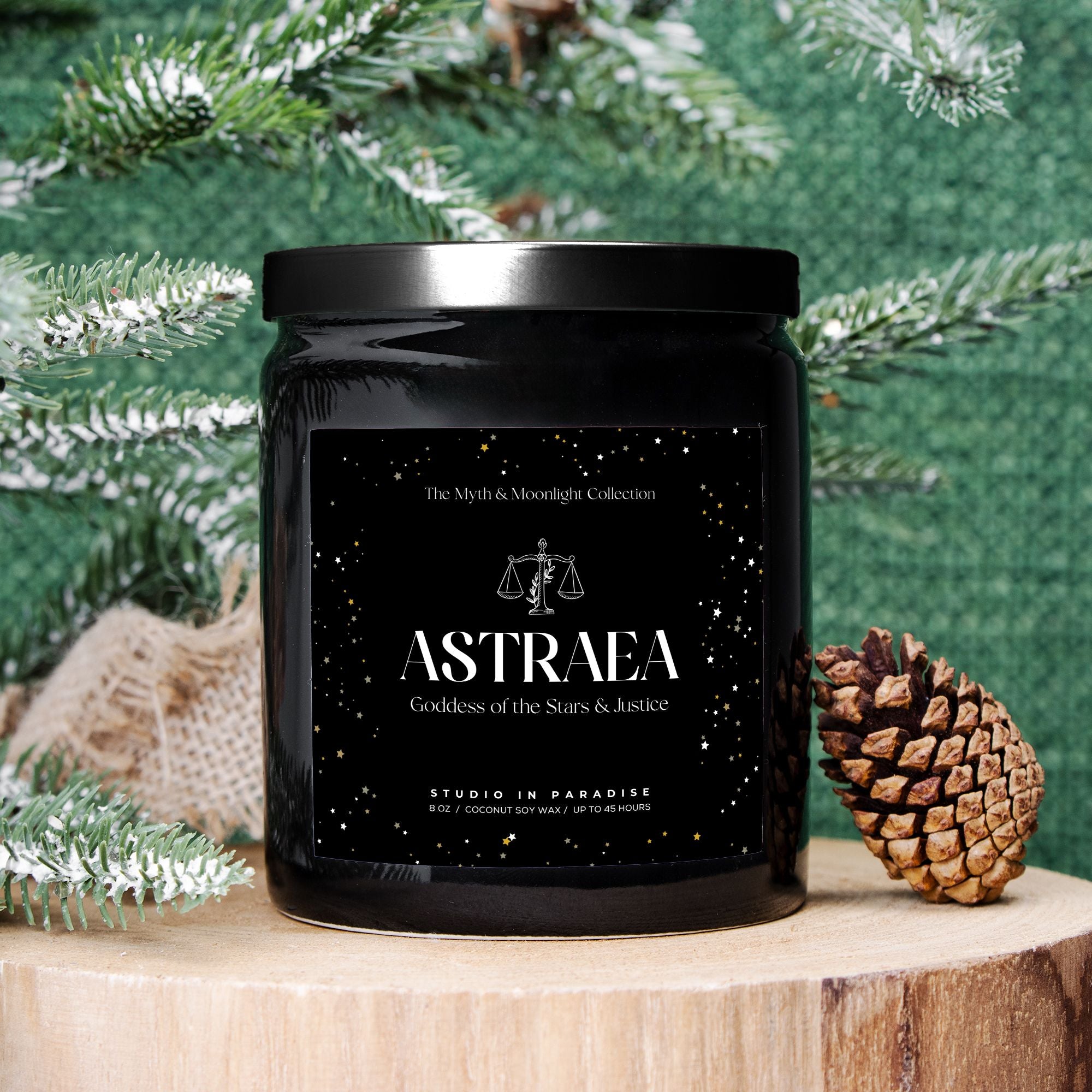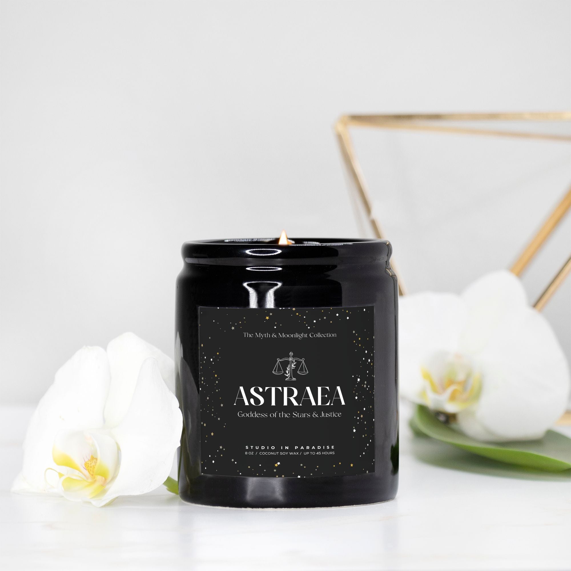 Illuminate your space with celestial brilliance and balance with the Astraea Candle, inspired by the Goddess of the Stars and Justice, from our Myths & Moonlight Collection. This hand-poured candle, crafted in the USA with a vegan coconut soy wax blend, delivers a clean, eco-friendly burn that radiates sophistication and cosmic charm.