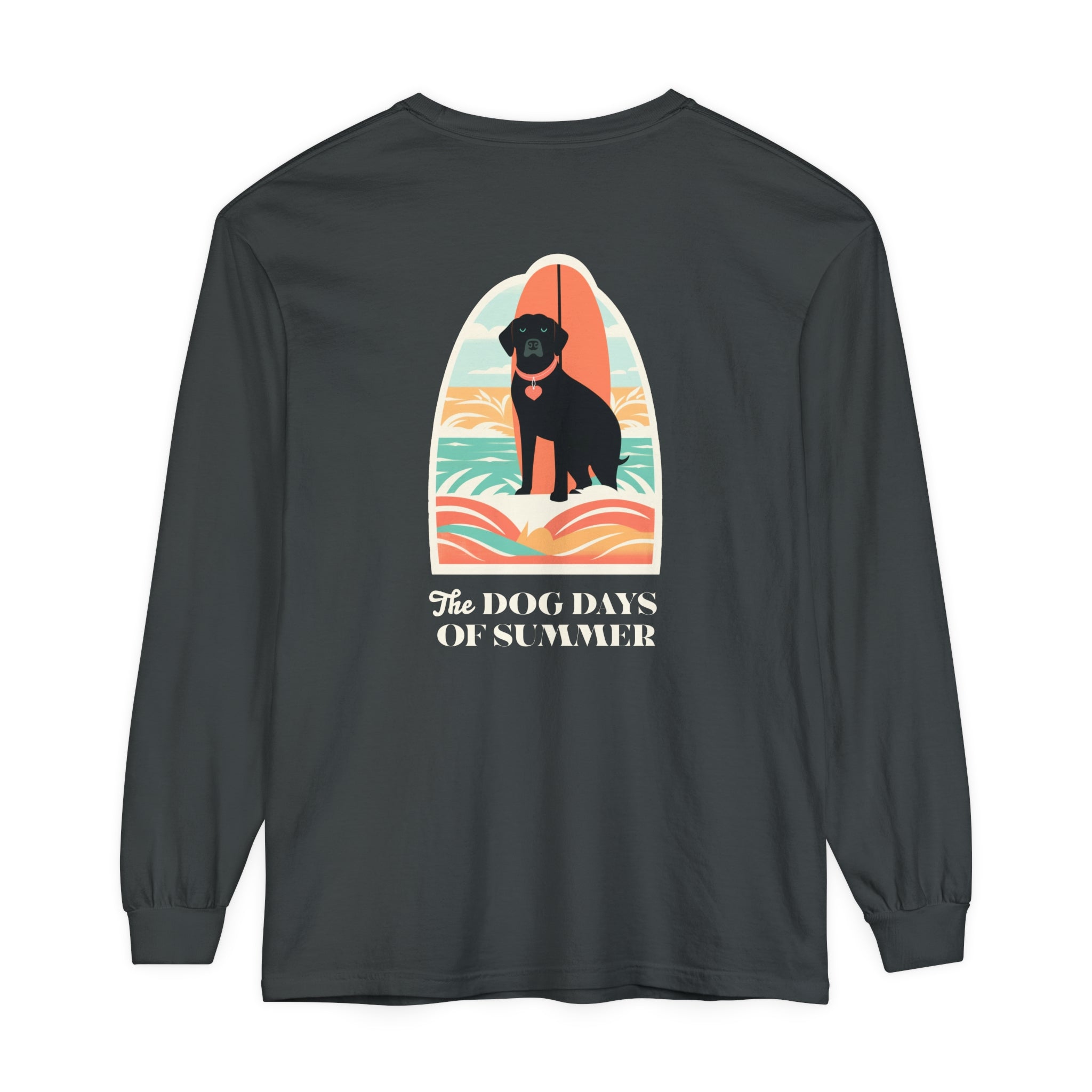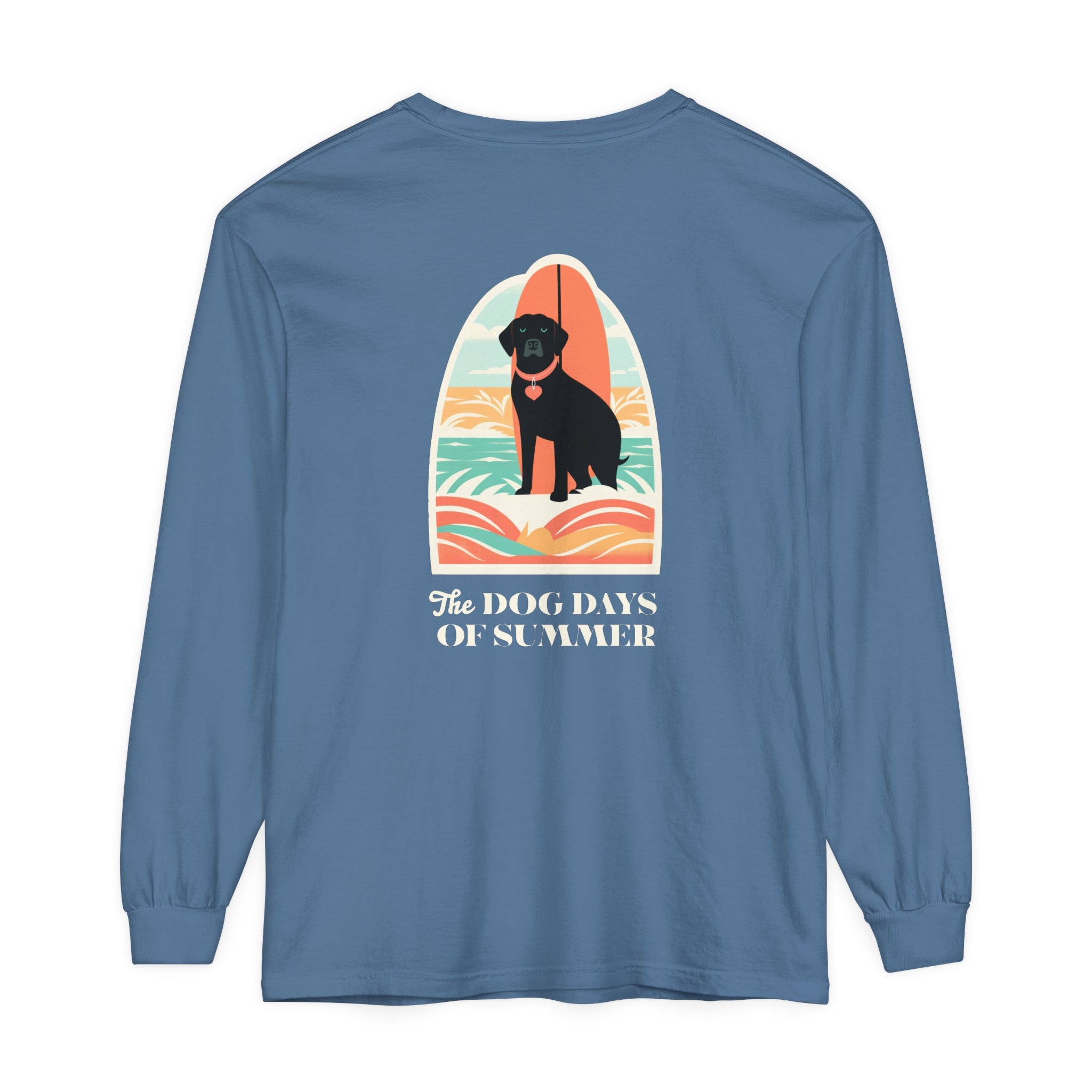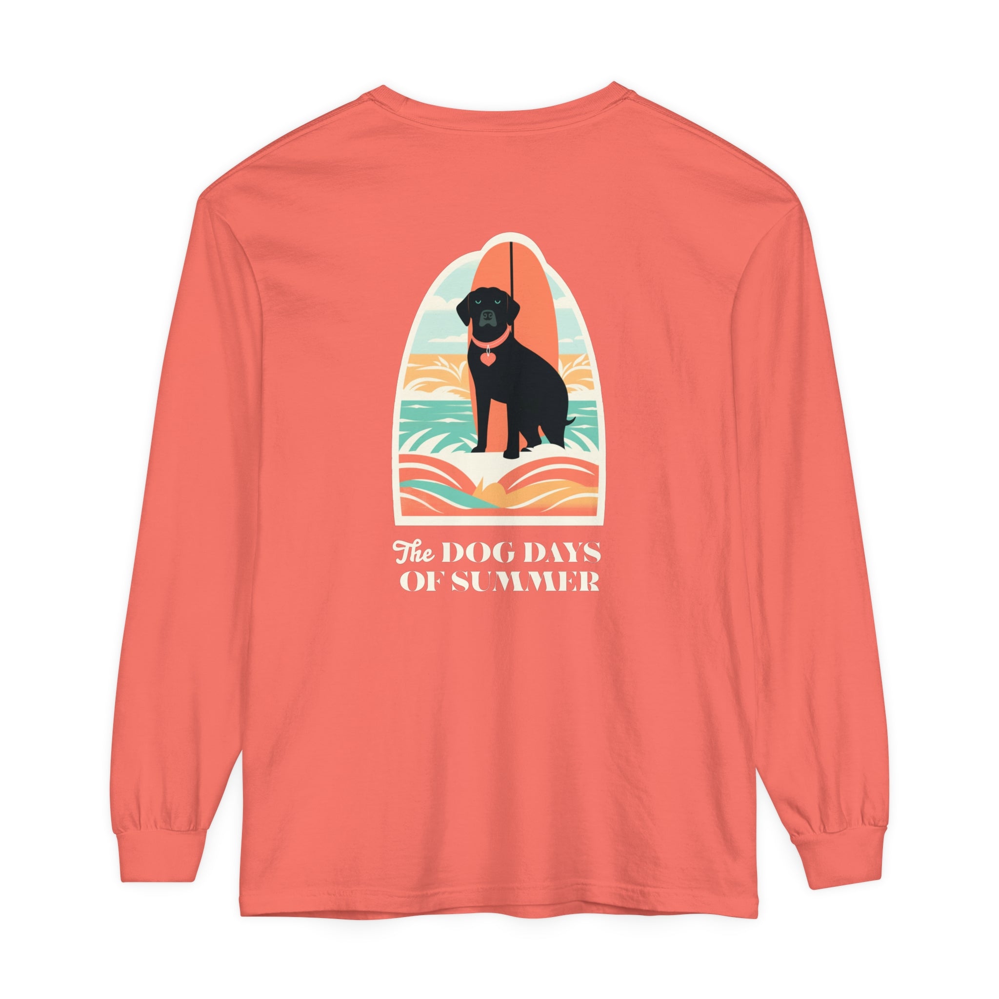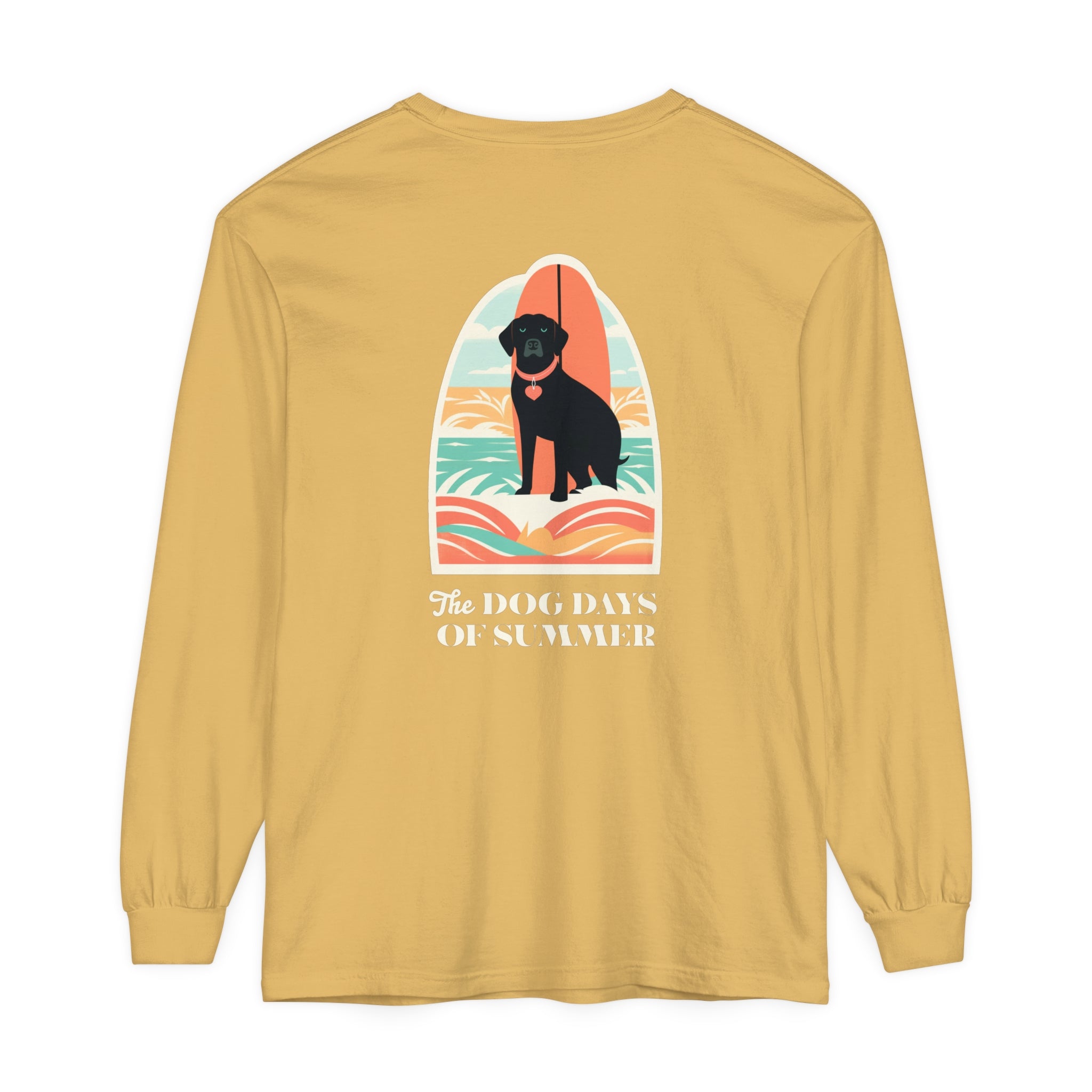 Celebrate the carefree spirit of the beach with our "Dog Days of Summer" Long-Sleeve Graphic T-Shirt. Featuring a cool Black Lab sitting in front of a surfboard illustration in pastel beach colors on the back and a small graphic on the front that says "The Dog Days of Summer," this shirt embodies the relaxed California beach vibe. Available in a variety of vibrant colors, this tee is made from 100% ring-spun cotton, offering exceptional softness and comfort. The garment-dyed fabric and relaxed fit make it perfect for boating, layering, or as a beach and pool coverup.