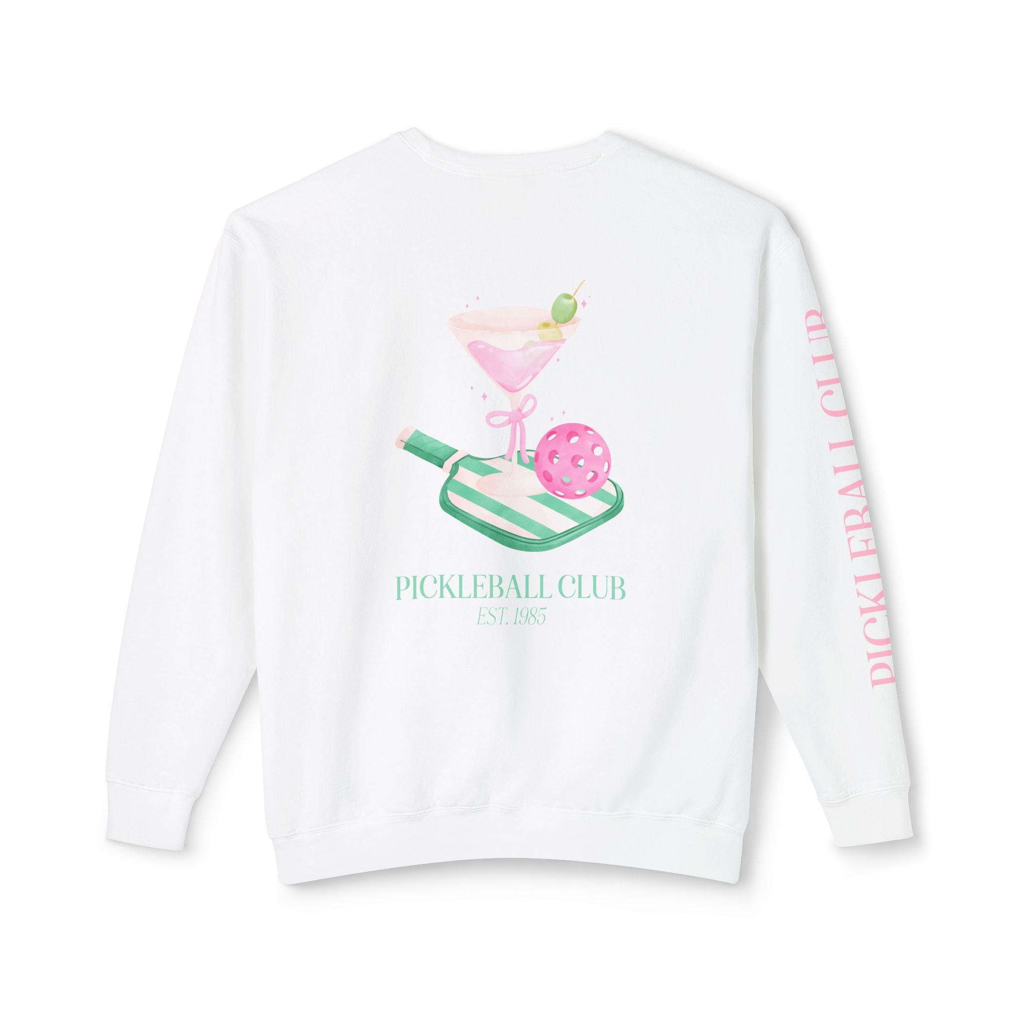 Serve up comfort, style, and flair with our exclusive Pickleball Club Crewneck Sweatshirt! This custom sweatshirt showcases a cool stockart watercolor graphic of a martini glass and pickleball paddle, along with our signature Pickleball Club sleeve graphics. Designed with front, back, and sleeve prepster-style graphics, it’s the perfect blend of playful elegance and sporty vibes.