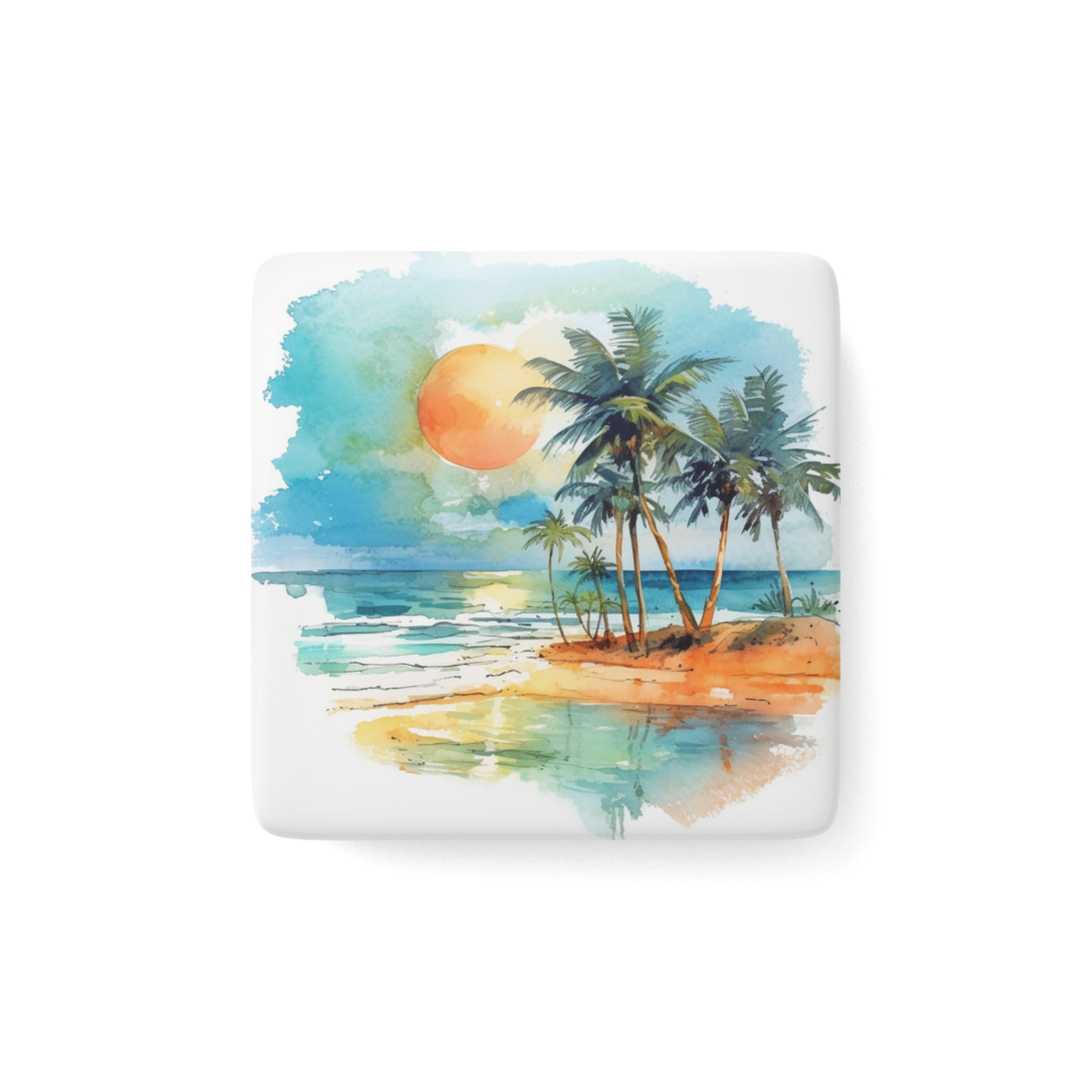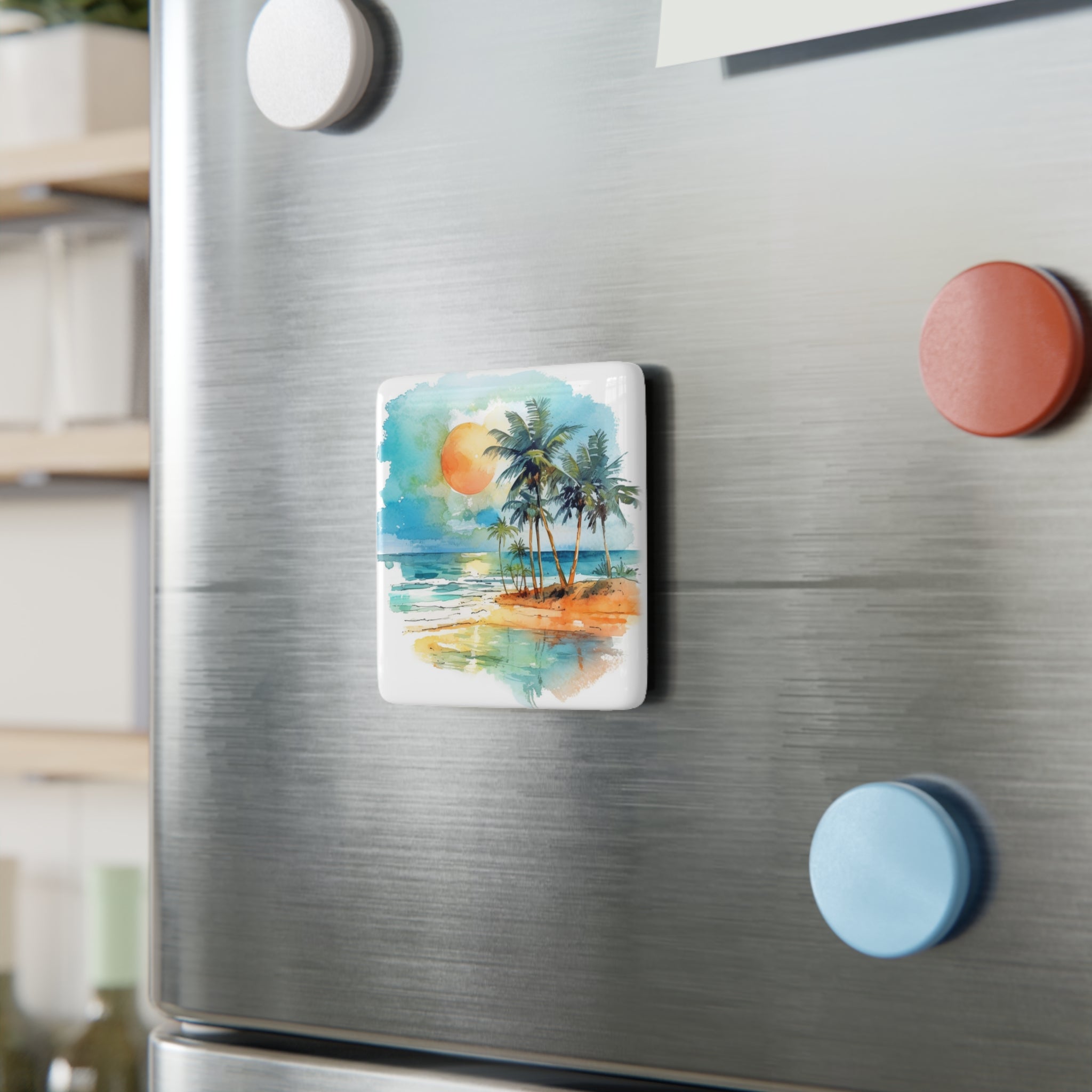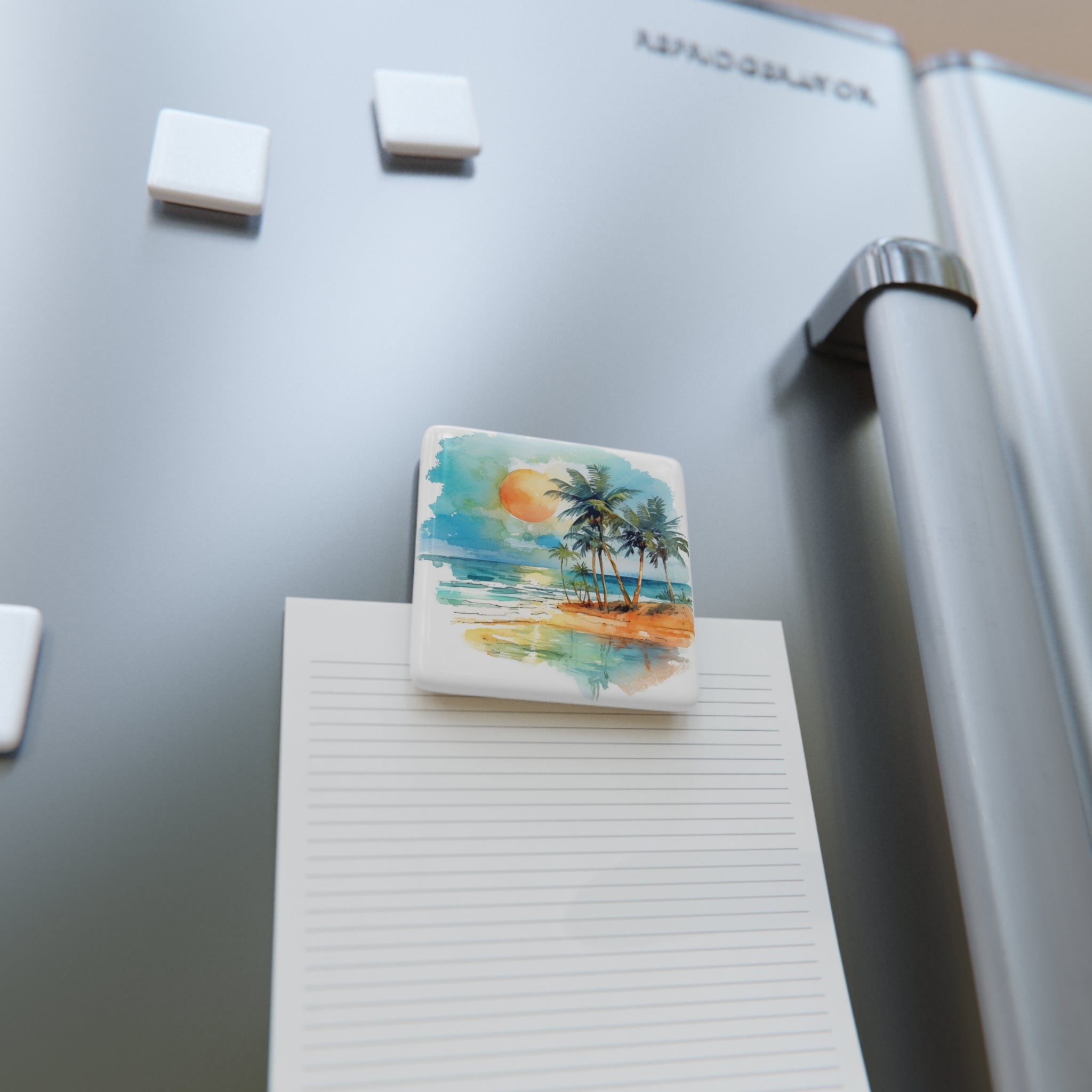Immerse yourself in the serene beauty of tropical paradises with our captivating magnets. Each watercolor illustration magnet transports you to sun-kissed beaches, lush palm groves, and tranquil coastal scenes, bringing a touch of island tranquility into your home. Measuring a charming 2" square, these magnets are the perfect way to add a dash of tropical charm to any magnetic surface.