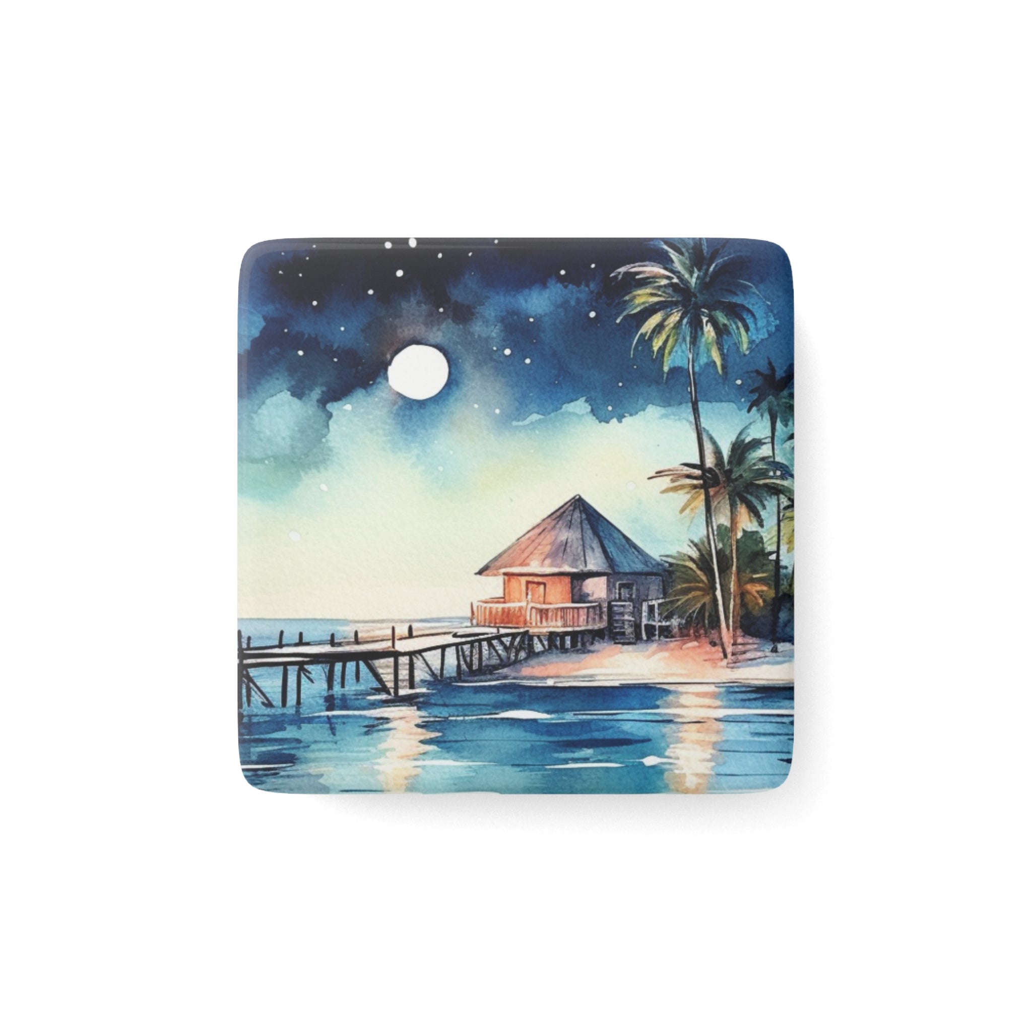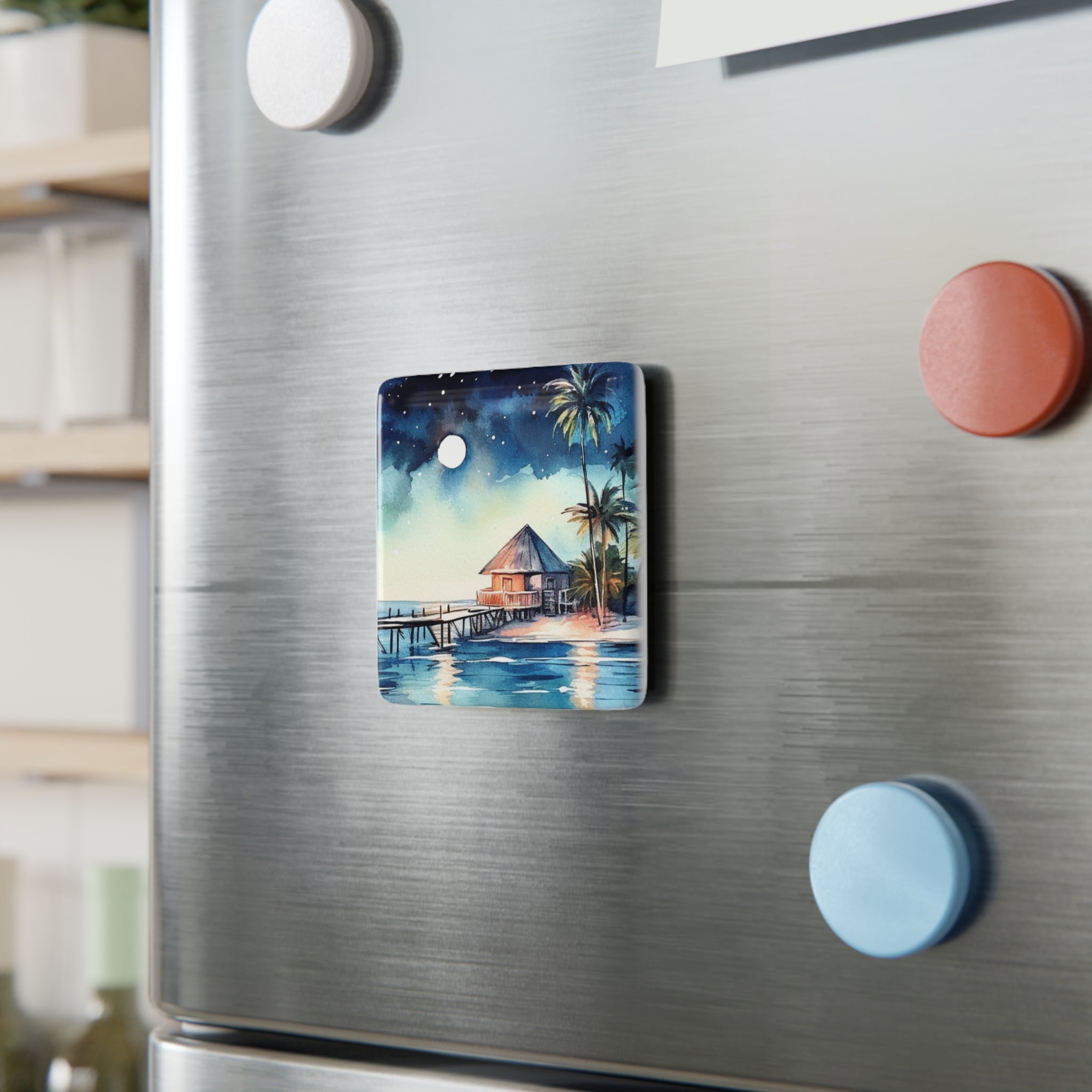 Experience the romantic and peaceful ambiance of the Maldives with our stunning watercolor illustrations of bungalows at night, part of our exclusive "Bungalow Collection." Each illustration captures the serene beauty of overwater bungalows under a starlit sky, transporting you to a world of tranquility and elegance. Measuring a charming 2" square, these magnets are the perfect way to bring a touch of tropical romance to your home.