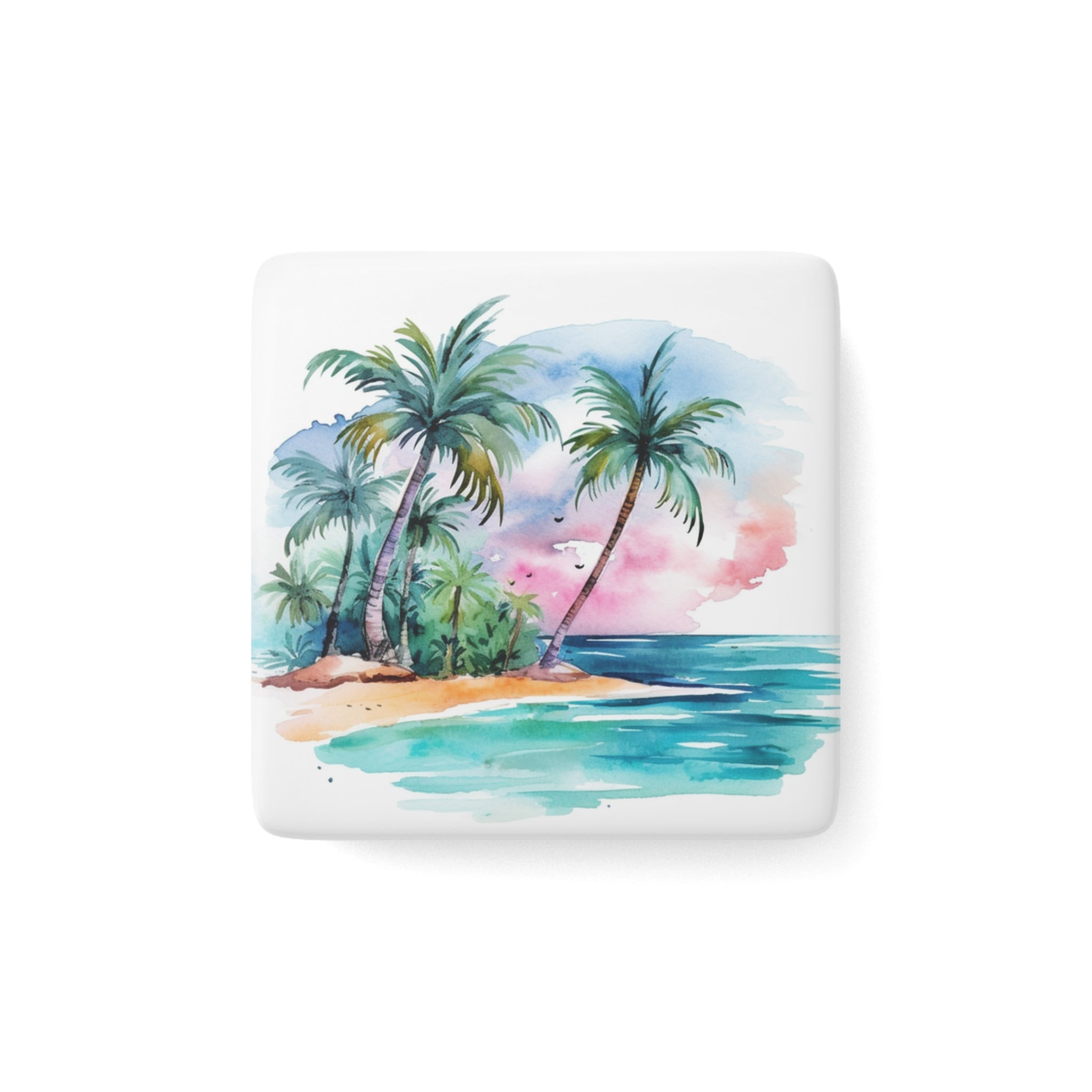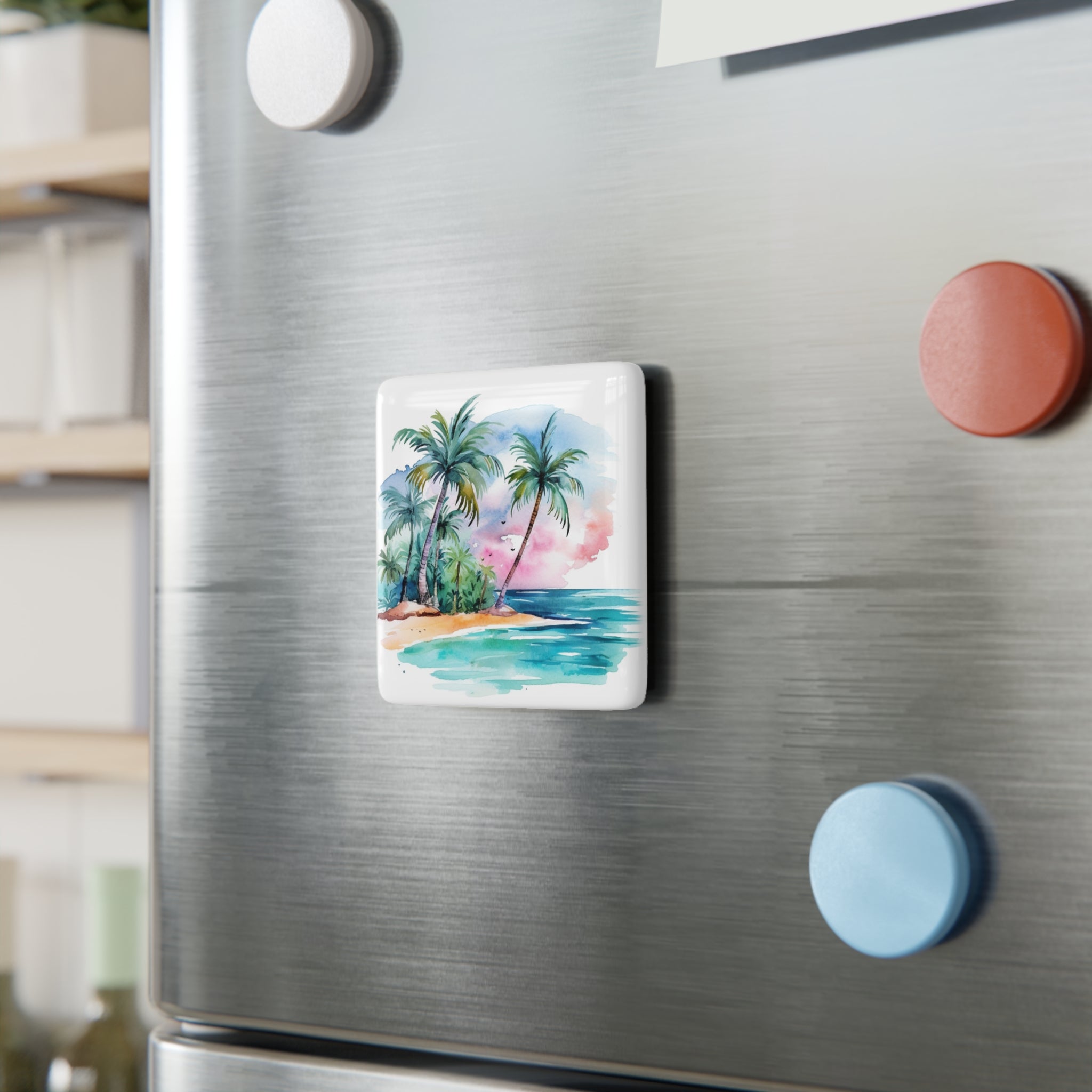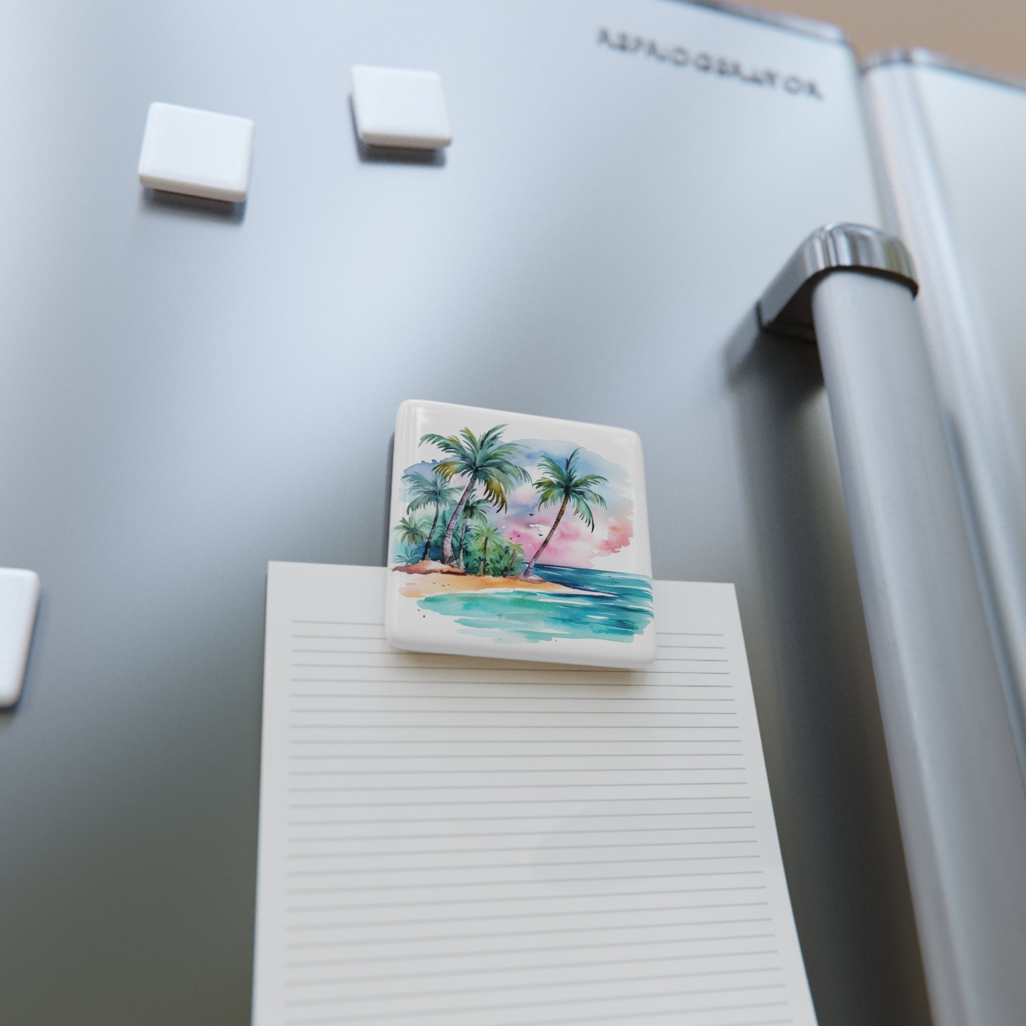 Immerse yourself in the serene beauty of tropical paradises with our captivating magnets. Each watercolor illustration magnet transports you to sun-kissed beaches, lush palm groves, and tranquil coastal scenes, bringing a touch of island tranquility into your home. Measuring a charming 2" square, these magnets are the perfect way to add a dash of tropical charm to any magnetic surface.