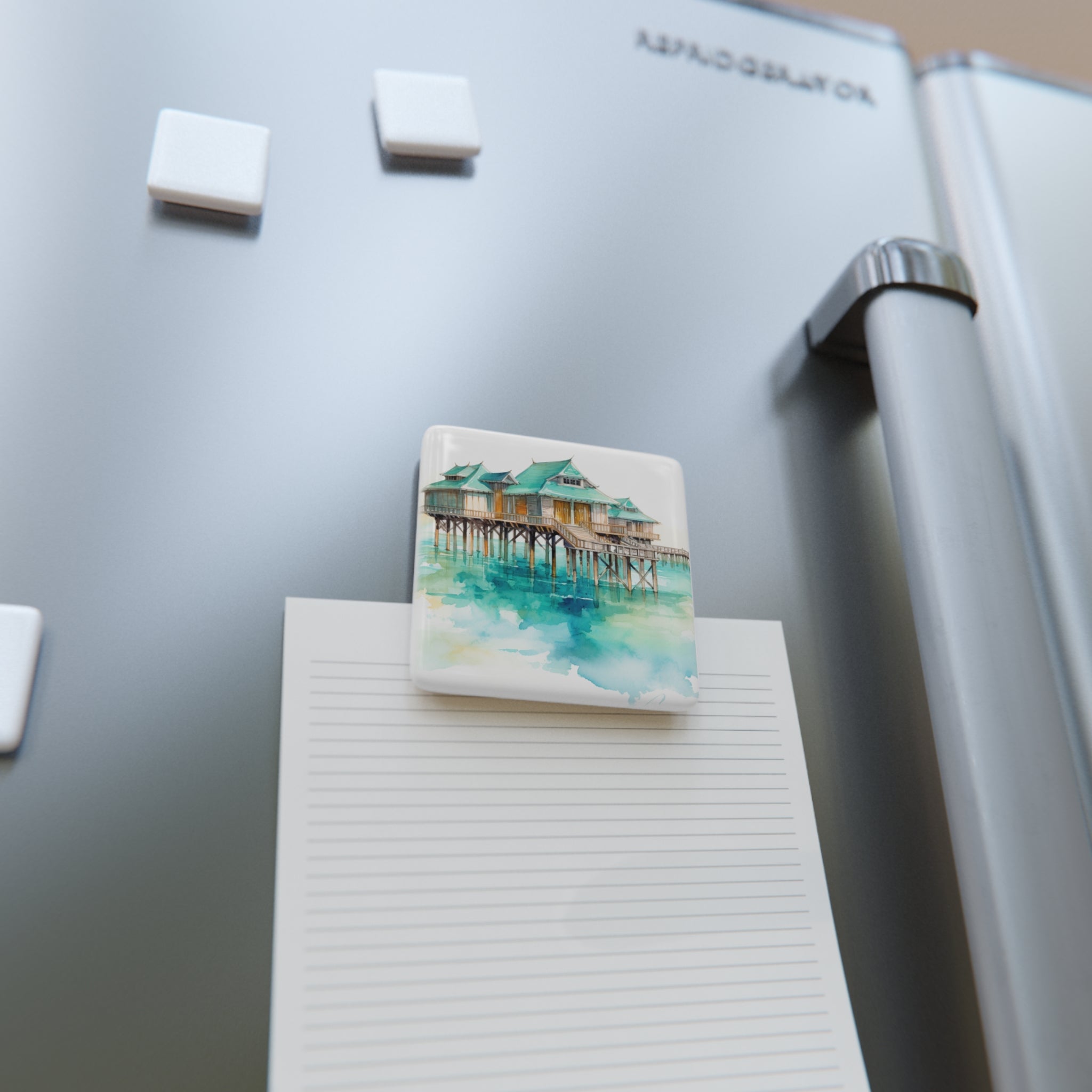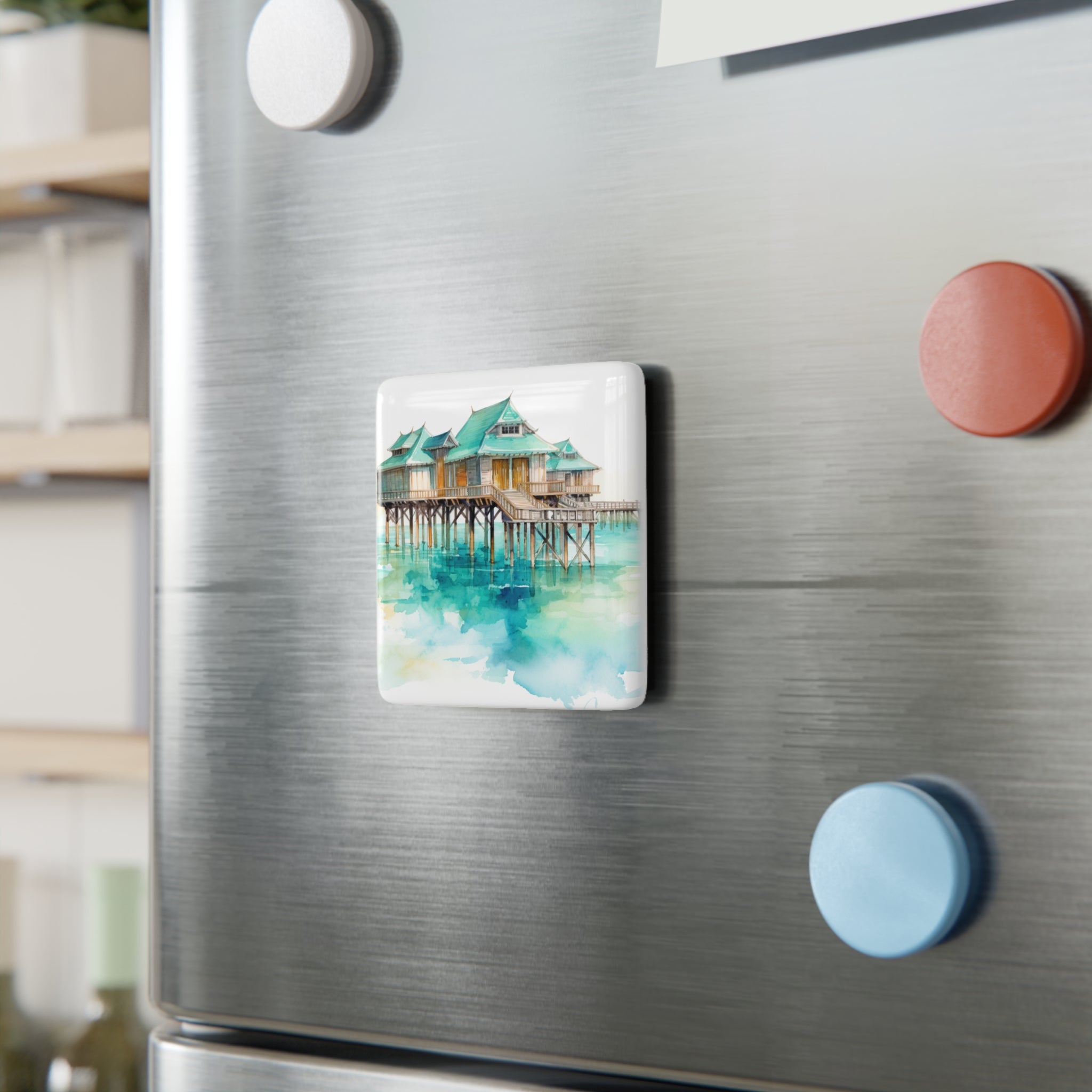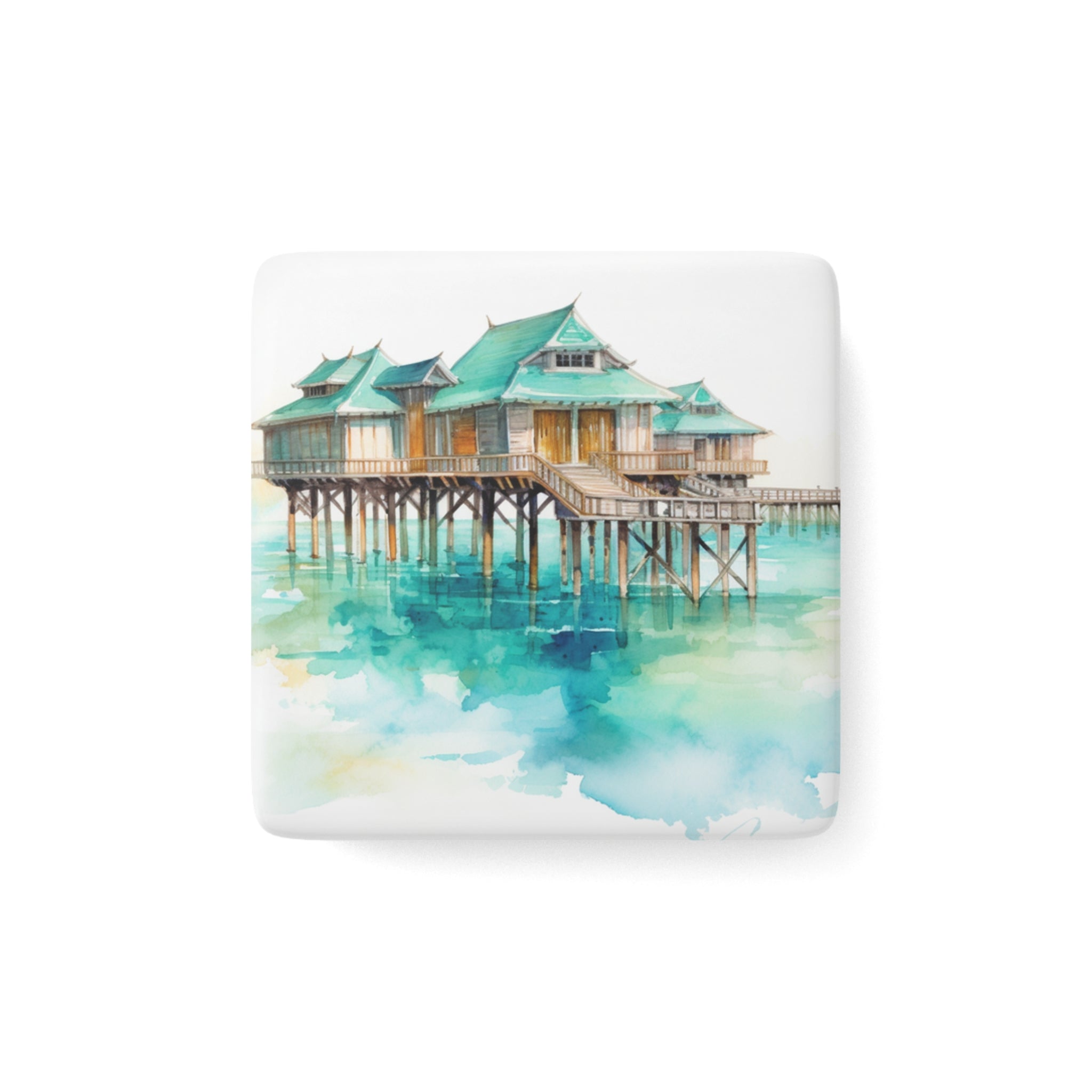 Introducing the epitome of island serenity, our Limited Edition Bungalow Collection refrigerator magnet transports you to the idyllic waters of Tahiti. Capturing the essence of relaxation, this exquisite watercolor illustration showcases a picturesque water bungalow, where the turquoise waters meet the azure sky in perfect harmony.