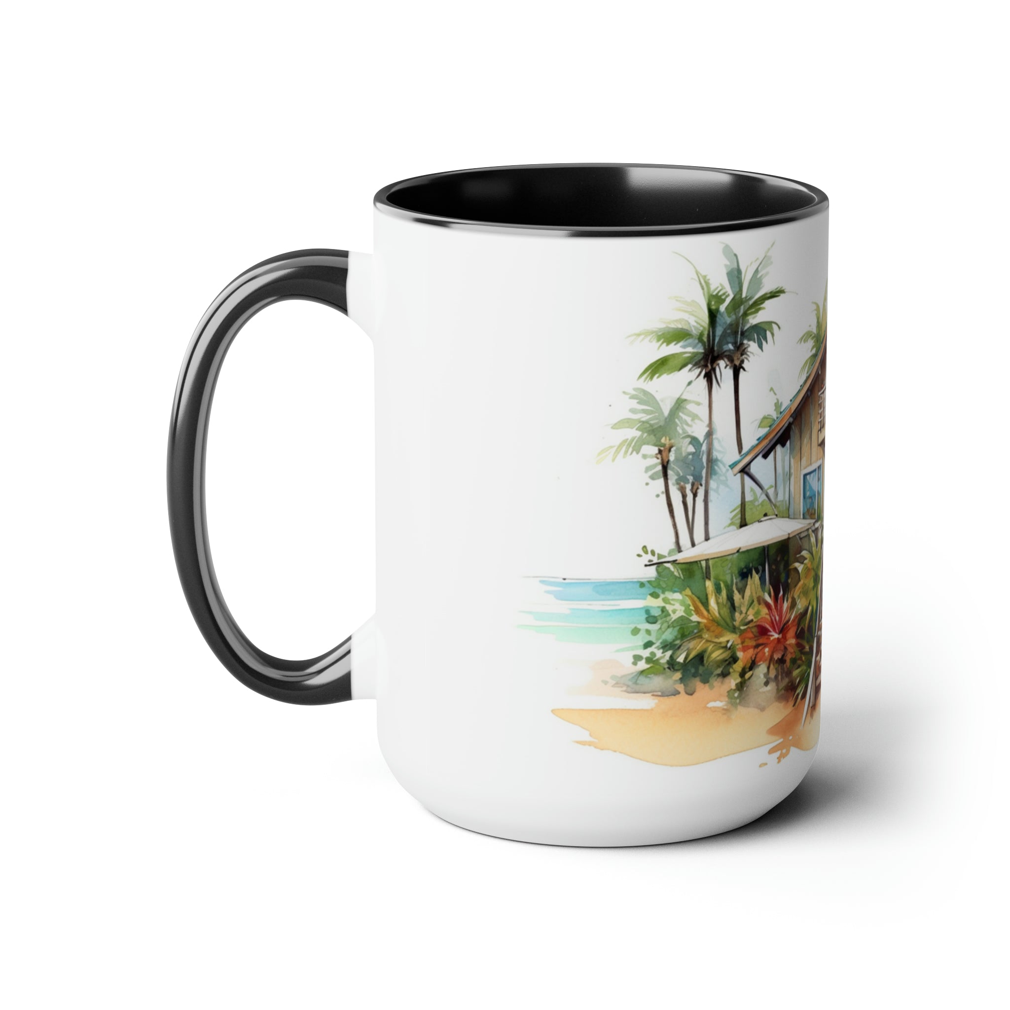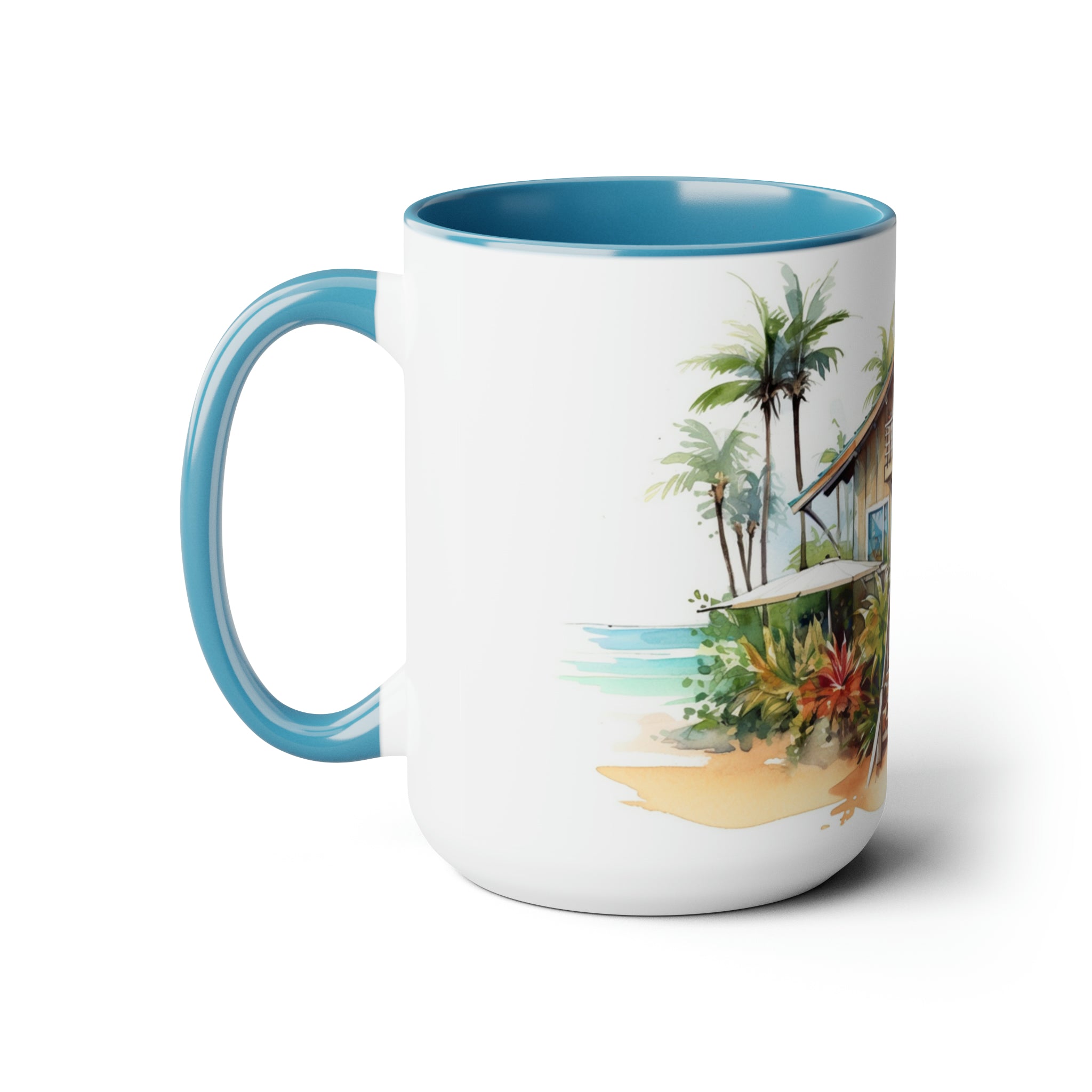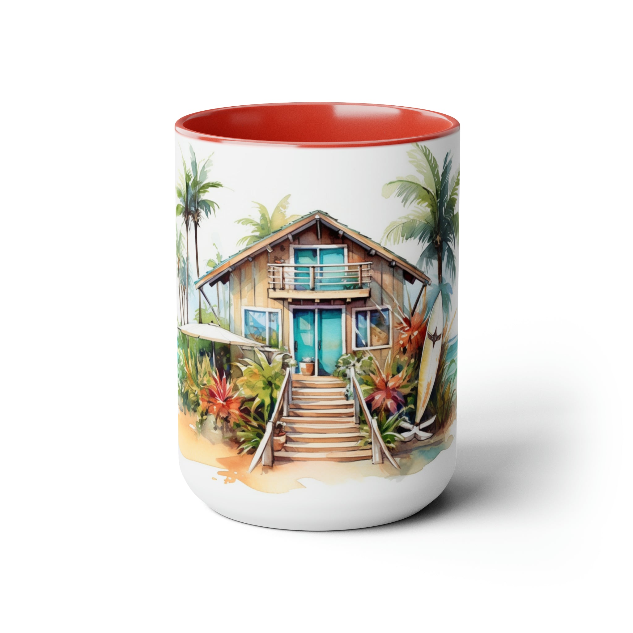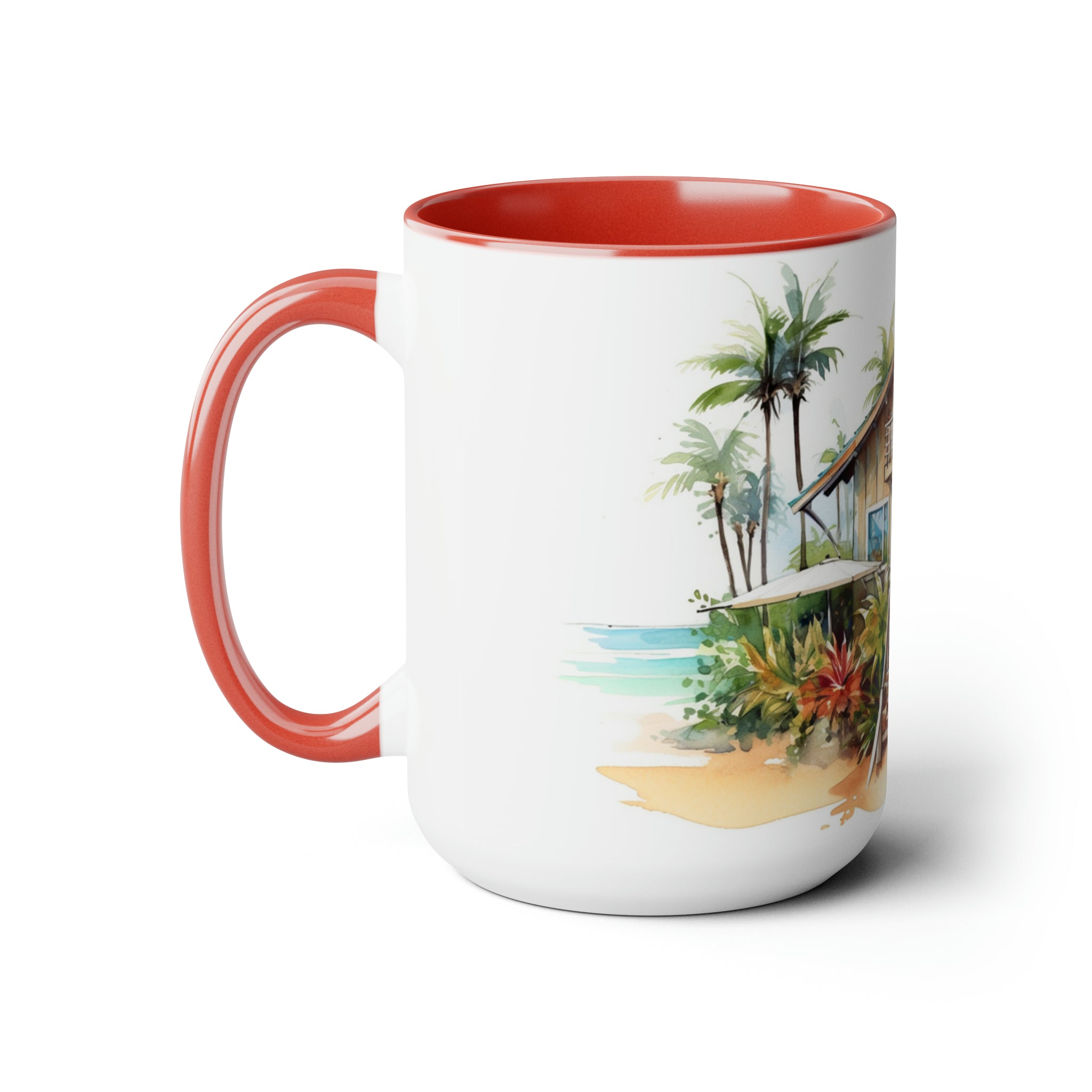 Add a splash of color to your morning coffee or tea ritual! Bring the beauty of Maui's Hawaiian tropical paradise into your everyday life with our 15oz Ceramic Mug. This stunning piece of art features a breathtaking watercolor image of a picturesque Hawaiian bungalow perched over crystal-clear turquoise waters. These ceramic mugs also have a colorful rim, handle, and inside, so the mug is bound to spice up your mug rack.