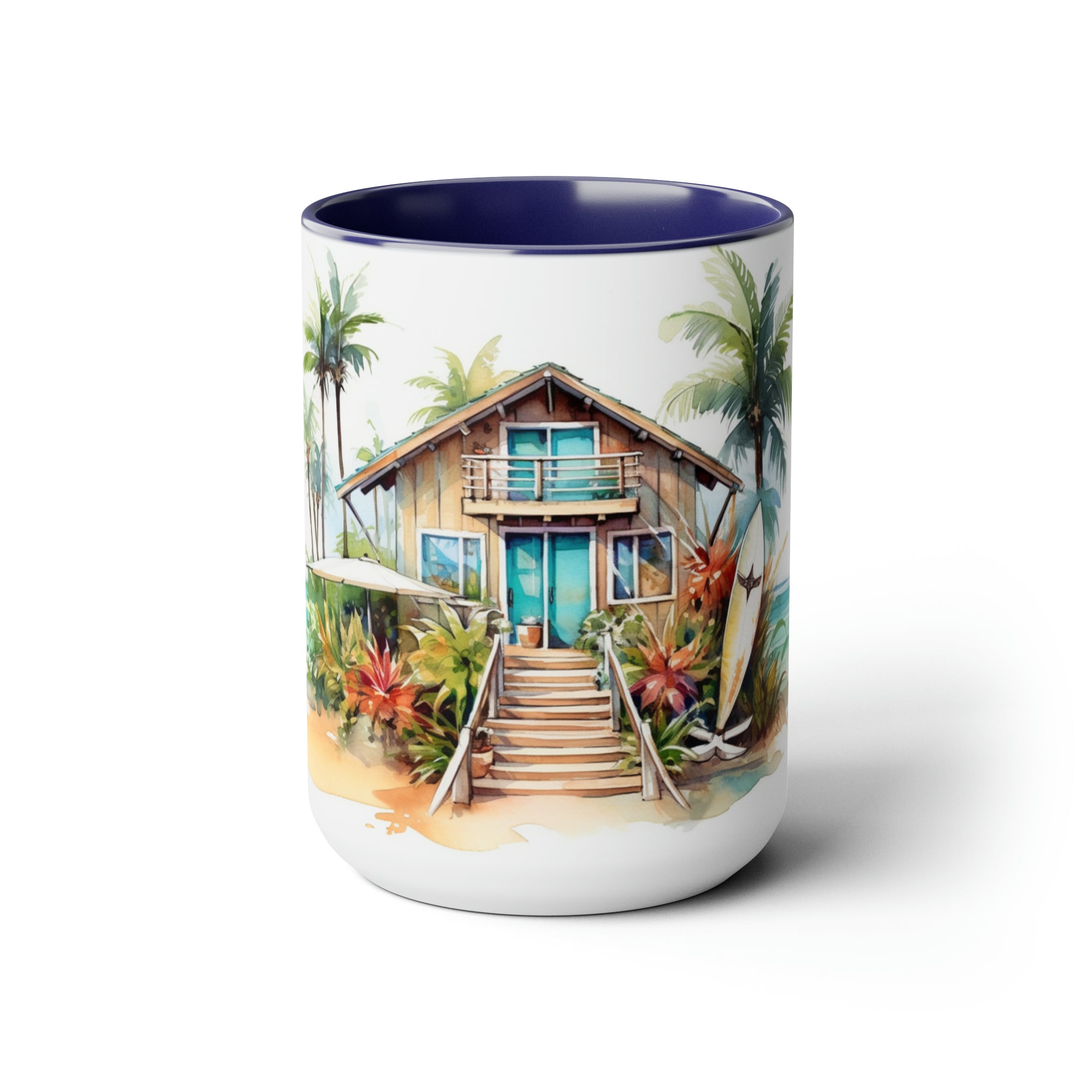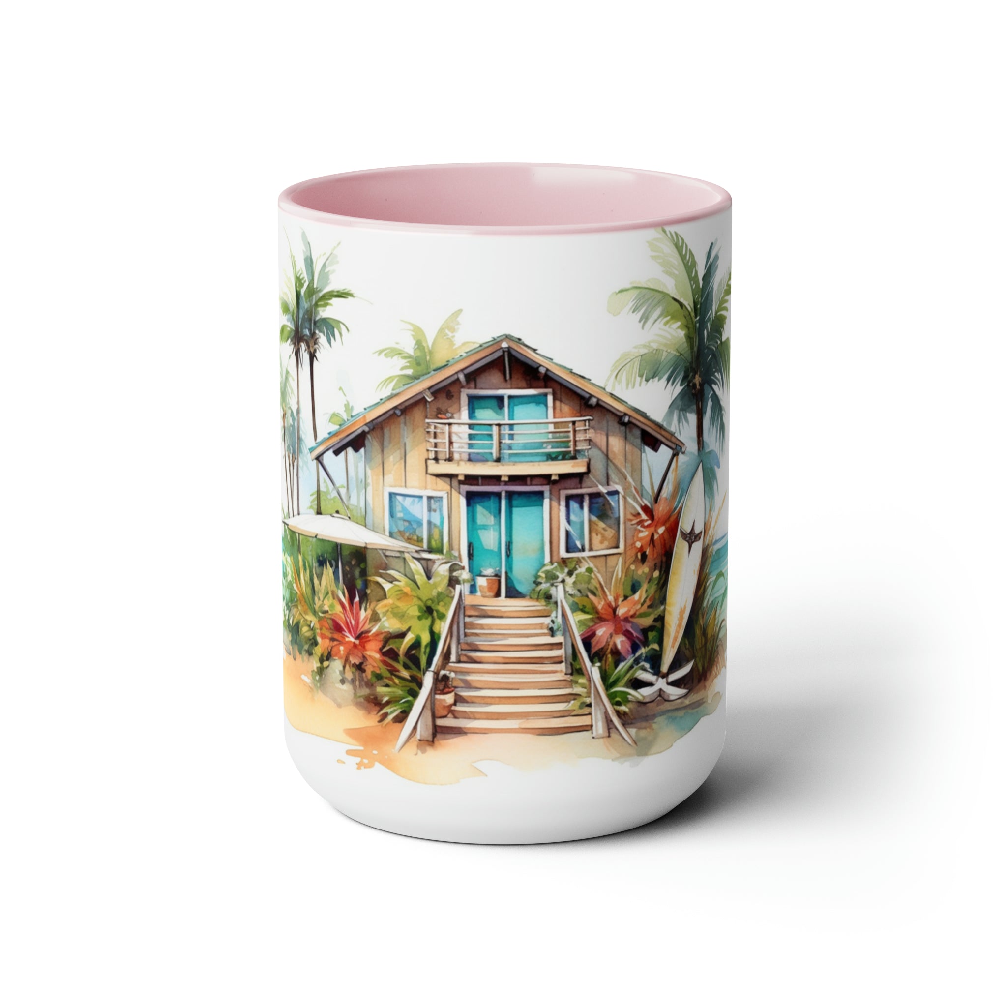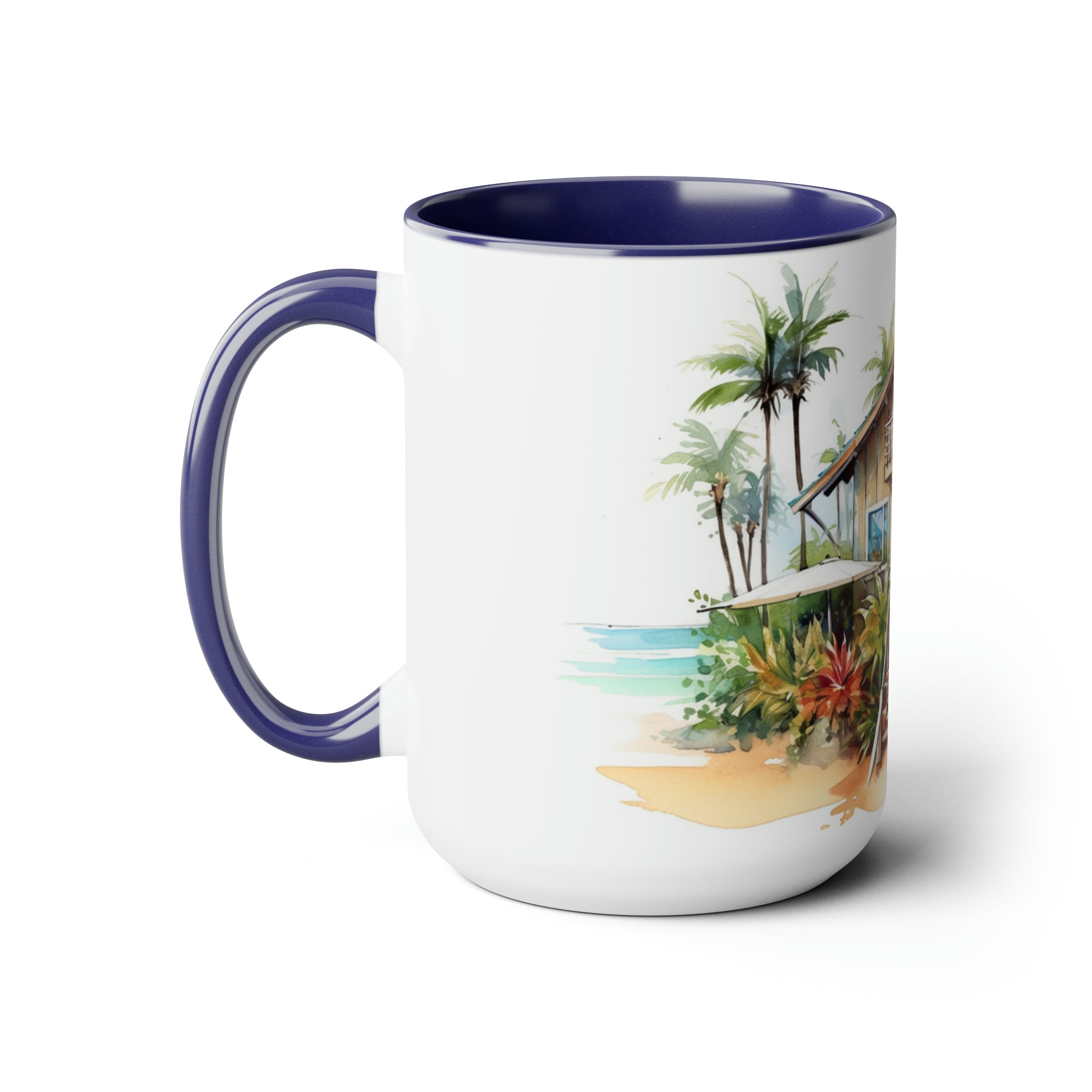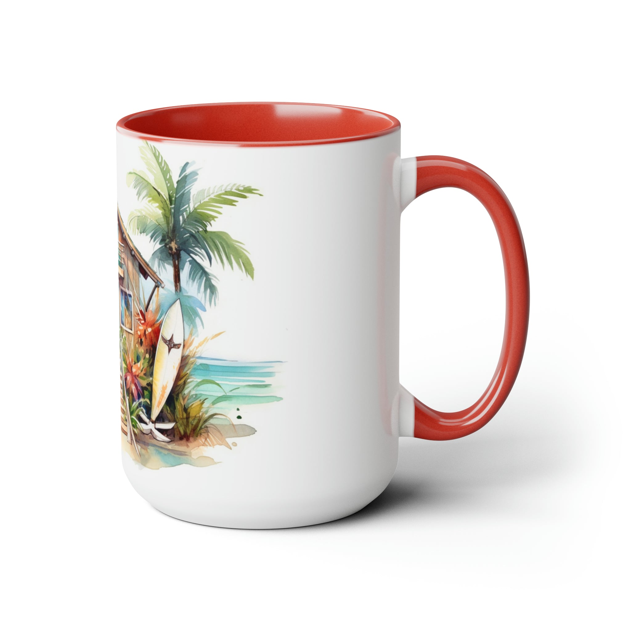 Add a splash of color to your morning coffee or tea ritual! Bring the beauty of Maui's Hawaiian tropical paradise into your everyday life with our 15oz Ceramic Mug. This stunning piece of art features a breathtaking watercolor image of a picturesque Hawaiian bungalow perched over crystal-clear turquoise waters. These ceramic mugs also have a colorful rim, handle, and inside, so the mug is bound to spice up your mug rack.