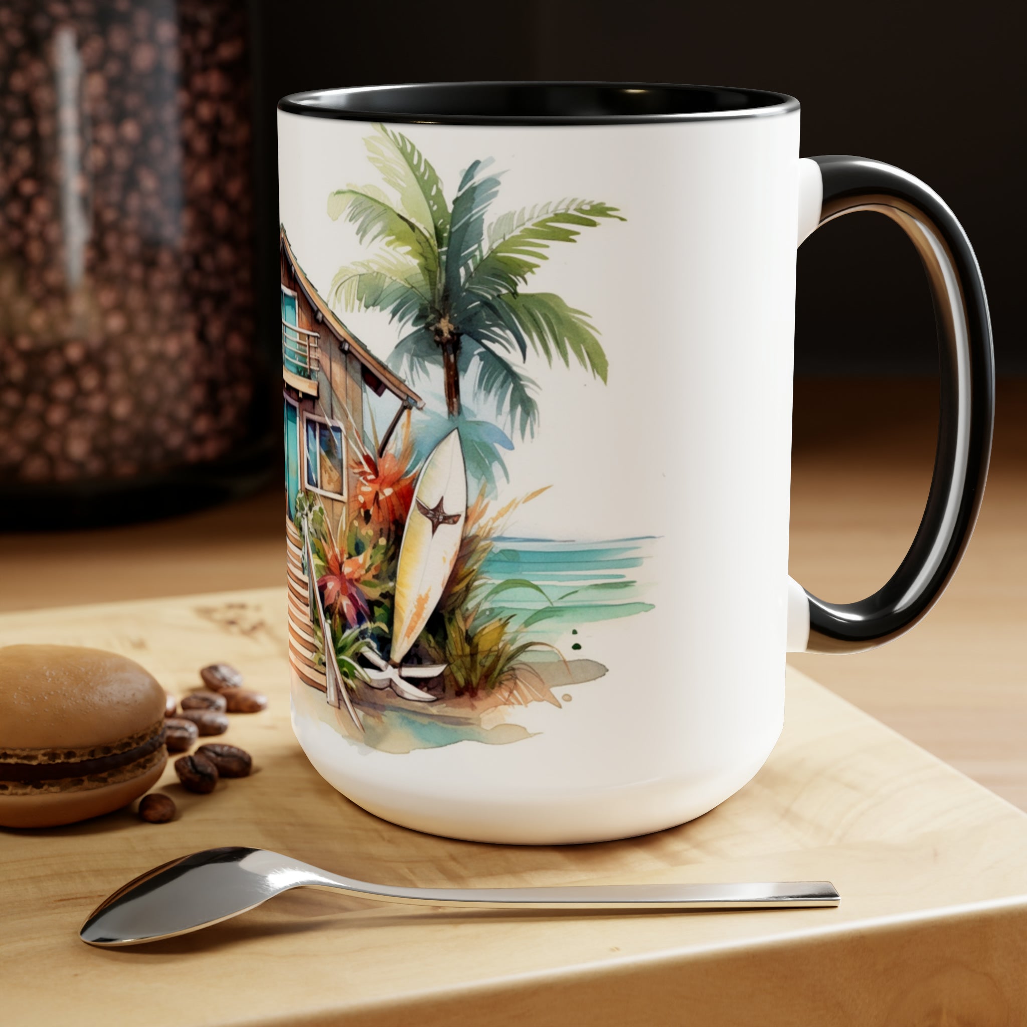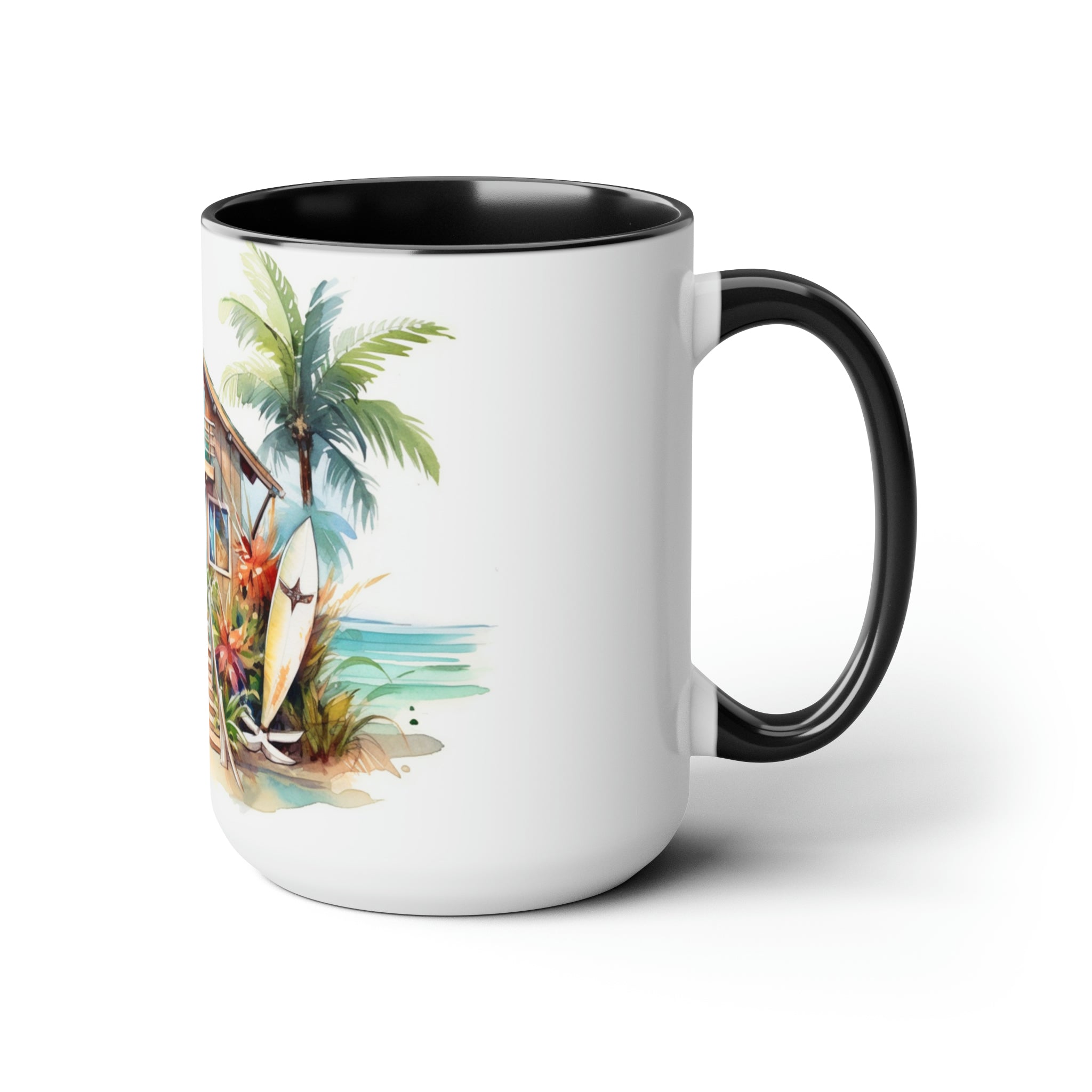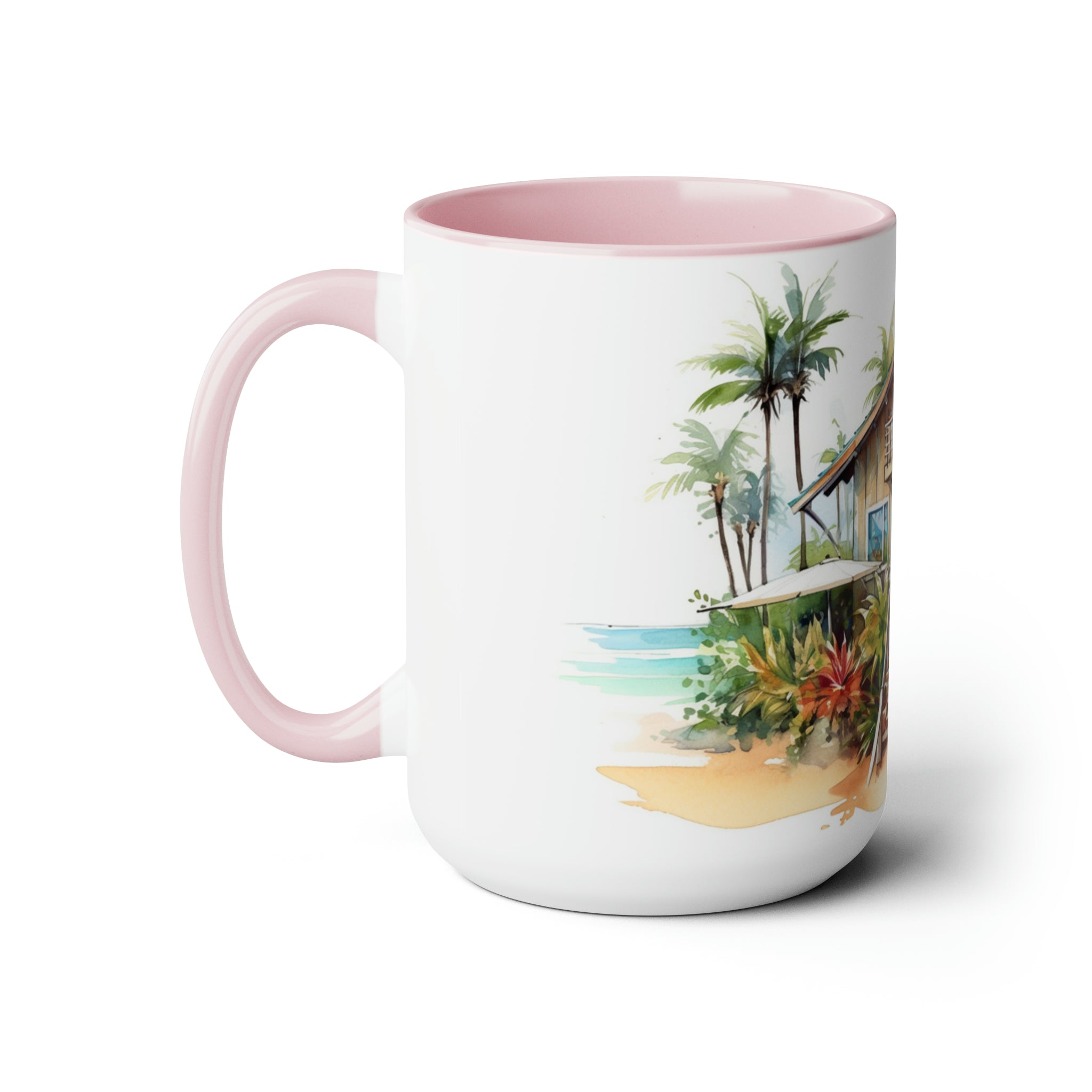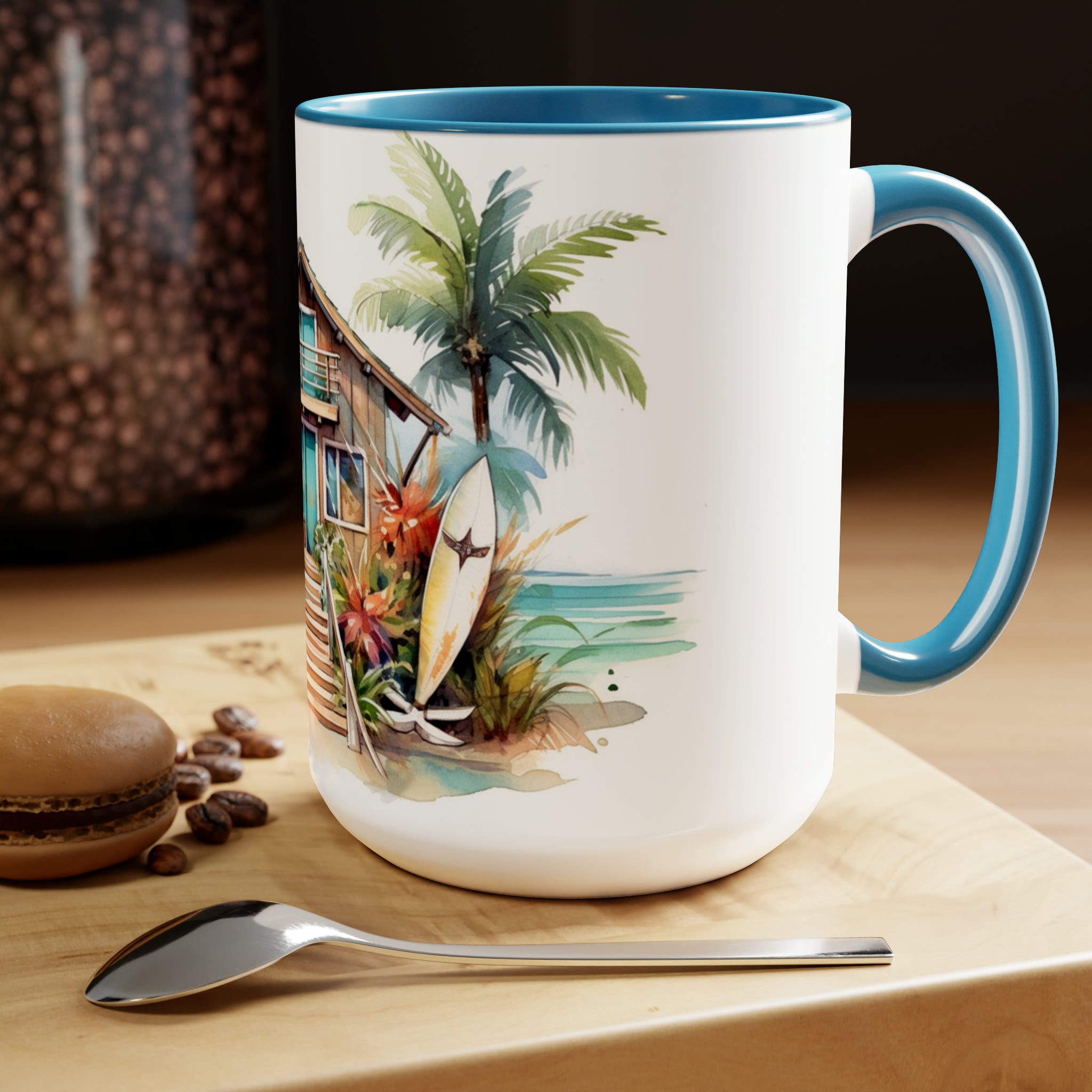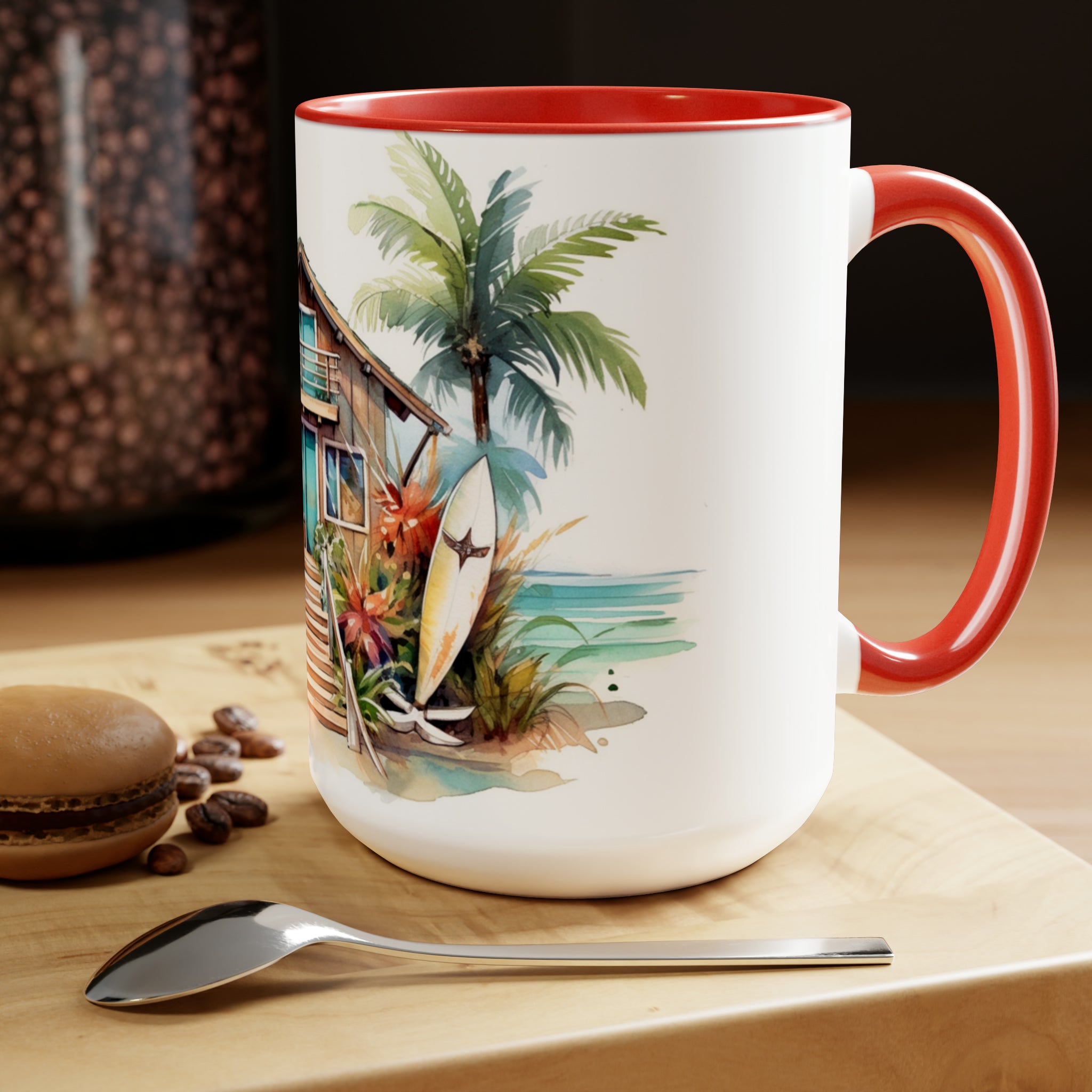 Add a splash of color to your morning coffee or tea ritual! Bring the beauty of Maui's Hawaiian tropical paradise into your everyday life with our 15oz Ceramic Mug. This stunning piece of art features a breathtaking watercolor image of a picturesque Hawaiian bungalow perched over crystal-clear turquoise waters. These ceramic mugs also have a colorful rim, handle, and inside, so the mug is bound to spice up your mug rack.
