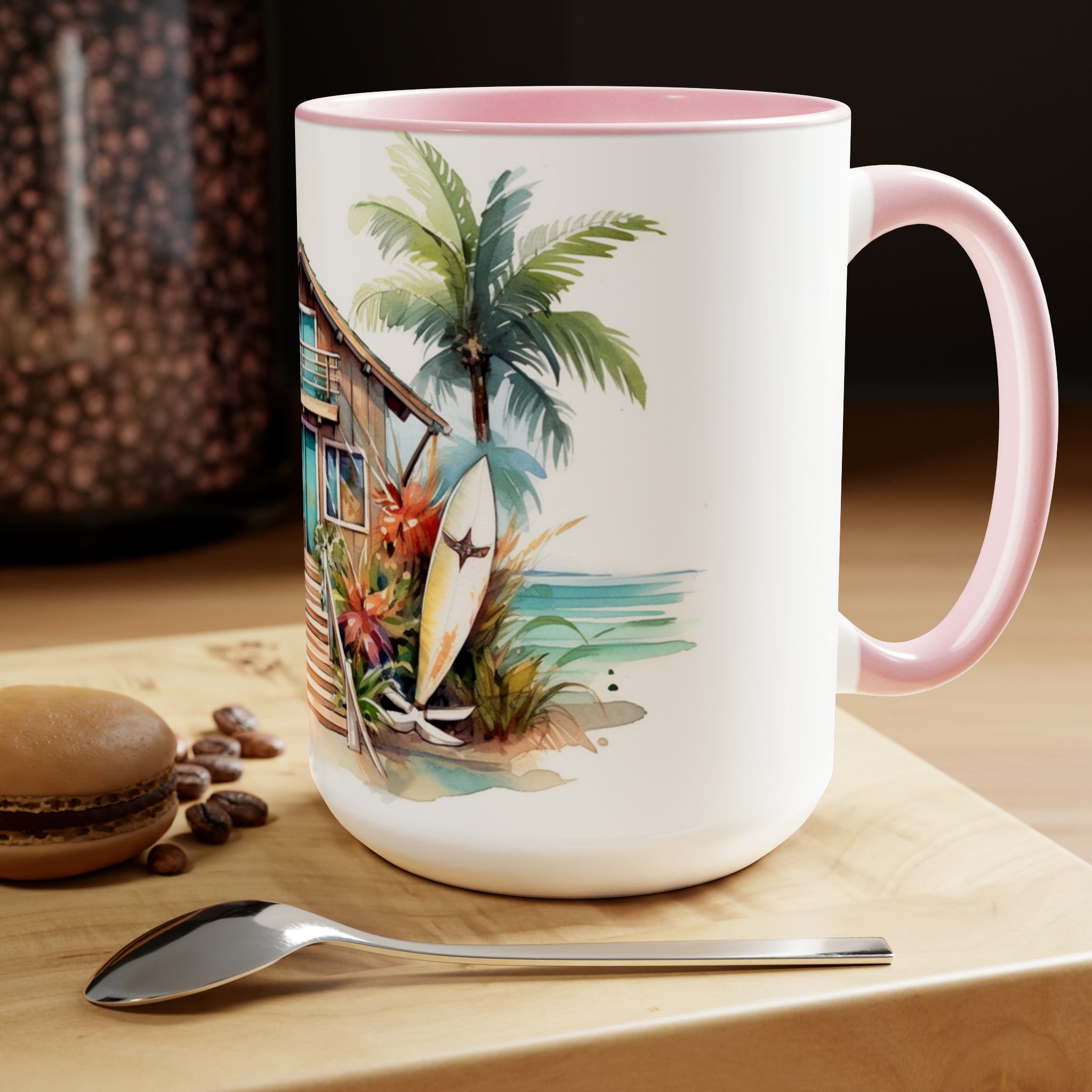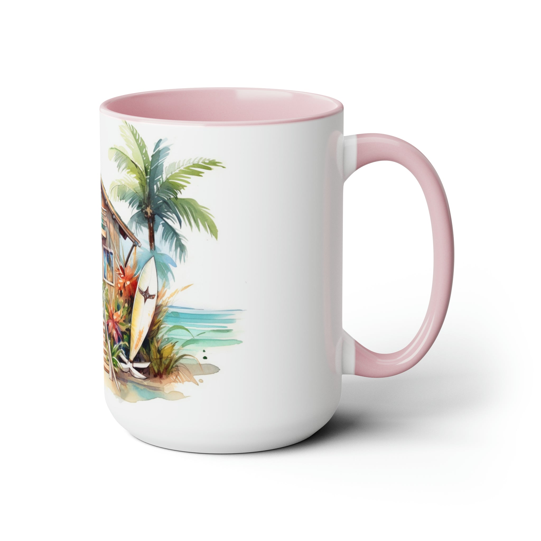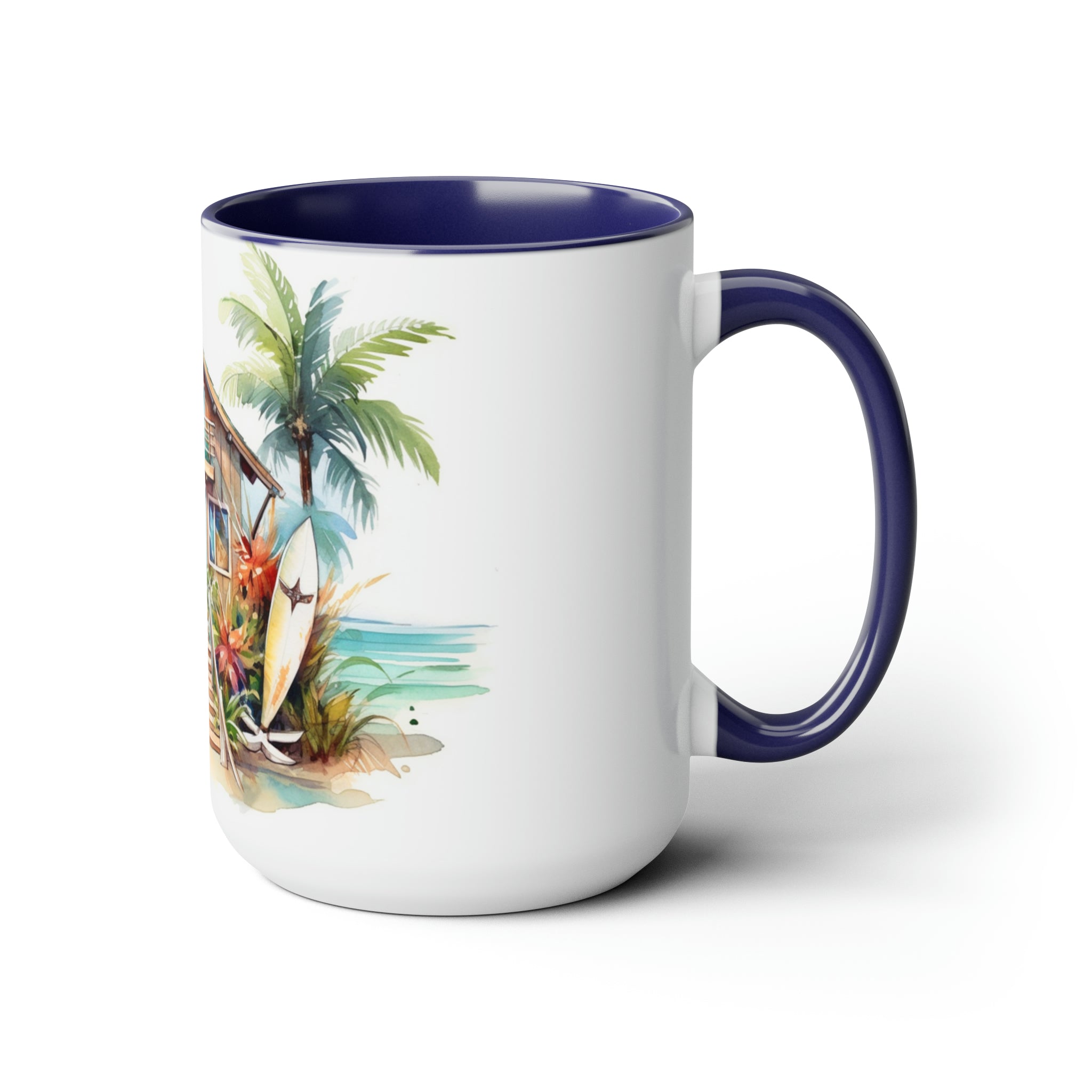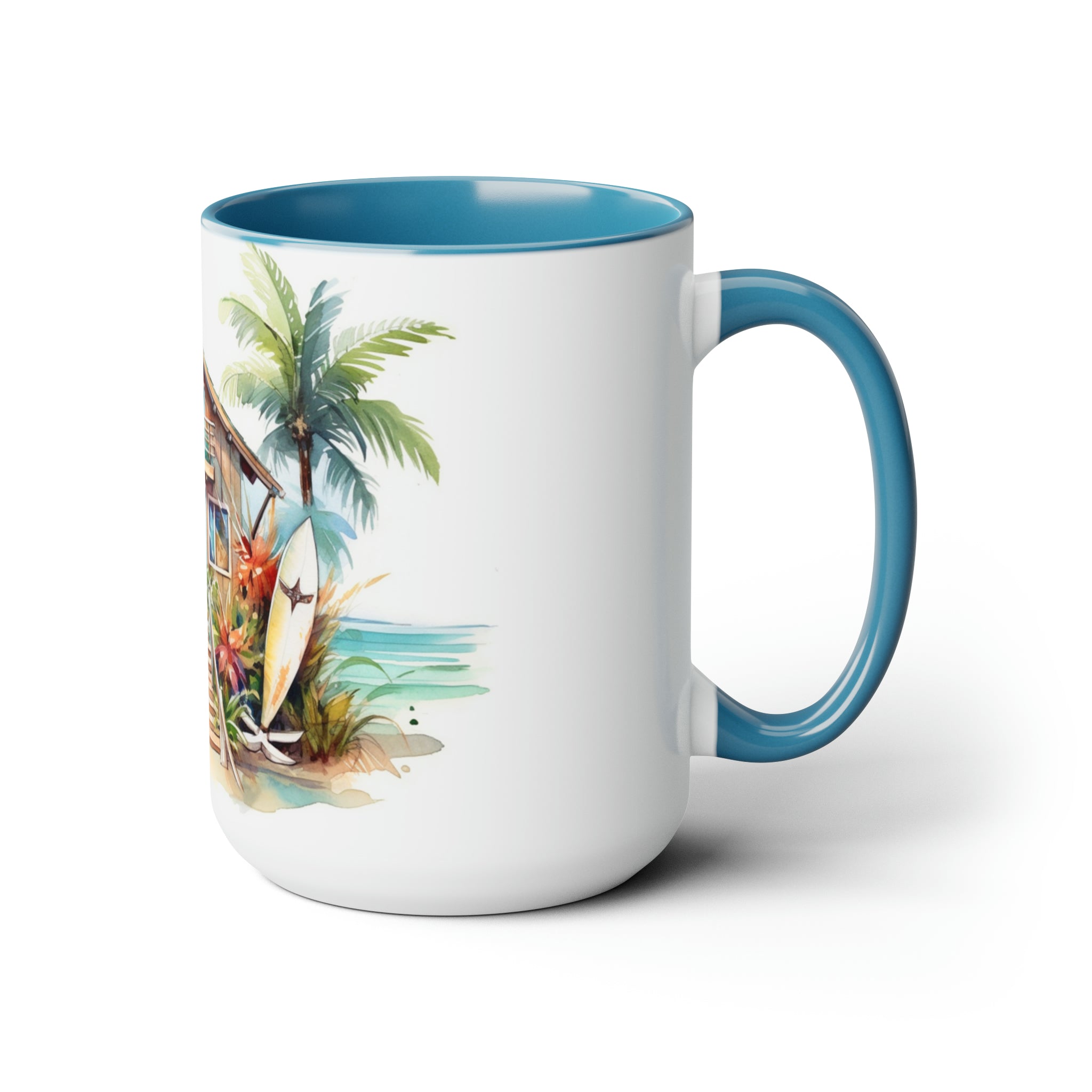 Add a splash of color to your morning coffee or tea ritual! Bring the beauty of Maui's Hawaiian tropical paradise into your everyday life with our 15oz Ceramic Mug. This stunning piece of art features a breathtaking watercolor image of a picturesque Hawaiian bungalow perched over crystal-clear turquoise waters. These ceramic mugs also have a colorful rim, handle, and inside, so the mug is bound to spice up your mug rack.