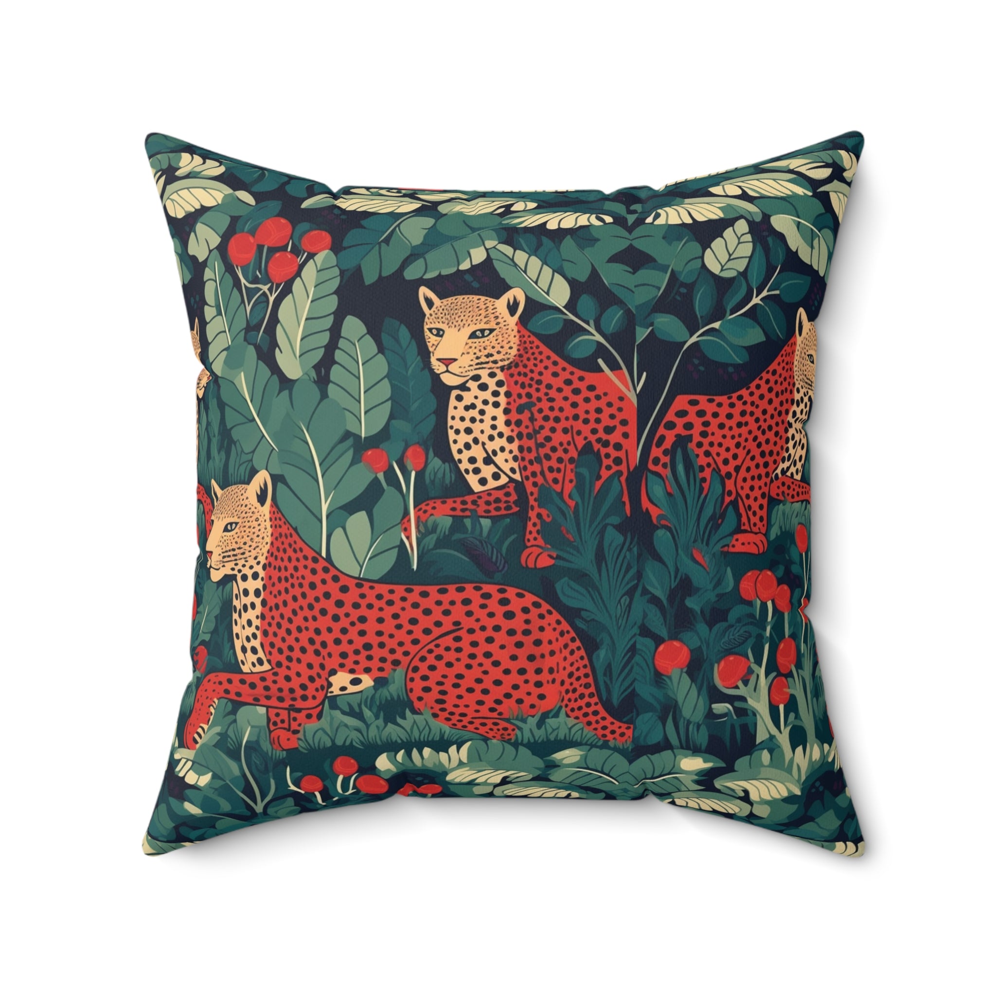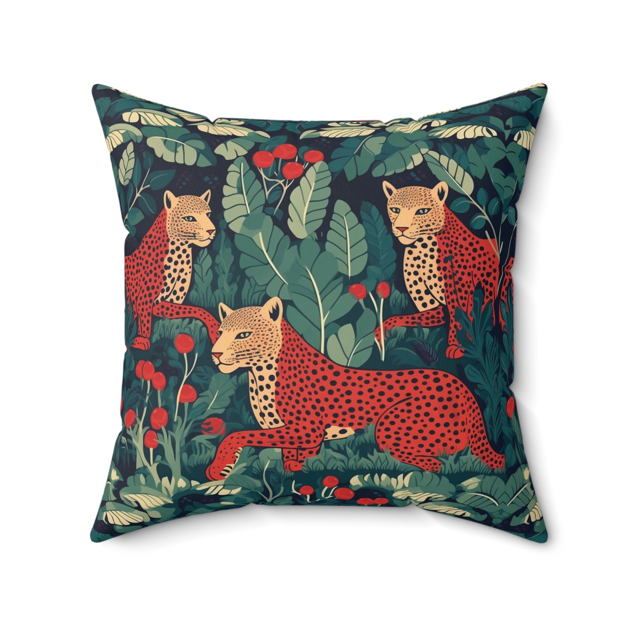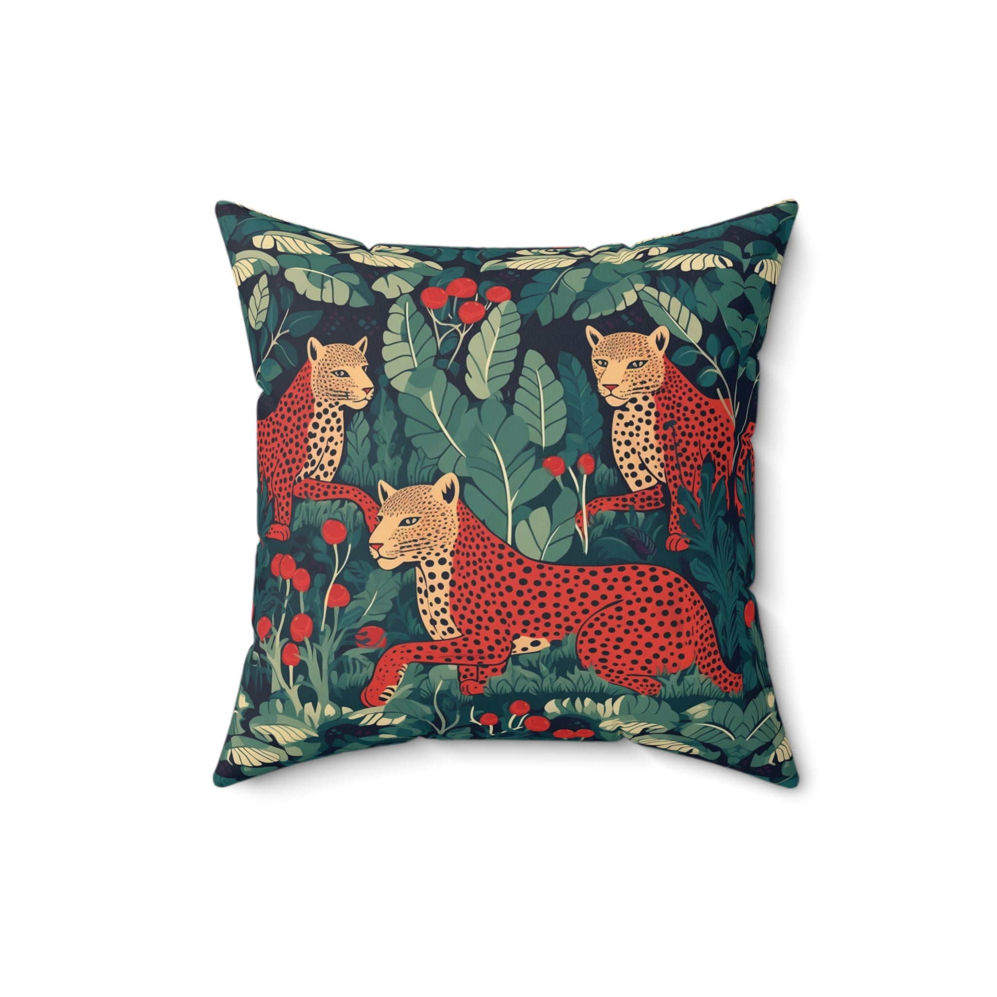 Introducing the "Leopard Love" Decorative Pillow from our captivating wildlife series, "The Highland Haven." This stunning pattern design transports you to the heart of the thick, where three majestic leopards roam amidst deep greens and rich browns.