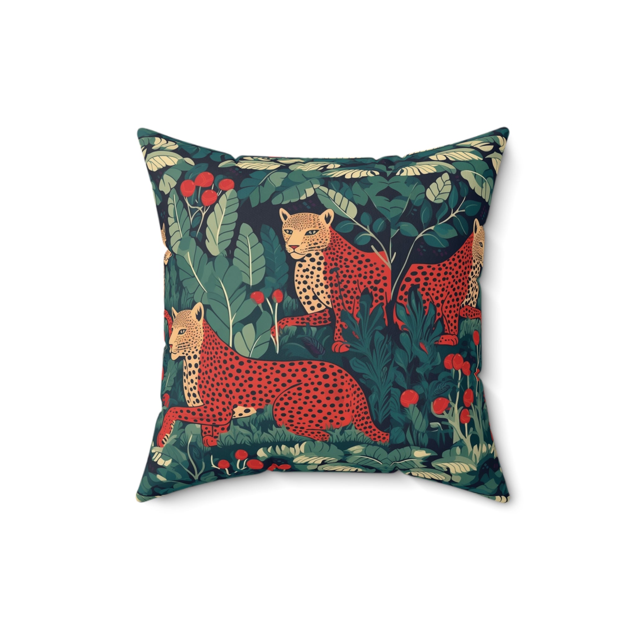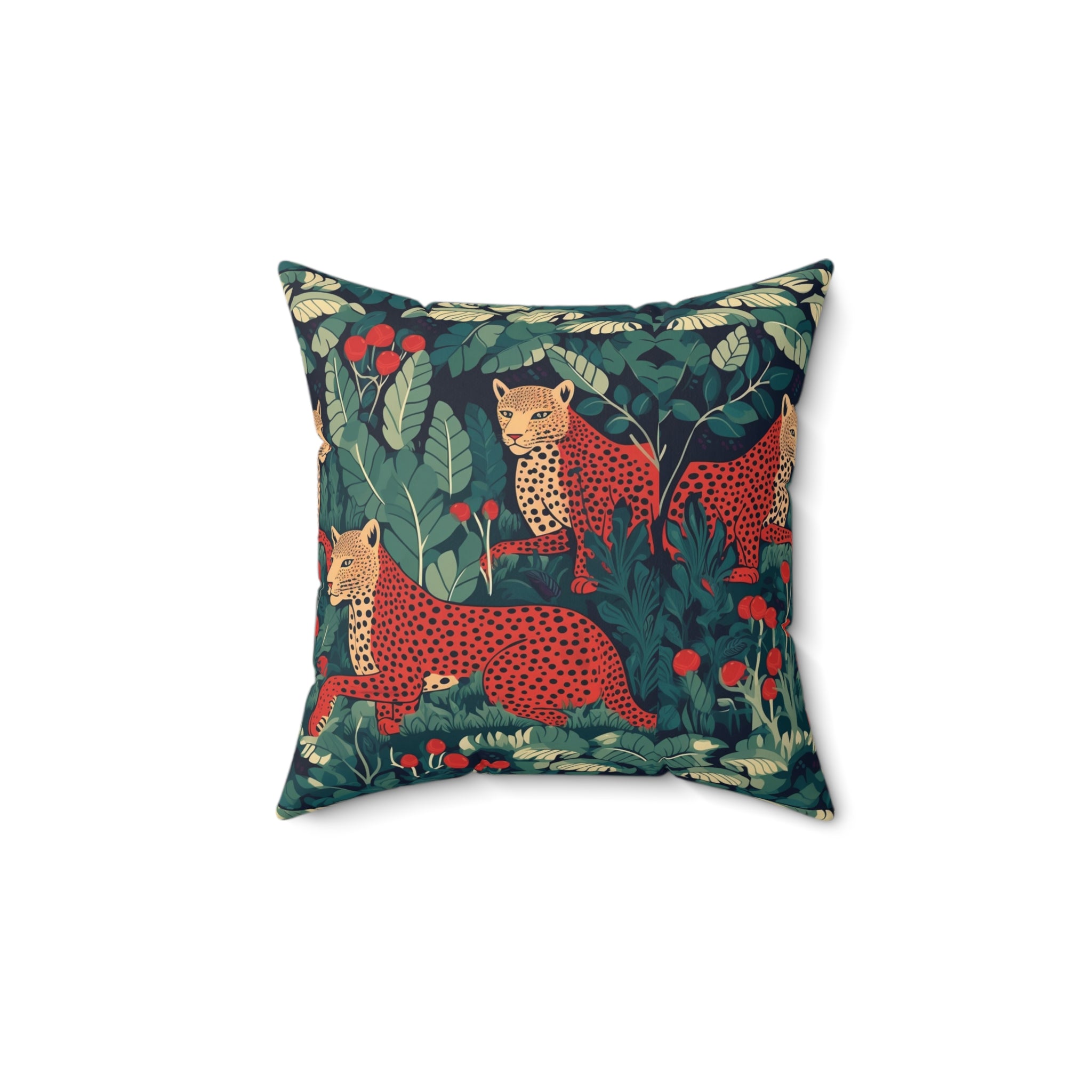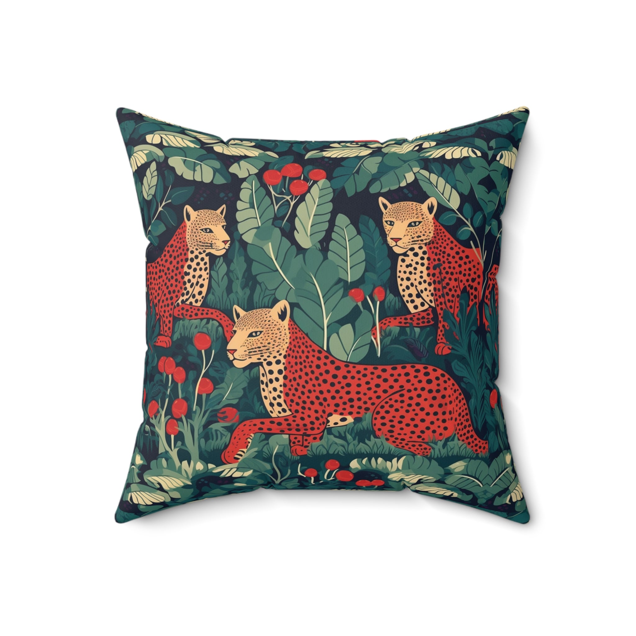 Introducing the "Leopard Love" Decorative Pillow from our captivating wildlife series, "The Highland Haven." This stunning pattern design transports you to the heart of the thick, where three majestic leopards roam amidst deep greens and rich browns.