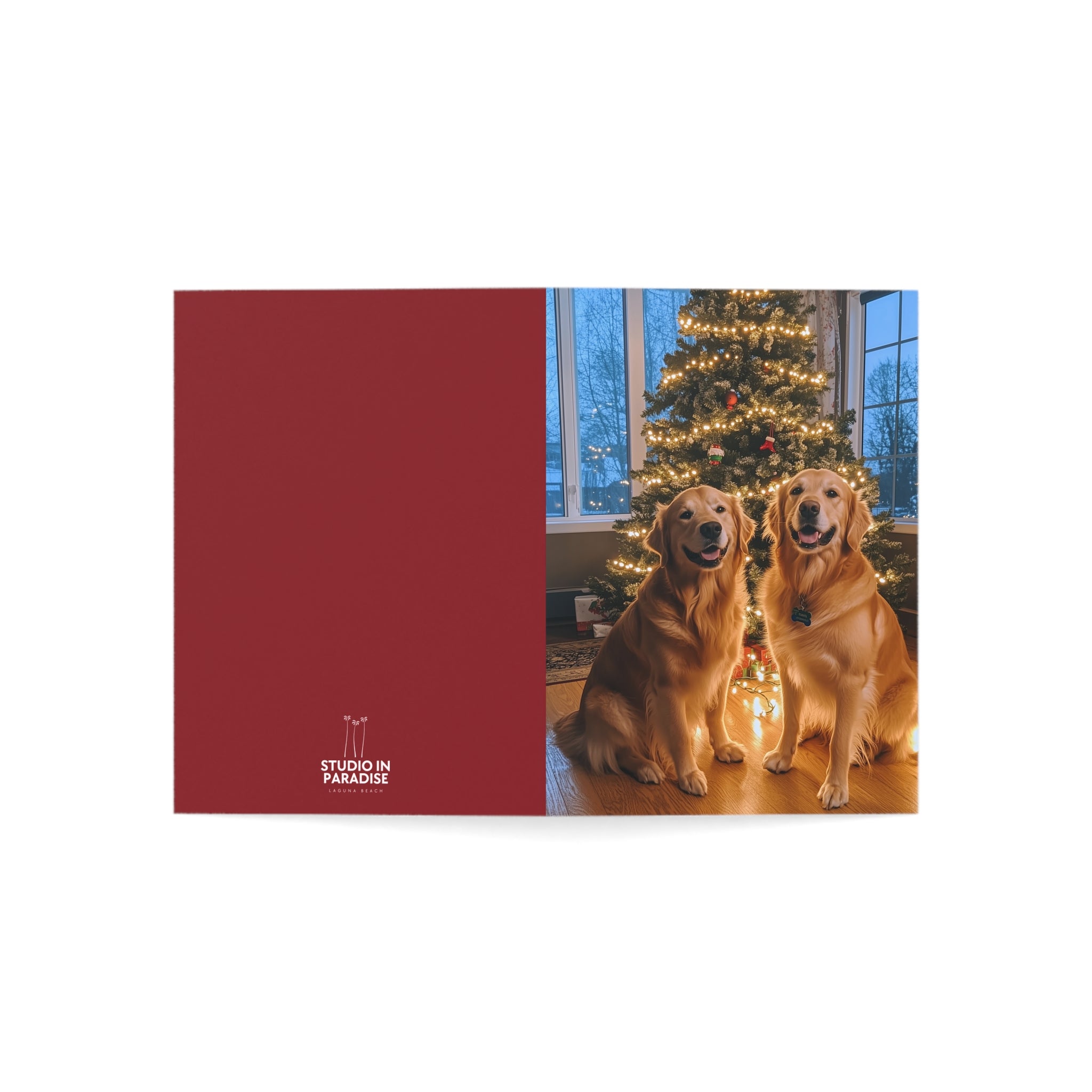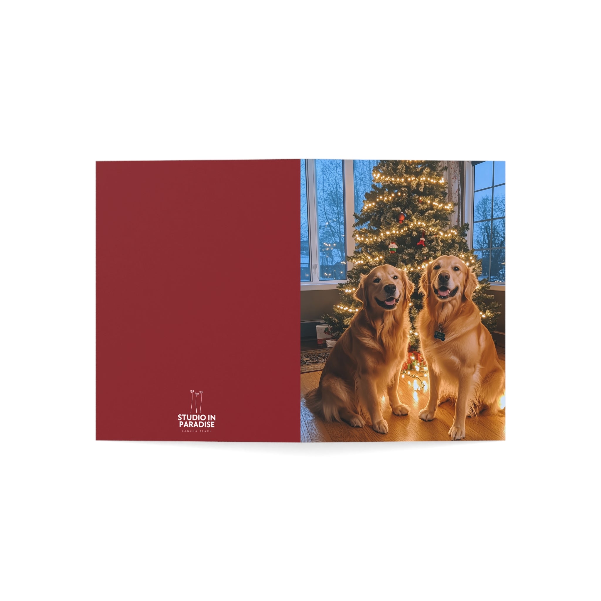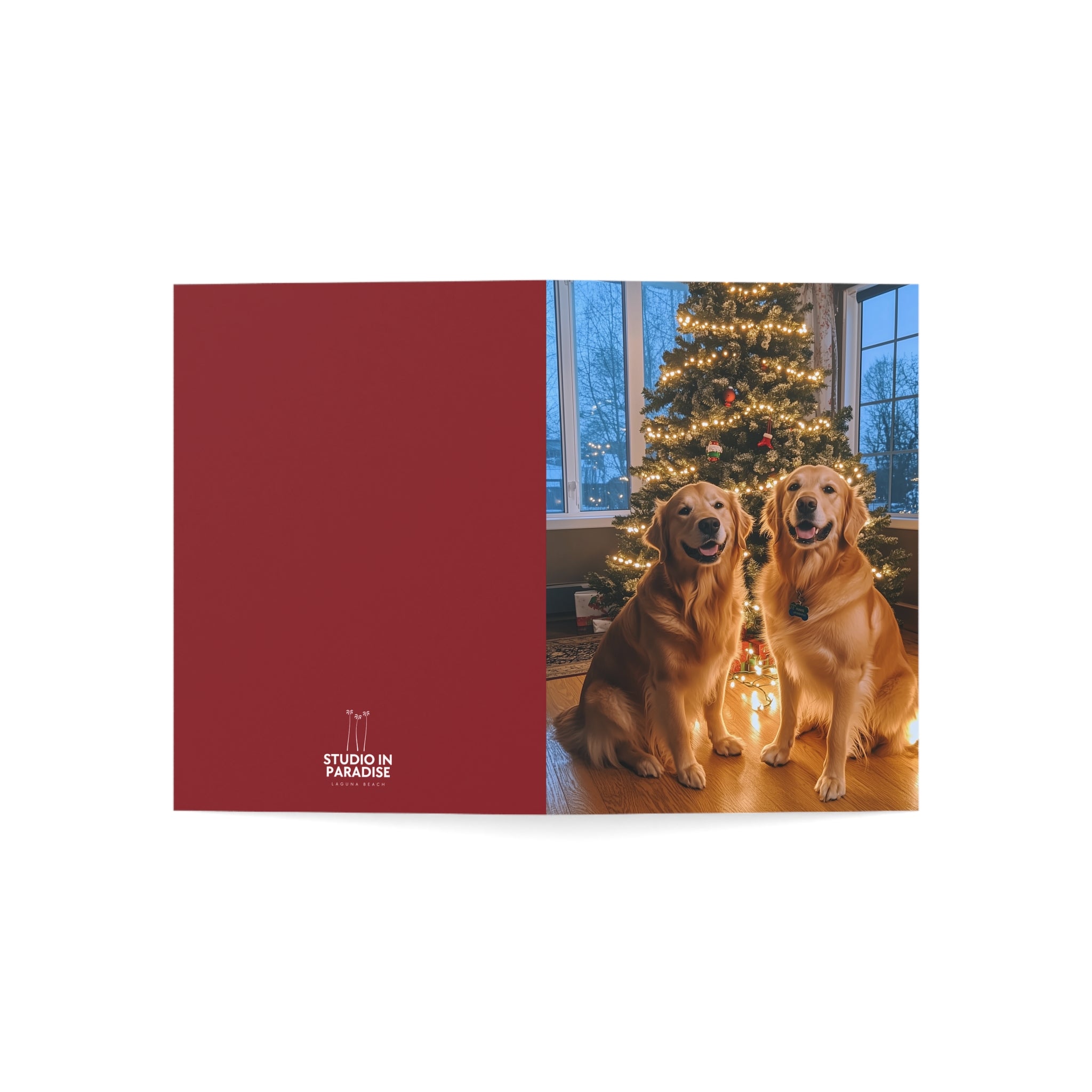 Celebrate the season with our "Powder Paws Collection" – a charming selection of holiday greeting cards featuring adorable dogs and puppies in festive winter scenes. From playful Golden Retriever puppies to cozy canines enjoying snowy landscapes, each card captures the warmth and joy of the holidays. Our Furever Festive Golden Retrievers Christmas Card stands out in this collection, capturing two adorable Golden Retrievers happily posing in front of their beautiful Christmas tree, making it the perfect way to send heartfelt holiday wishes.