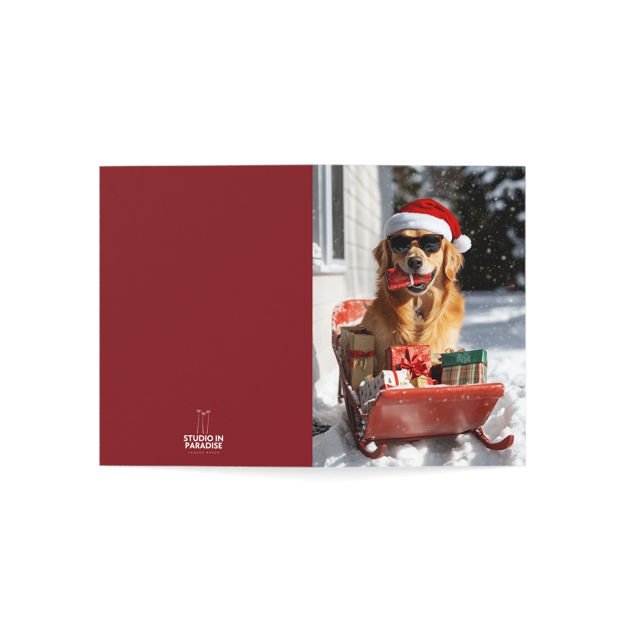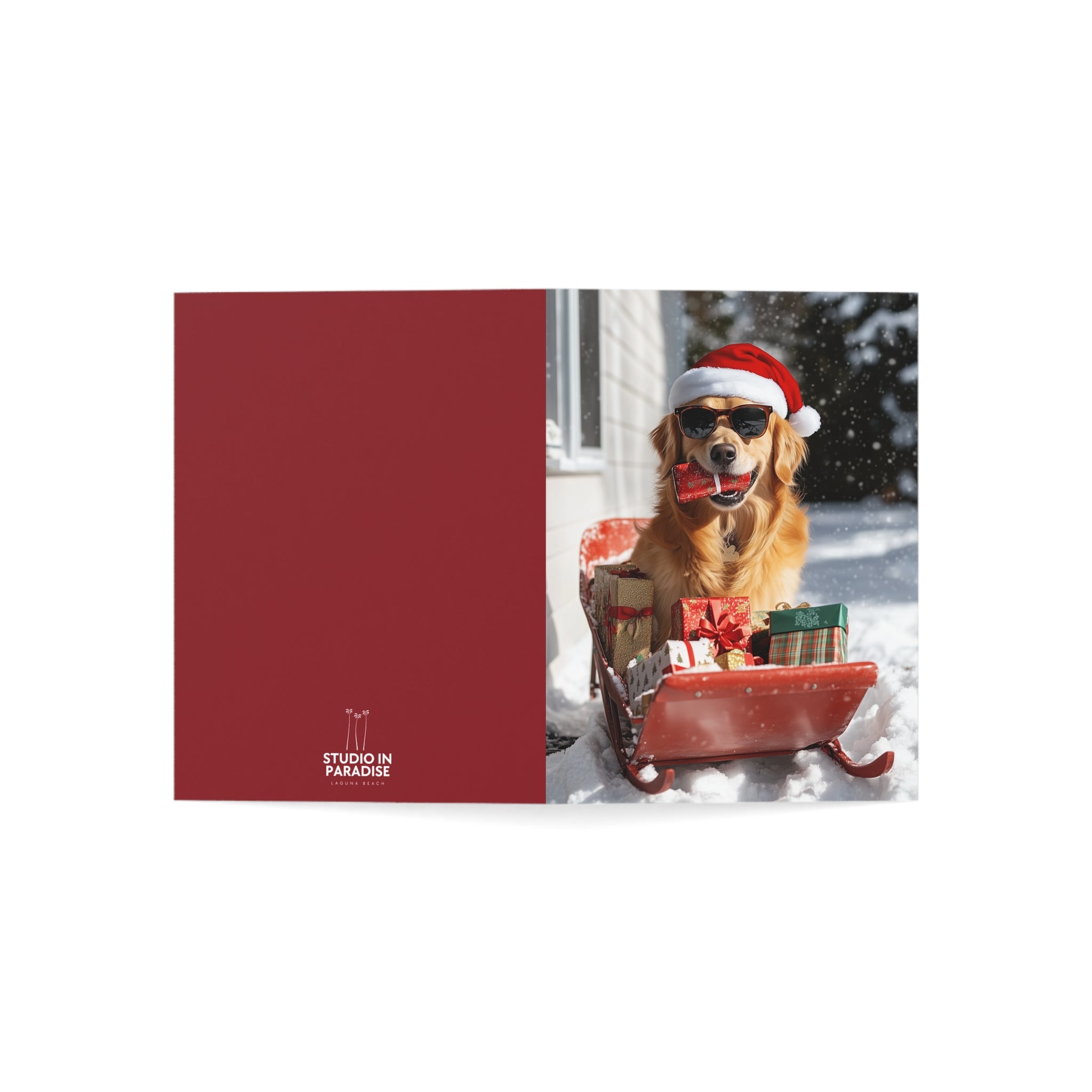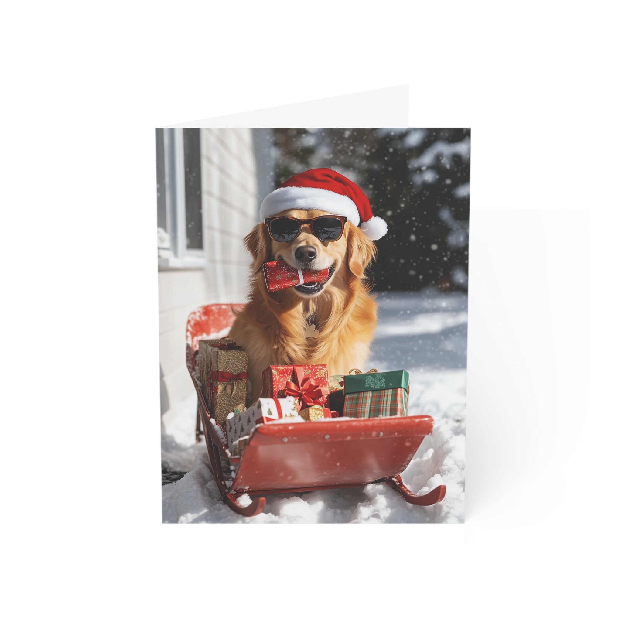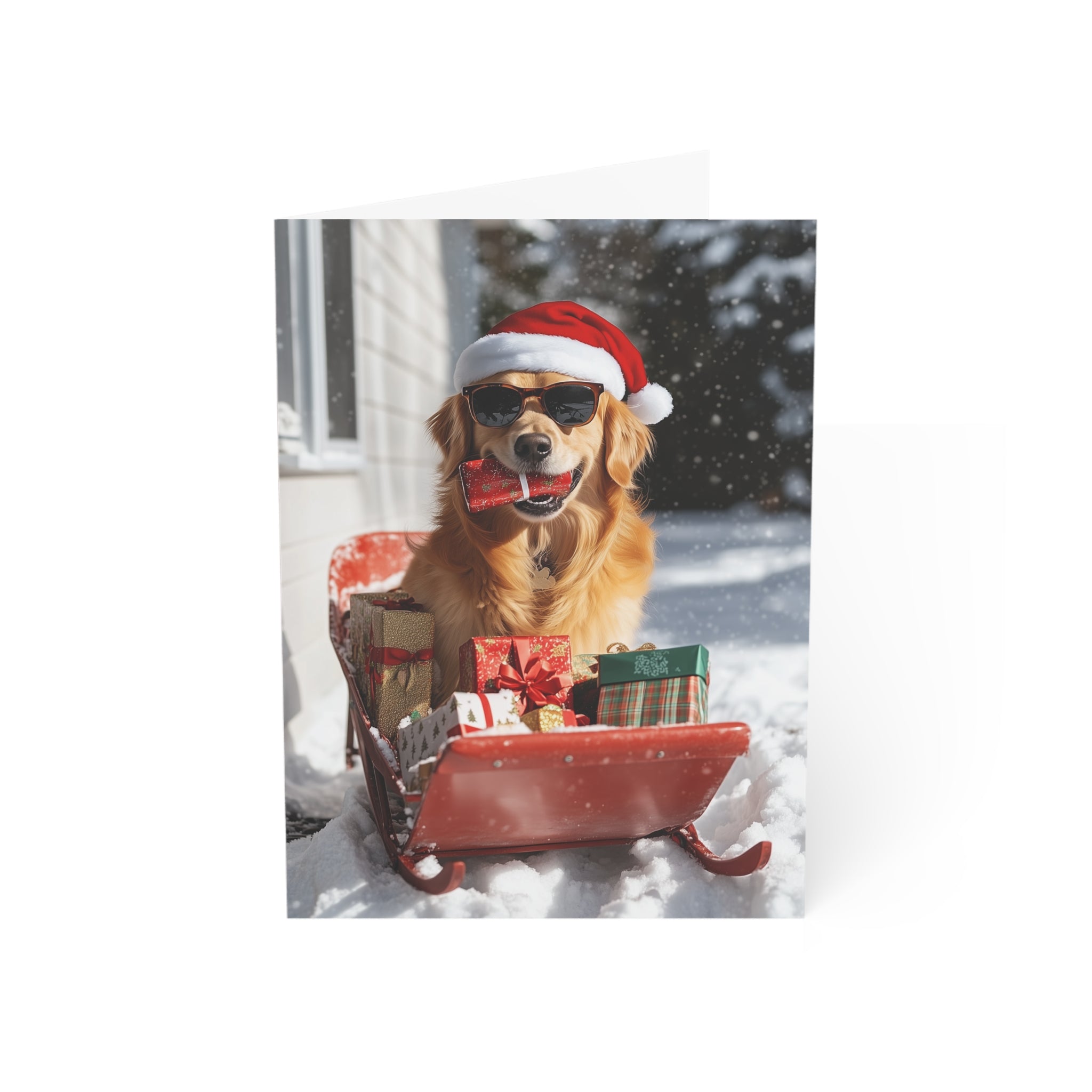 Celebrate the season with our "Powder Paws Collection" – a charming selection of holiday greeting cards featuring adorable dogs and puppies in festive winter scenes. From playful Golden Retriever puppies to cozy canines enjoying snowy landscapes, each card captures the warmth and joy of the holidays. Our Golden Retriever in Santa's Sleigh Christmas Card is a standout in this collection, capturing a super cute Golden Retreiver in sunglasses with a santa hat on, delivering gifts from in a sleigh!