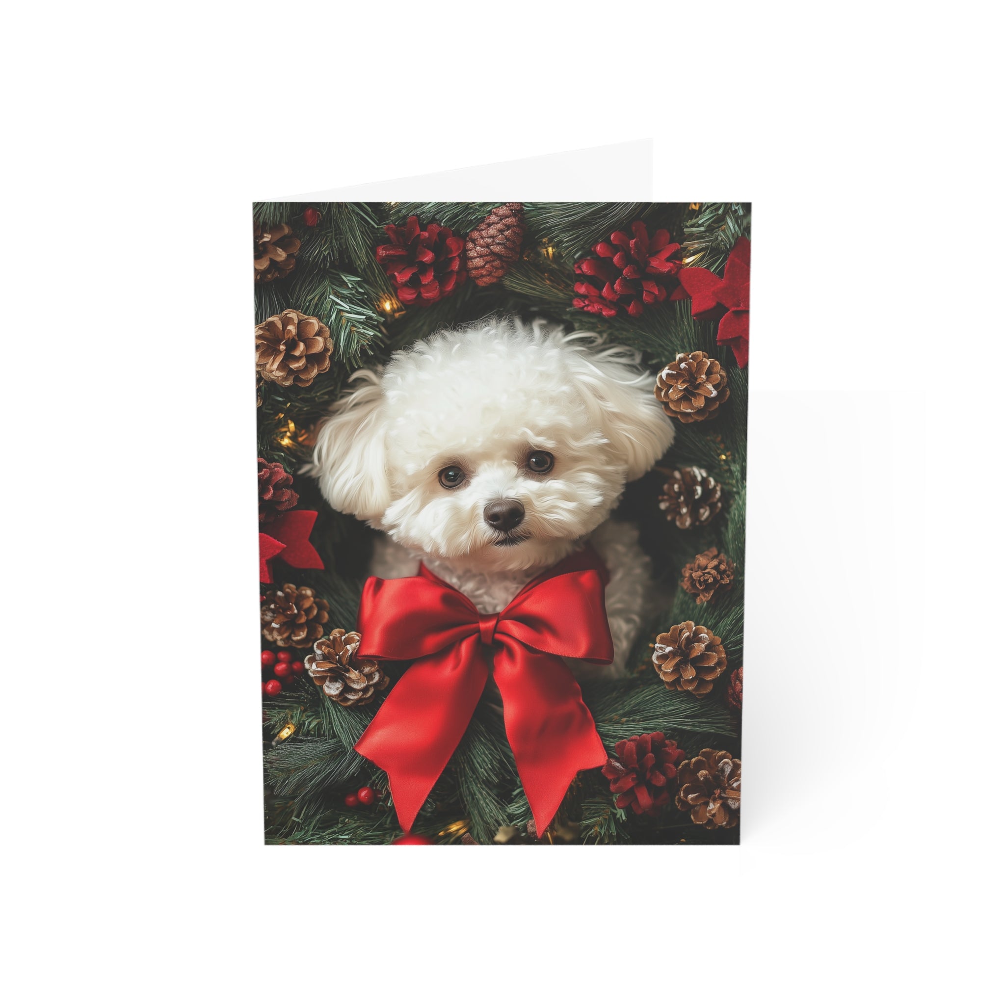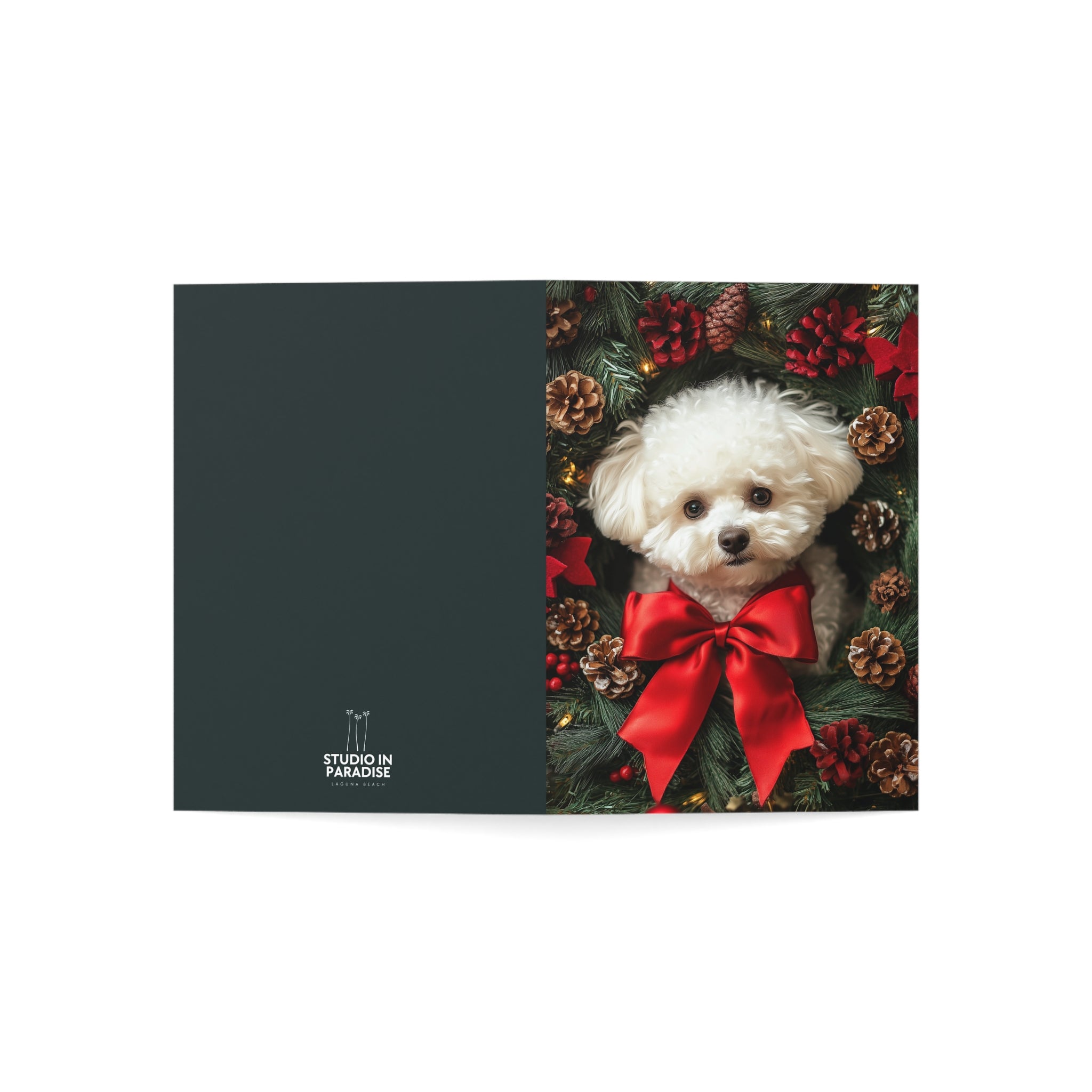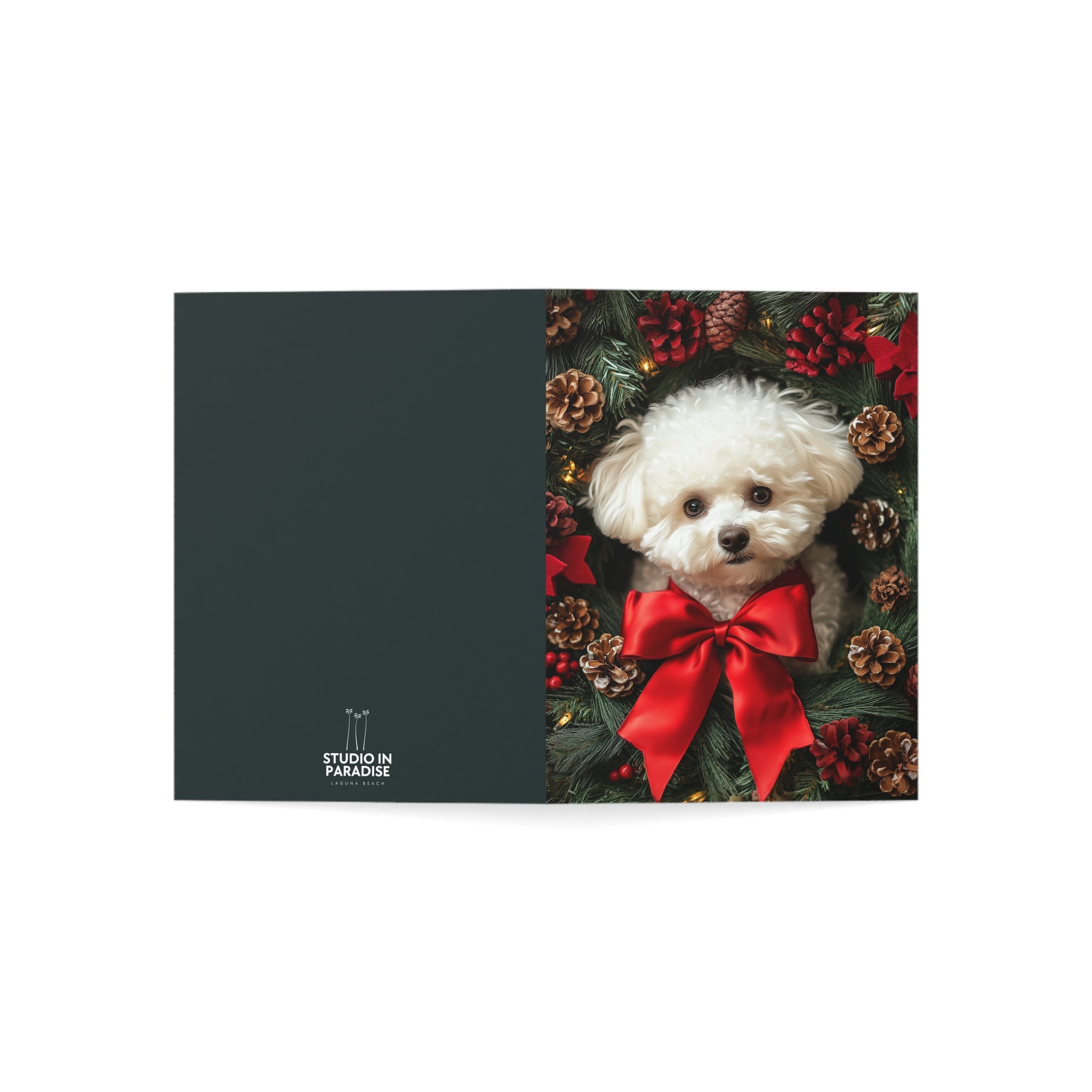 Small dogs need love too!!! Celebrate the season with our "Powder Paws Collection" – a charming selection of holiday greeting cards featuring adorable dogs and puppies in festive winter scenes. From playful Golden Retriever puppies to cozy canines enjoying snowy landscapes, each card captures the warmth and joy of the holidays. Our Maltese Puppy Wreath Greeting Card is a standout in this collection, capturing the sweetest Maltese puppy surrounded by a Christmas wreath, making it the perfect way to send heartfelt holiday wishes.