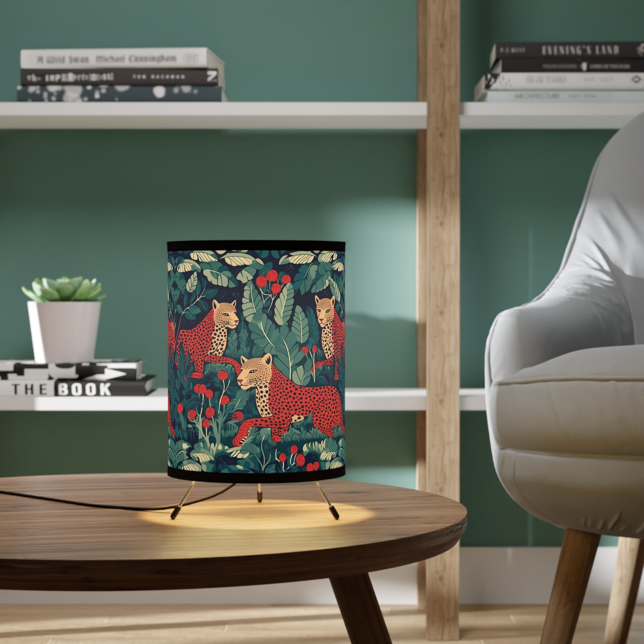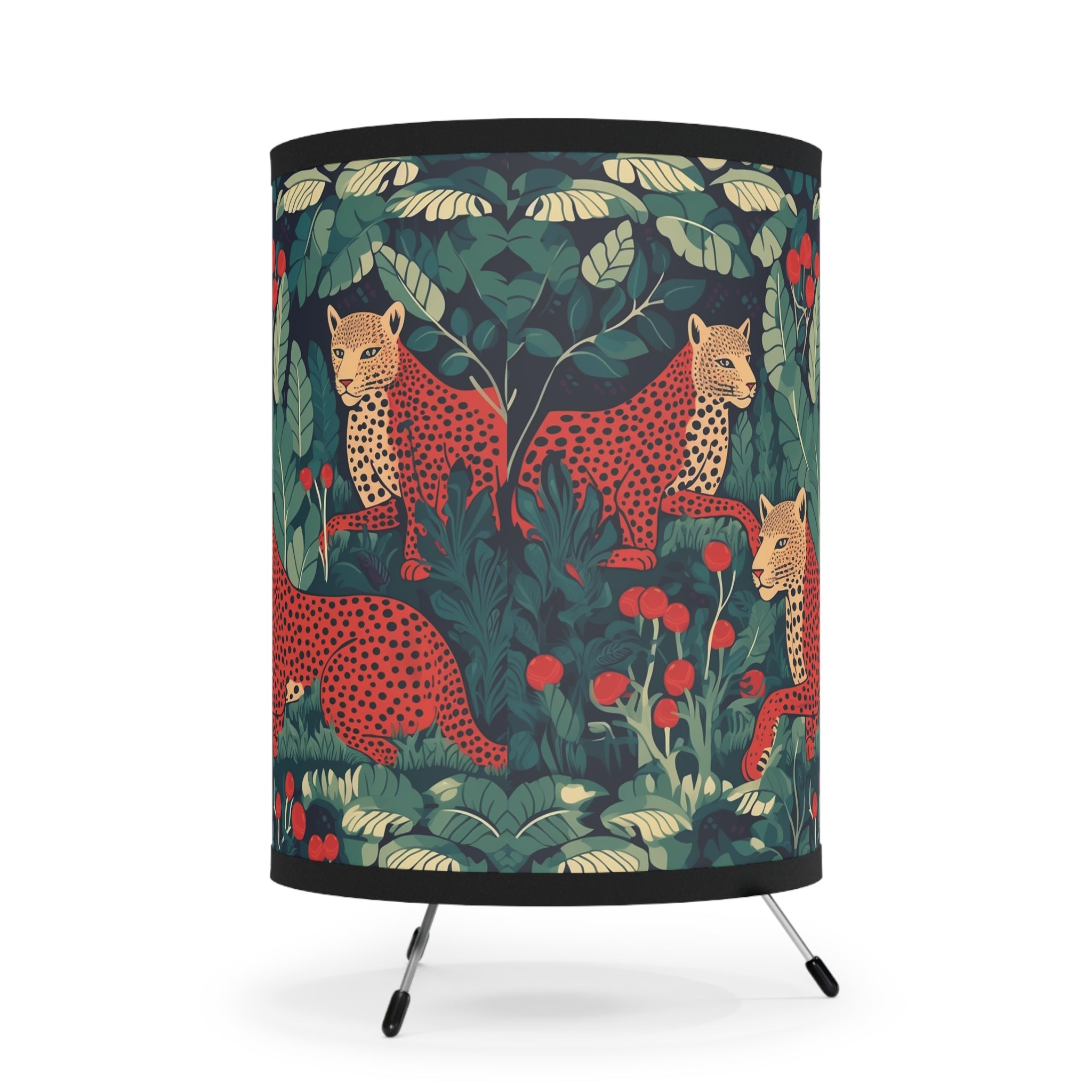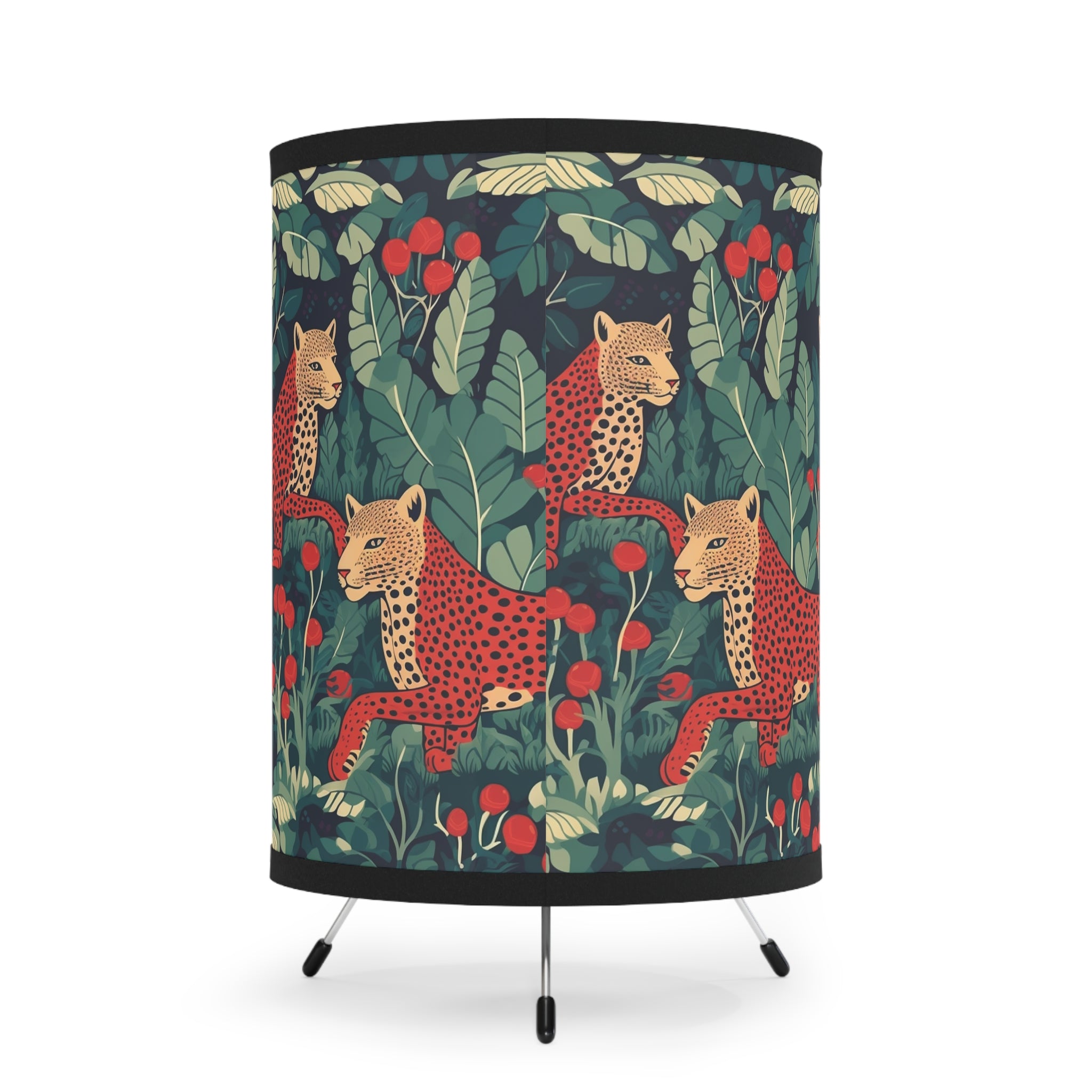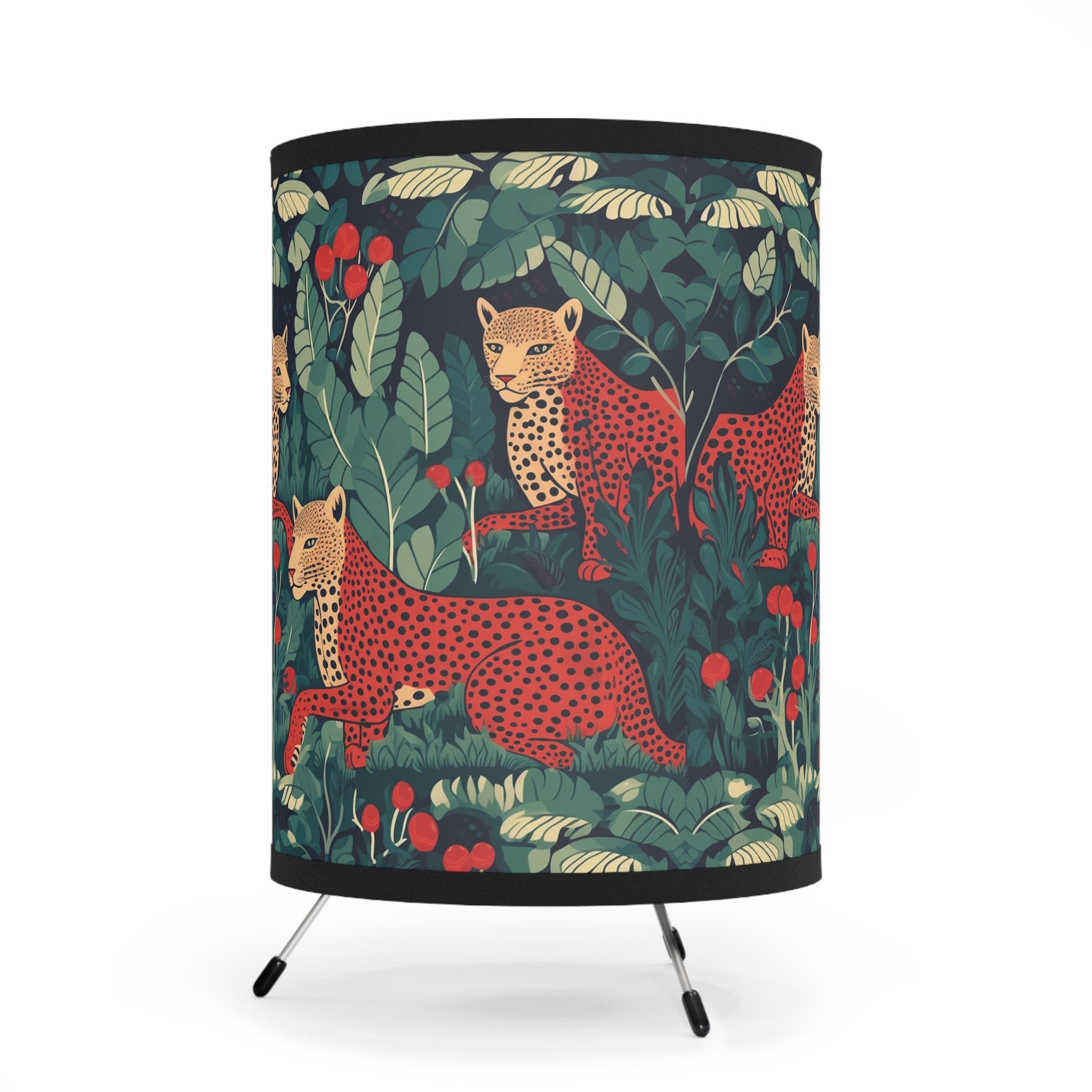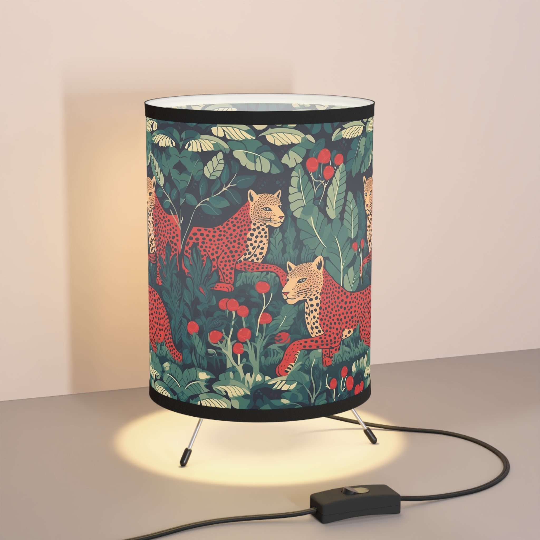 Illuminate your space with the enchanting allure of our "Leopard Love" Tripod Table Lamp, a masterpiece from our wildlife series, "The Highland Haven." This stunning lamp showcases a captivating pattern of three leopards amidst a backdrop of deep greens and rich browns, bringing the untamed beauty of the forest into your home.