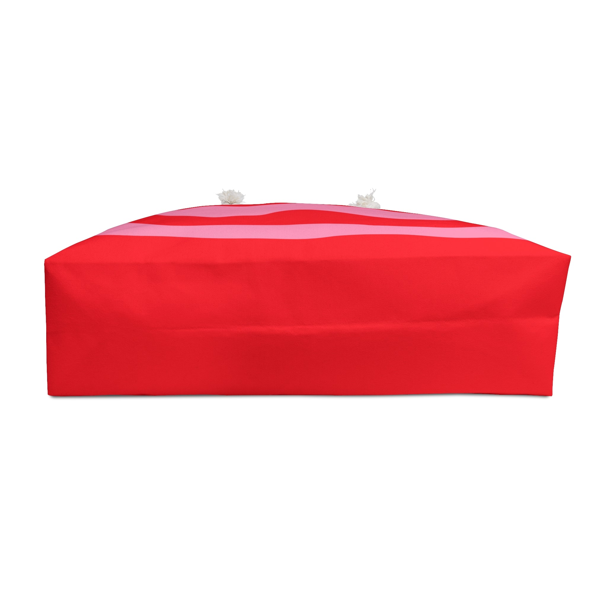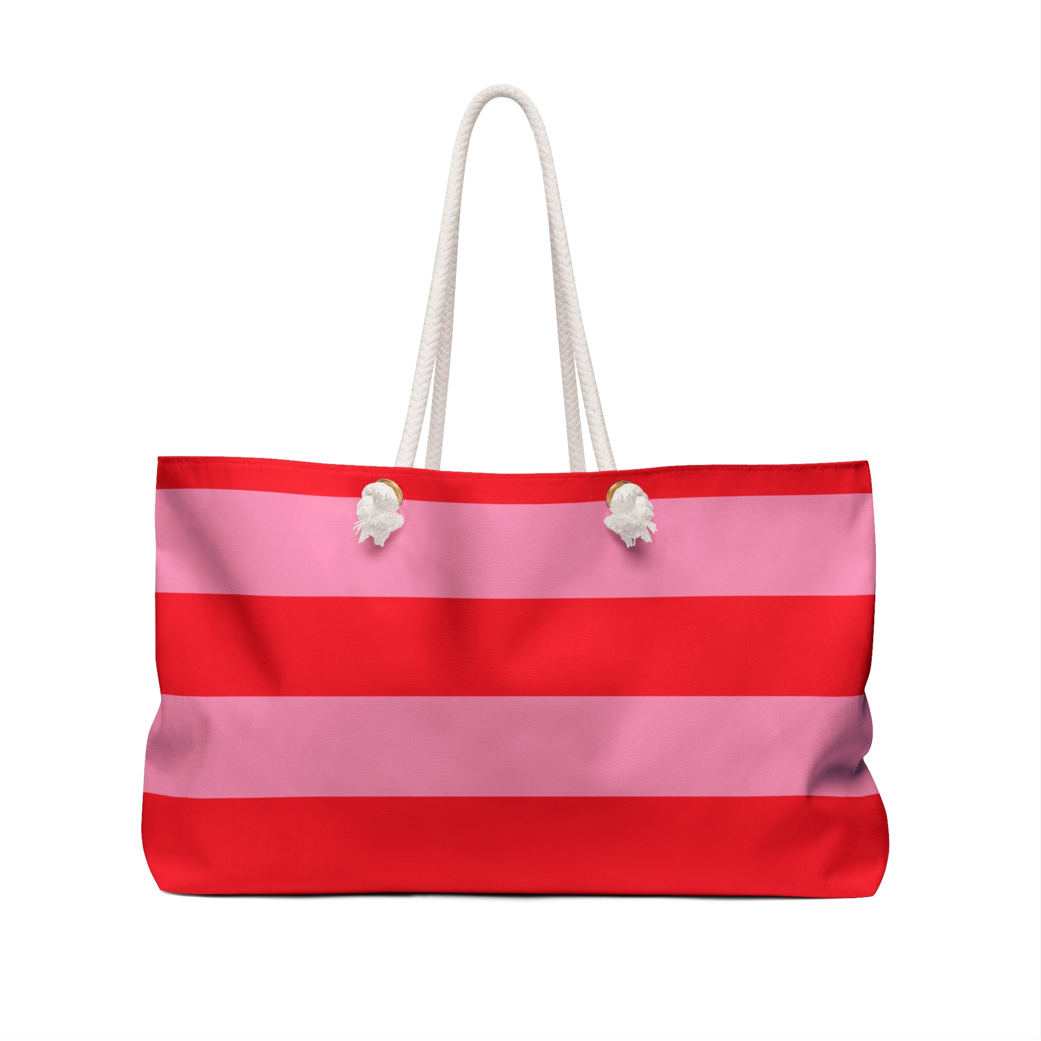 Pack up and hit the road in style with our oversized Summery Red and Pink Striped Weekender Tote! Whether you're headed for a weekend at the beach or exploring the city, this spacious tote is your perfect companion. Our oversized Weekender Tote is perfect for your weekend at the beach or in town. The wide-mouthed, durable bag holds a generous amount of personal items and is easily held by its thick rope handles.