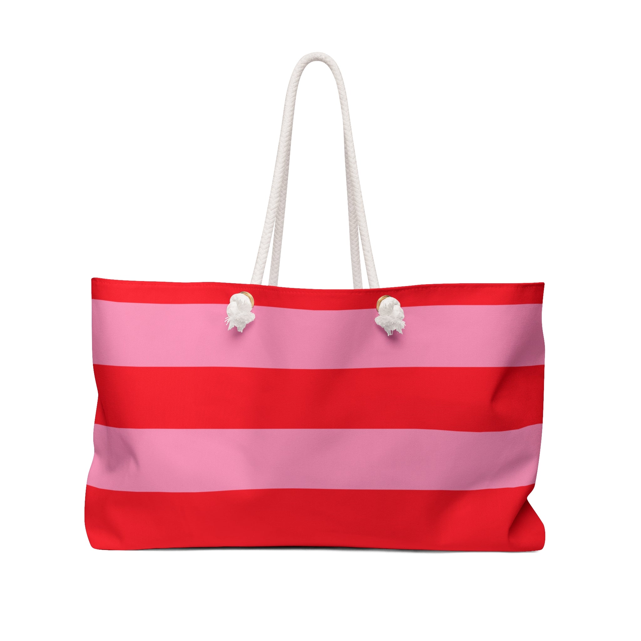 Versatile and Stylish: Whether you're off for a quick getaway or a longer adventure, our Summery Red and Pink Striped Weekender Tote is the perfect blend of style and functionality. Add it to your cart now and make your next trip a stylish one!