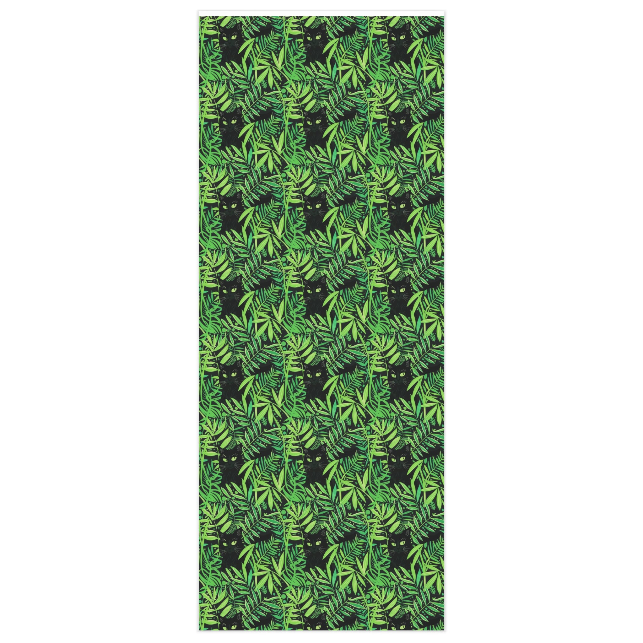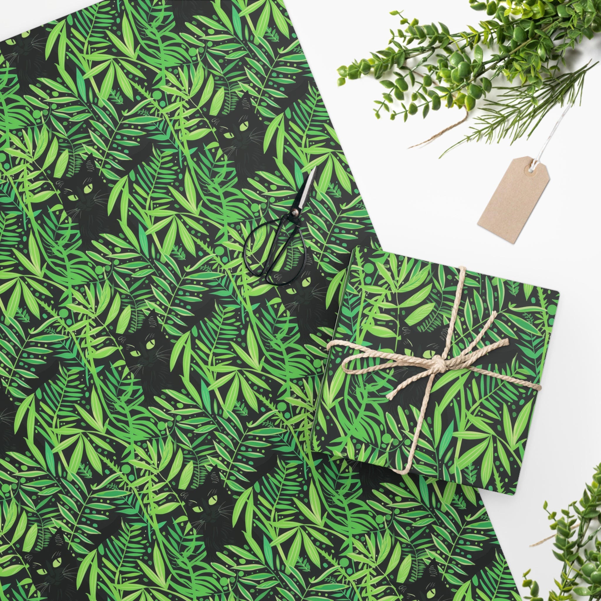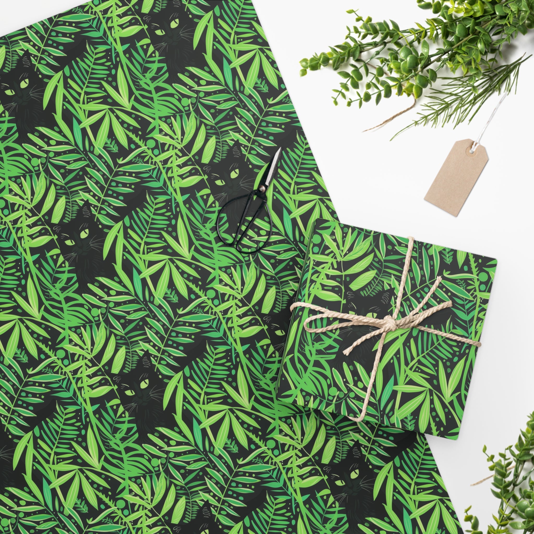Festive Tropical Cat Design: Our wrapping paper showcases a delightful array of watercolor illustrations of a pretty black cat peeking out through lush tropical greenery, perfect for Halloween or cat lovers everywhere.