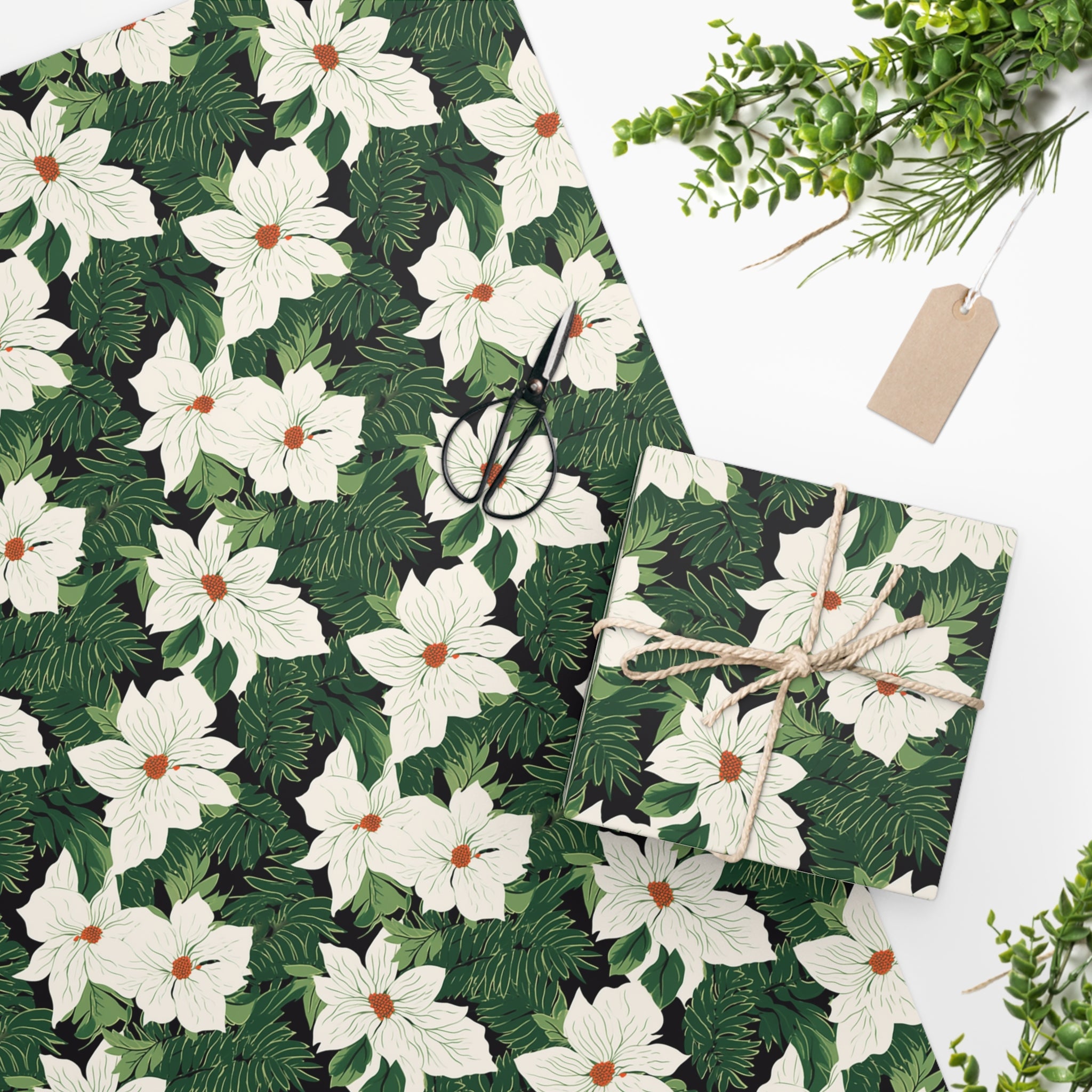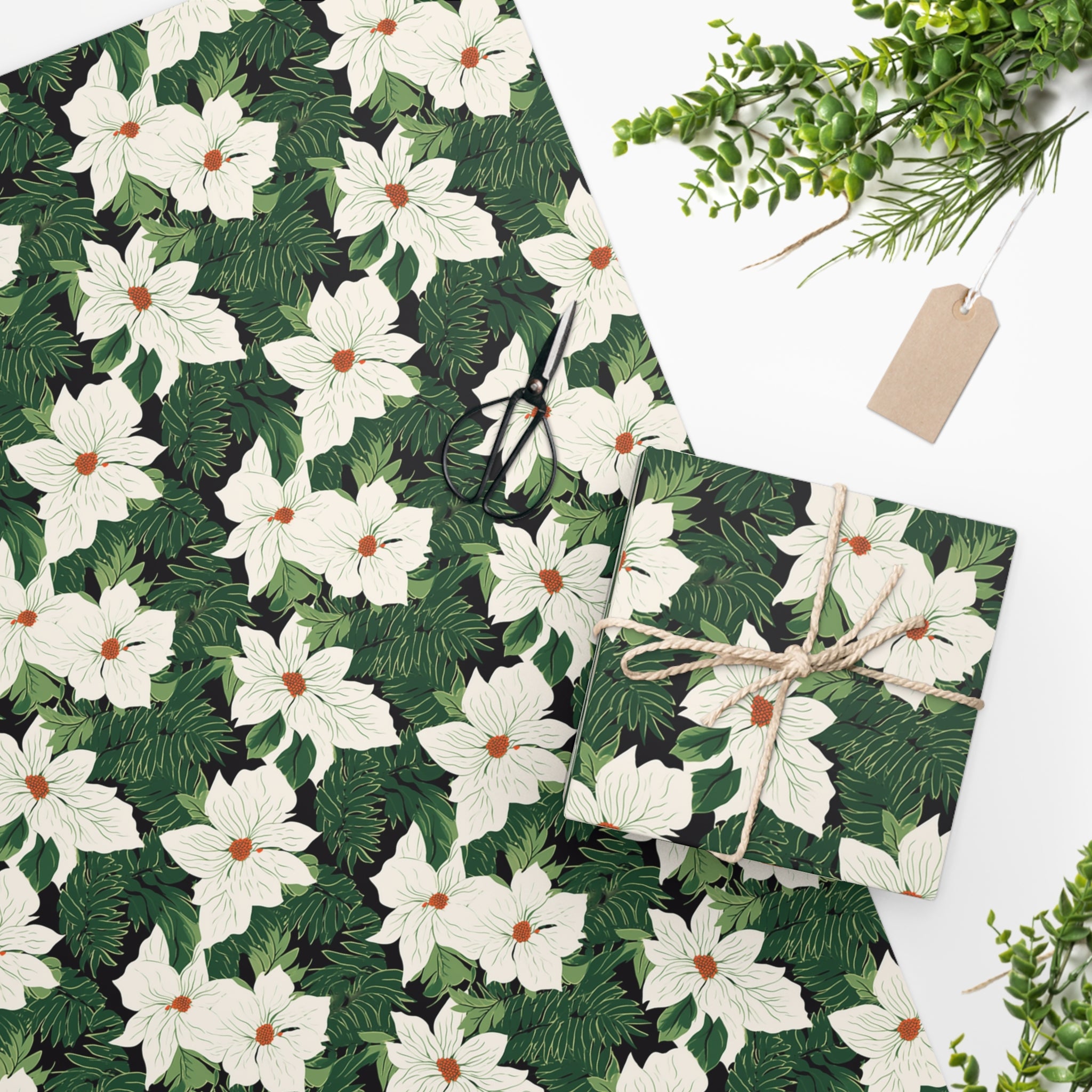 Elegant Poinsettias and Fir Illustration: The wrapping paper showcases beautifully illustrated white poinsettias and lush fir branches, creating a sophisticated and timeless design that complements any gift.