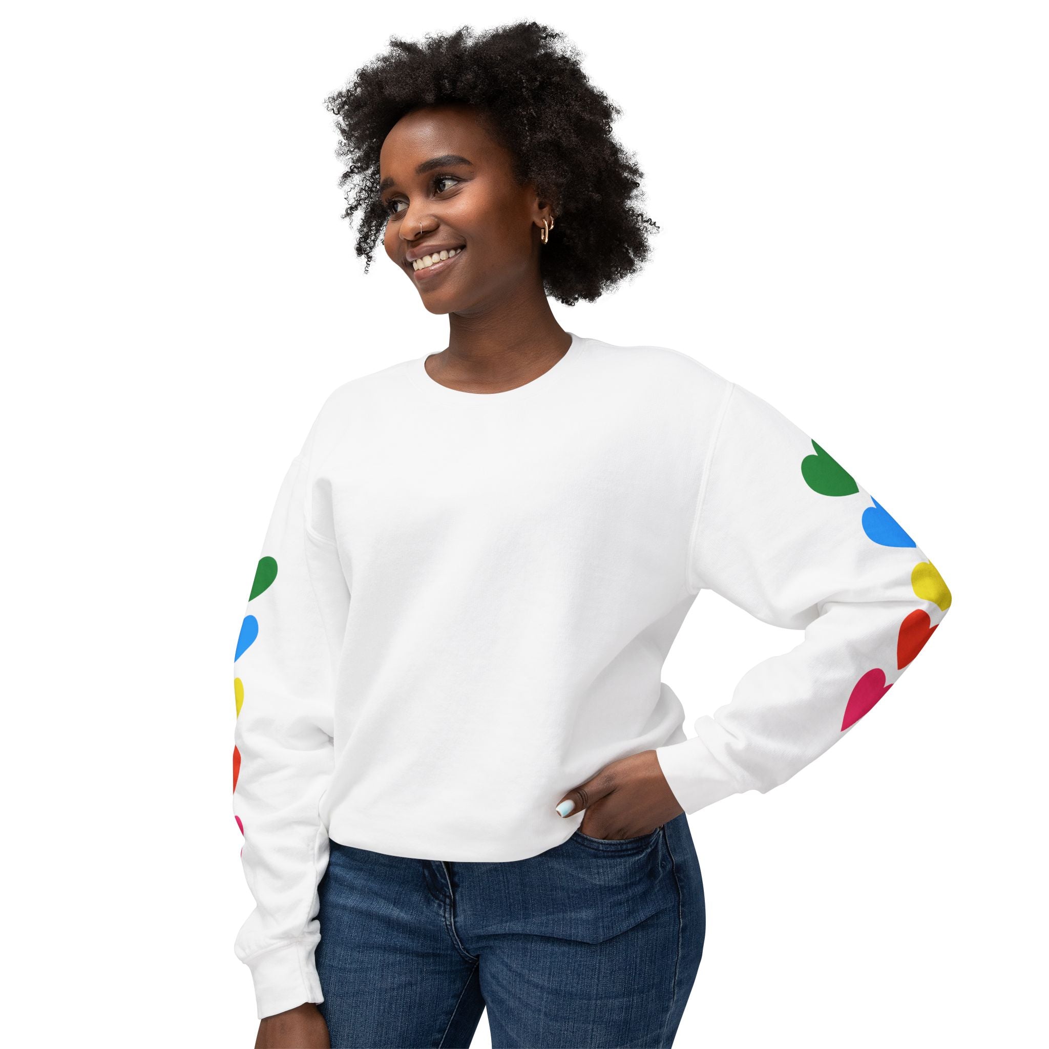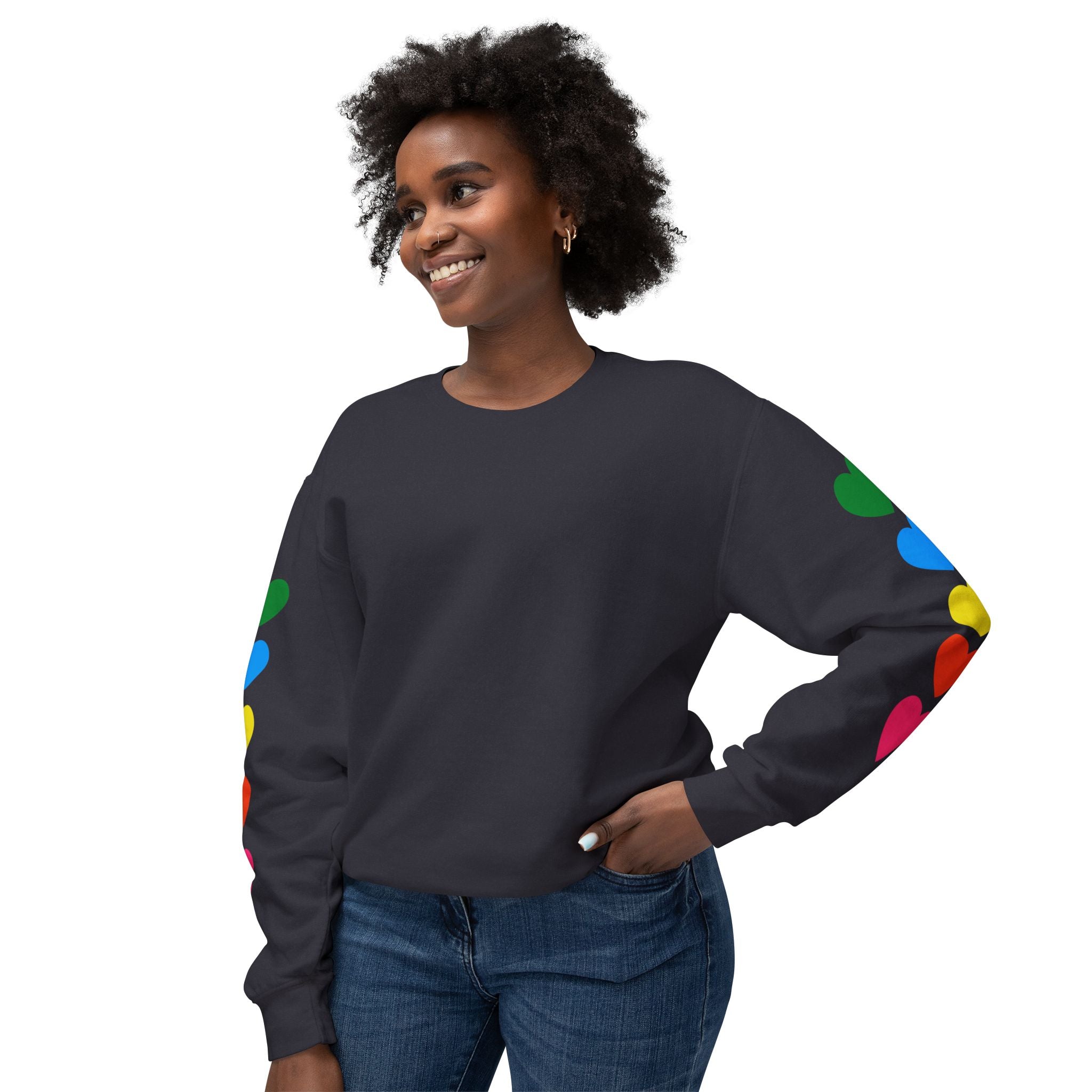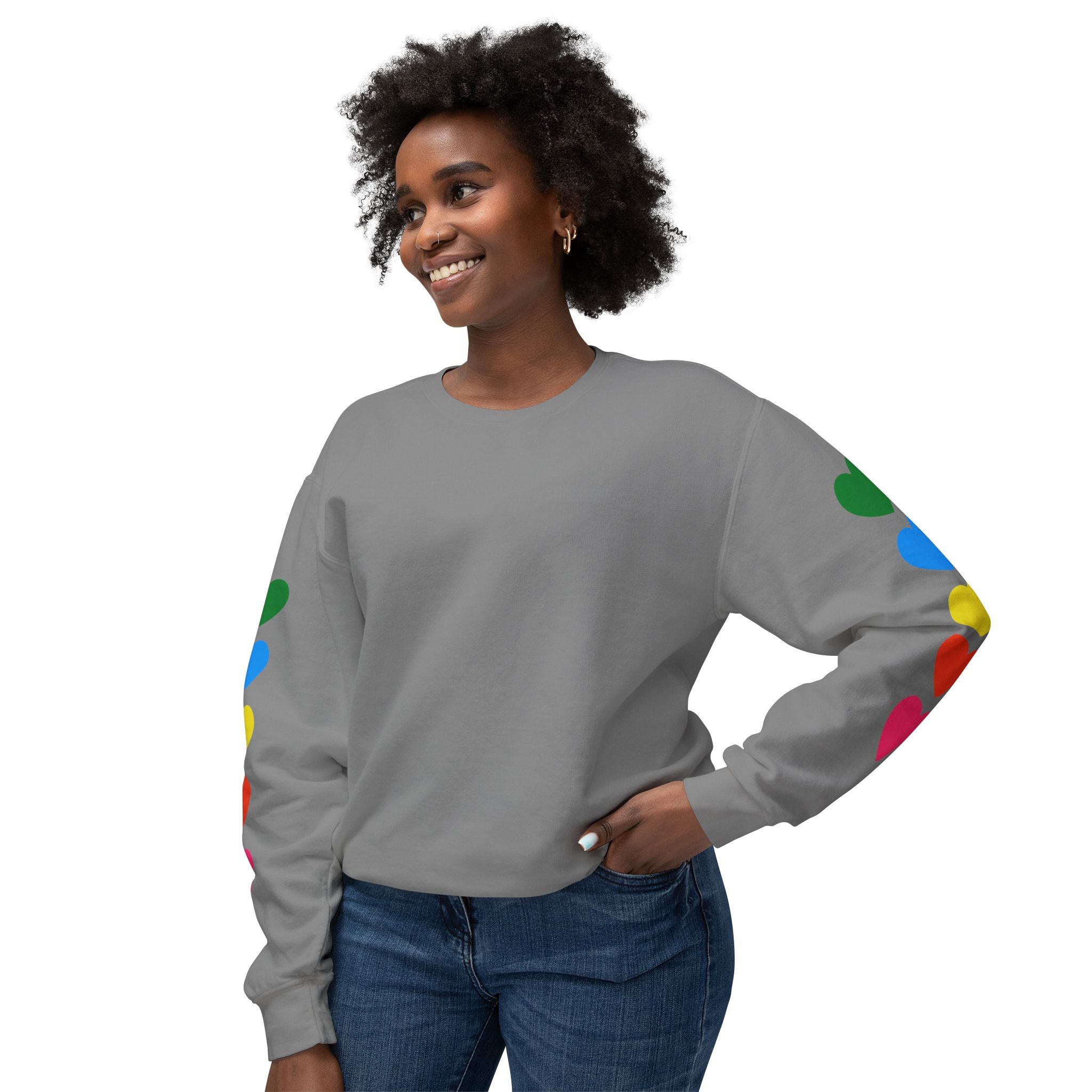 Spread the love and cozy up in our way cute All Love Super Soft Sweatshirt! Featuring playful, multicolored hearts adorning the sleeves, this custom crewneck blends incredible quality with feel-good style. Made from luxuriously soft, ring-spun cotton fabric with 100% cotton threads, it promises all-day comfort and a relaxed fit you’ll never want to take off.