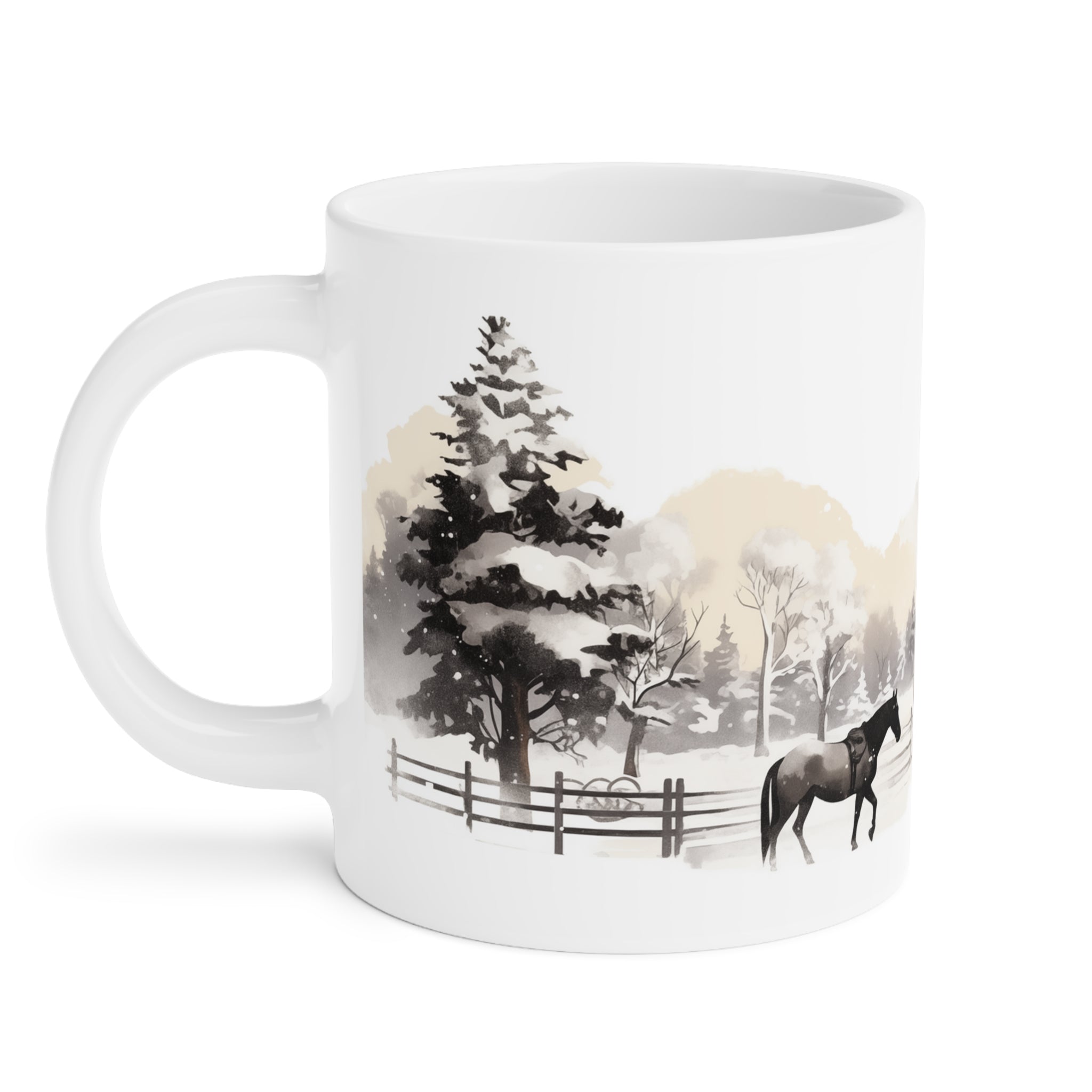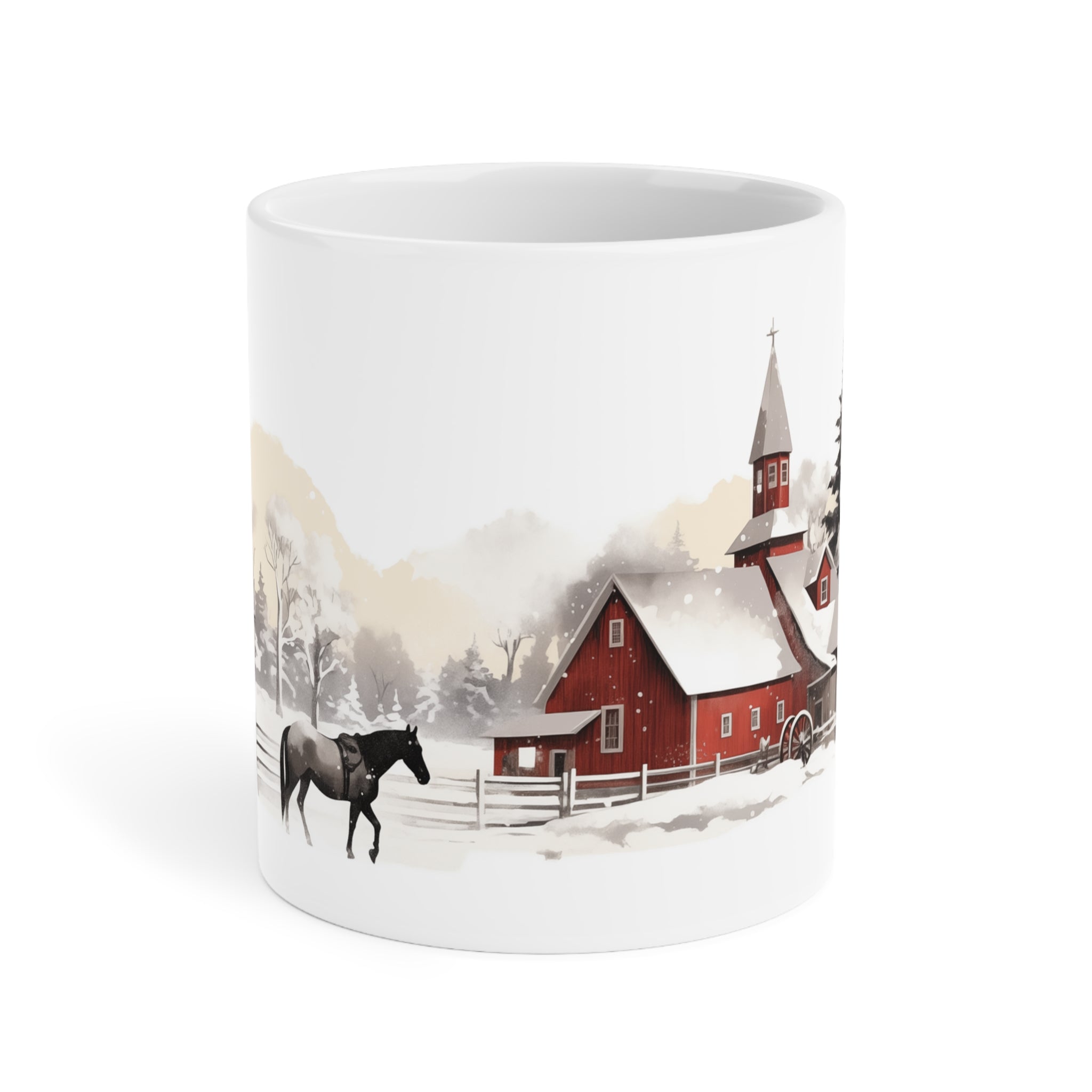 Introducing our charming Christmas Barn Mug, where the allure of a red barn, a majestic black horse, and a snowy scene adorned with Christmas trees come together to create a scene reminiscent of Norman Rockwell's timeless art. Step into the magic of simpler days gone by with this exquisite 20oz mug that turns your morning routine into a festive celebration.