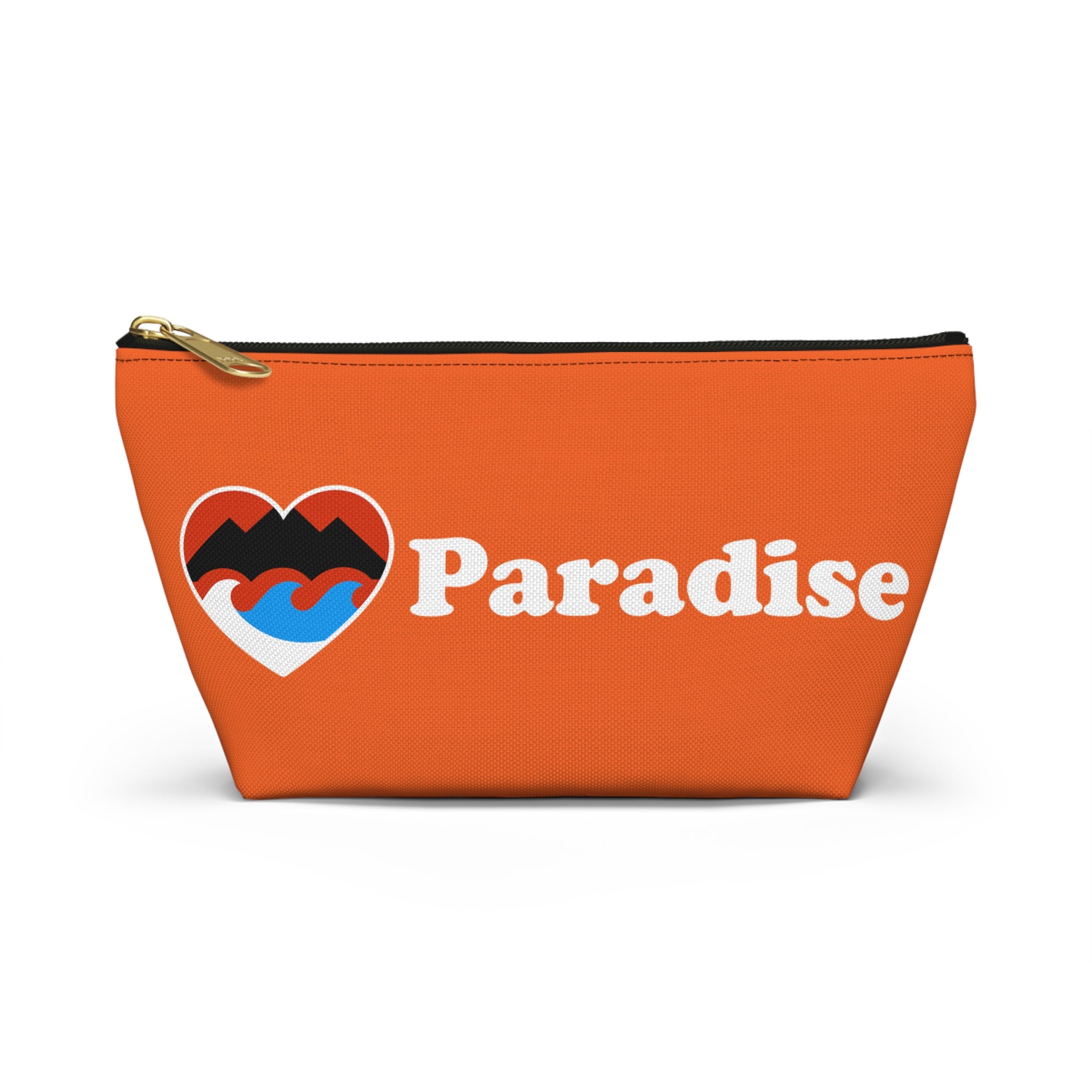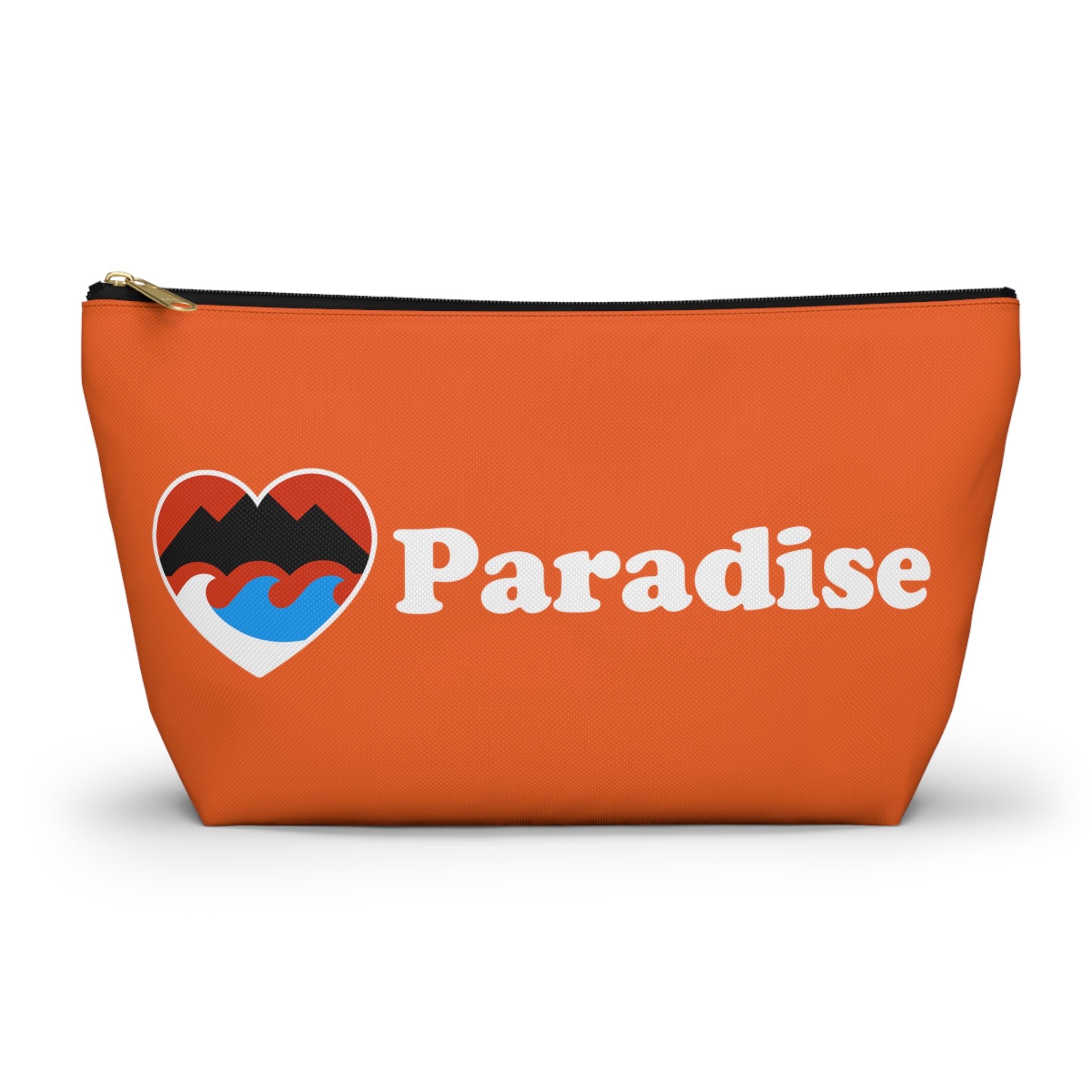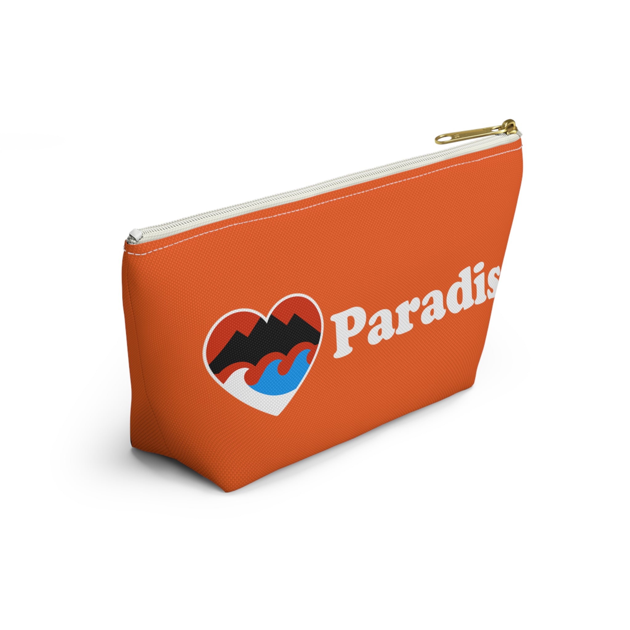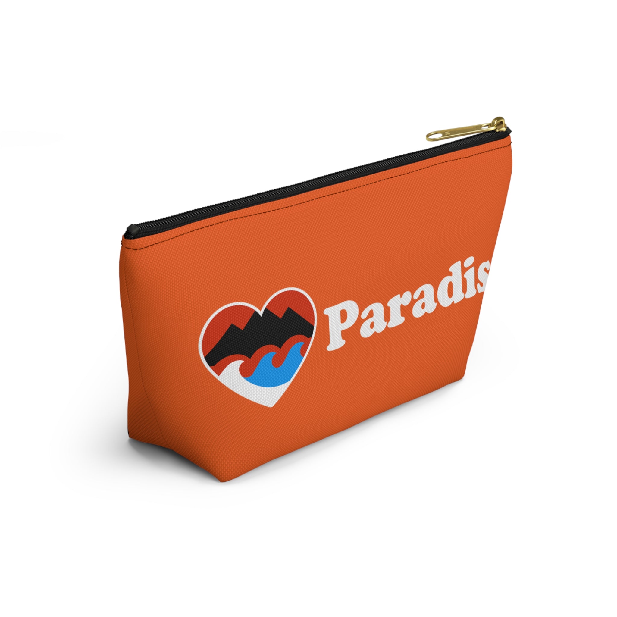 Add a burst of energy to your essentials with our Paradise Heart Icon Accessory Pouch in bold orange. Featuring our iconic logo—ocean waves and mountain peaks forming a heart—this pouch represents a love for nature and outdoor adventures. Perfect for storing pencils, cosmetics, or travel must-haves, it’s both stylish and functional.