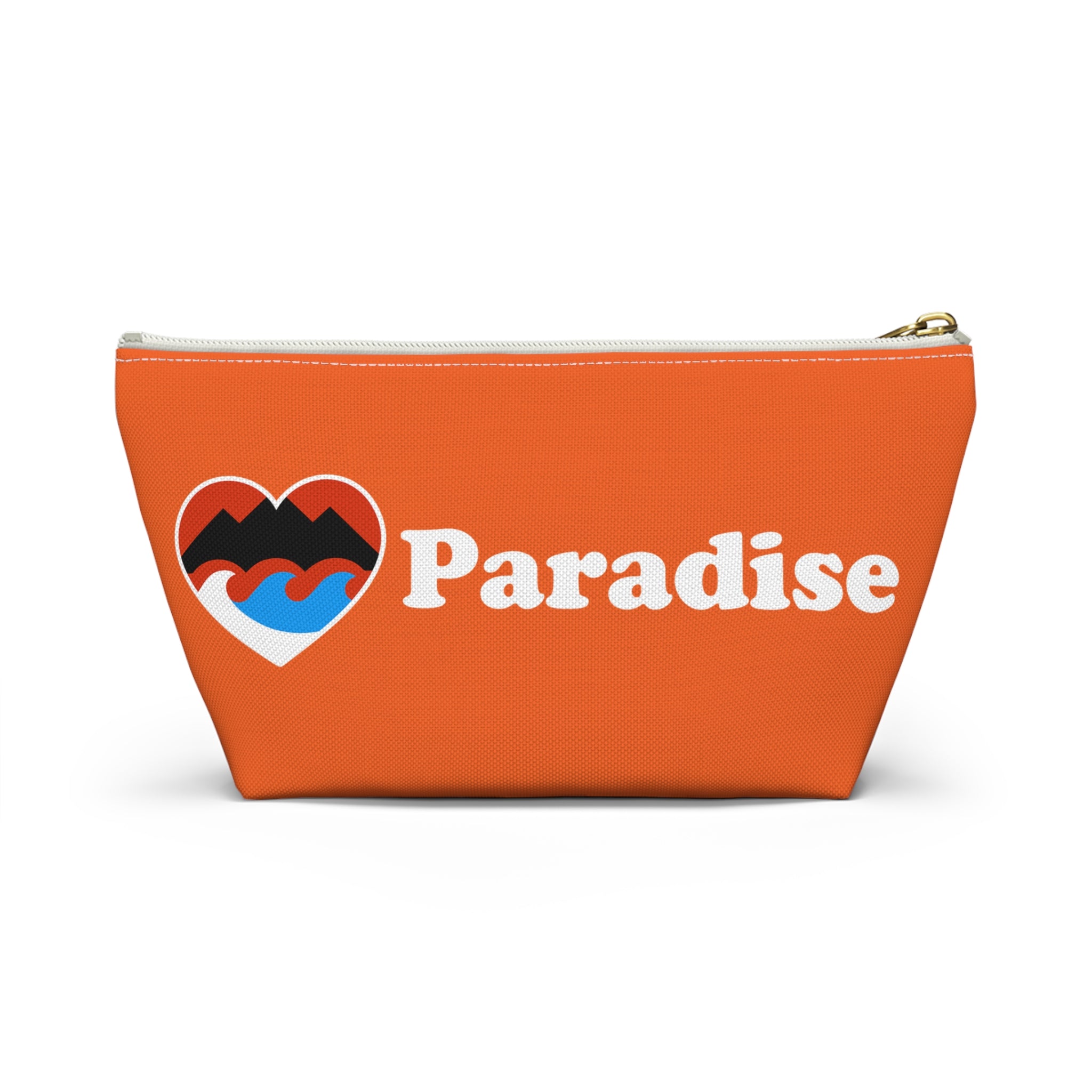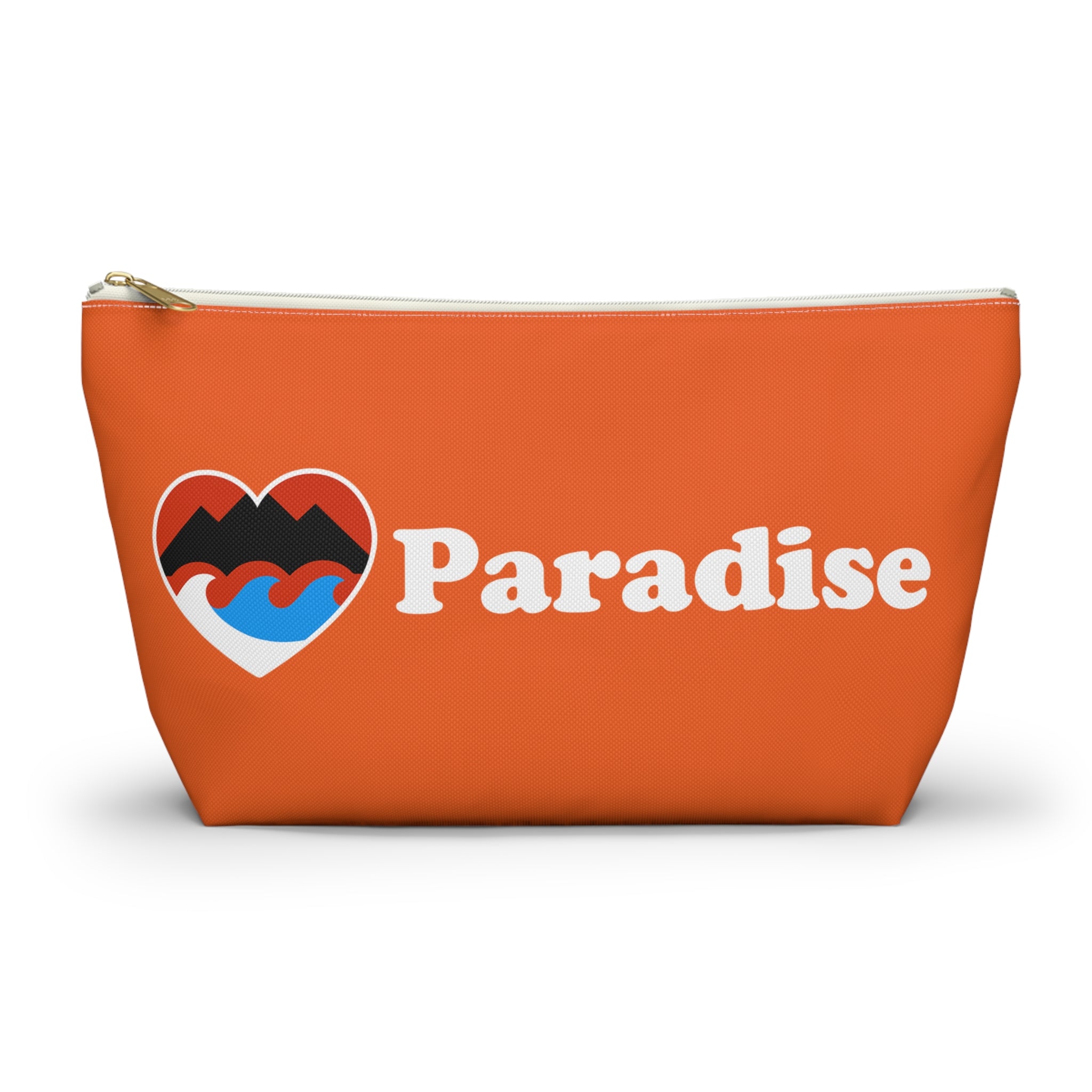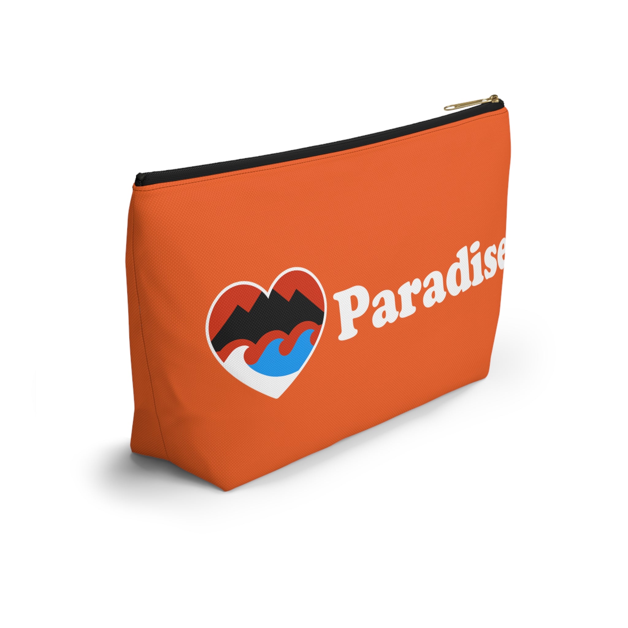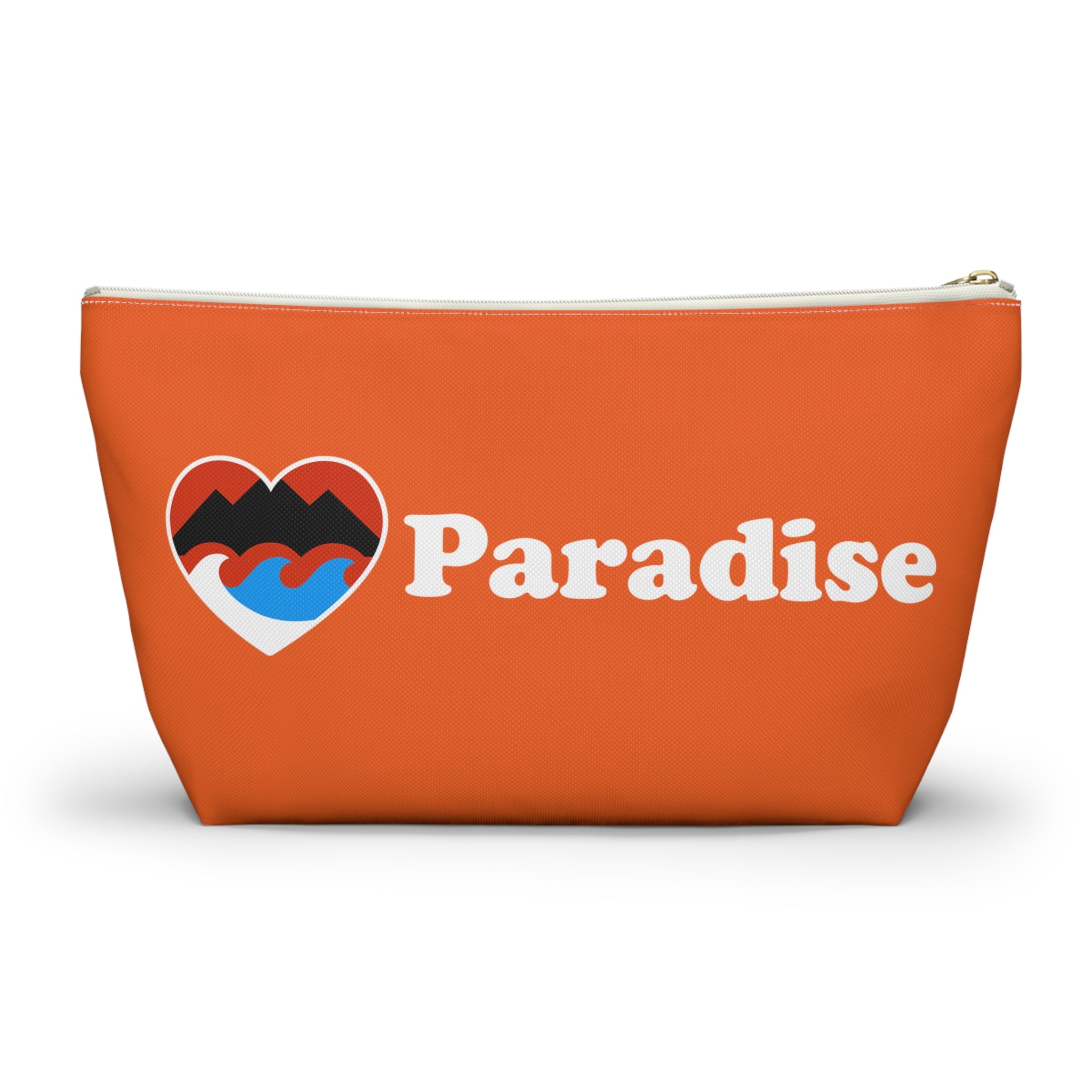 Add a burst of energy to your essentials with our Paradise Heart Icon Accessory Pouch in bold orange. Featuring our iconic logo—ocean waves and mountain peaks forming a heart—this pouch represents a love for nature and outdoor adventures. Perfect for storing pencils, cosmetics, or travel must-haves, it’s both stylish and functional.