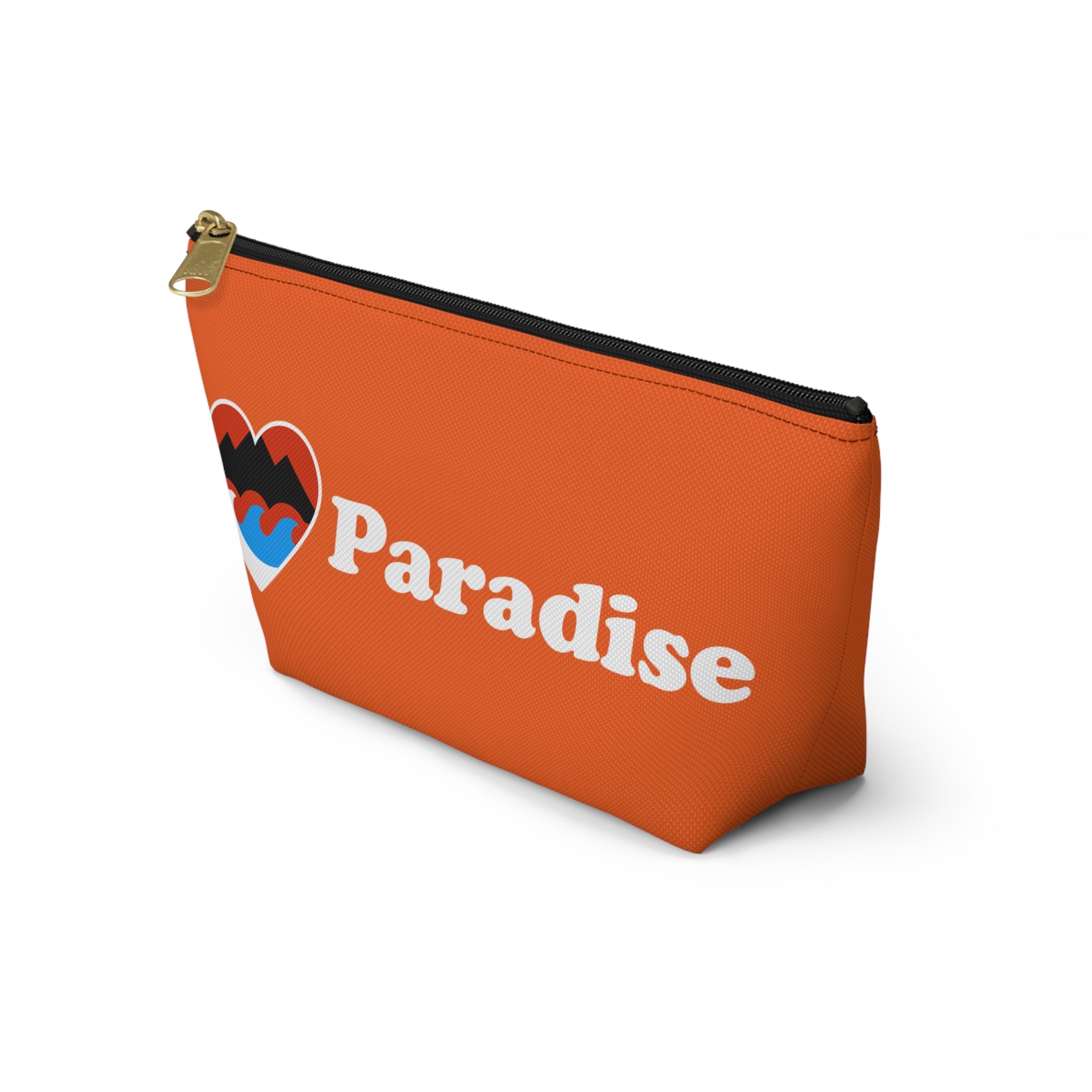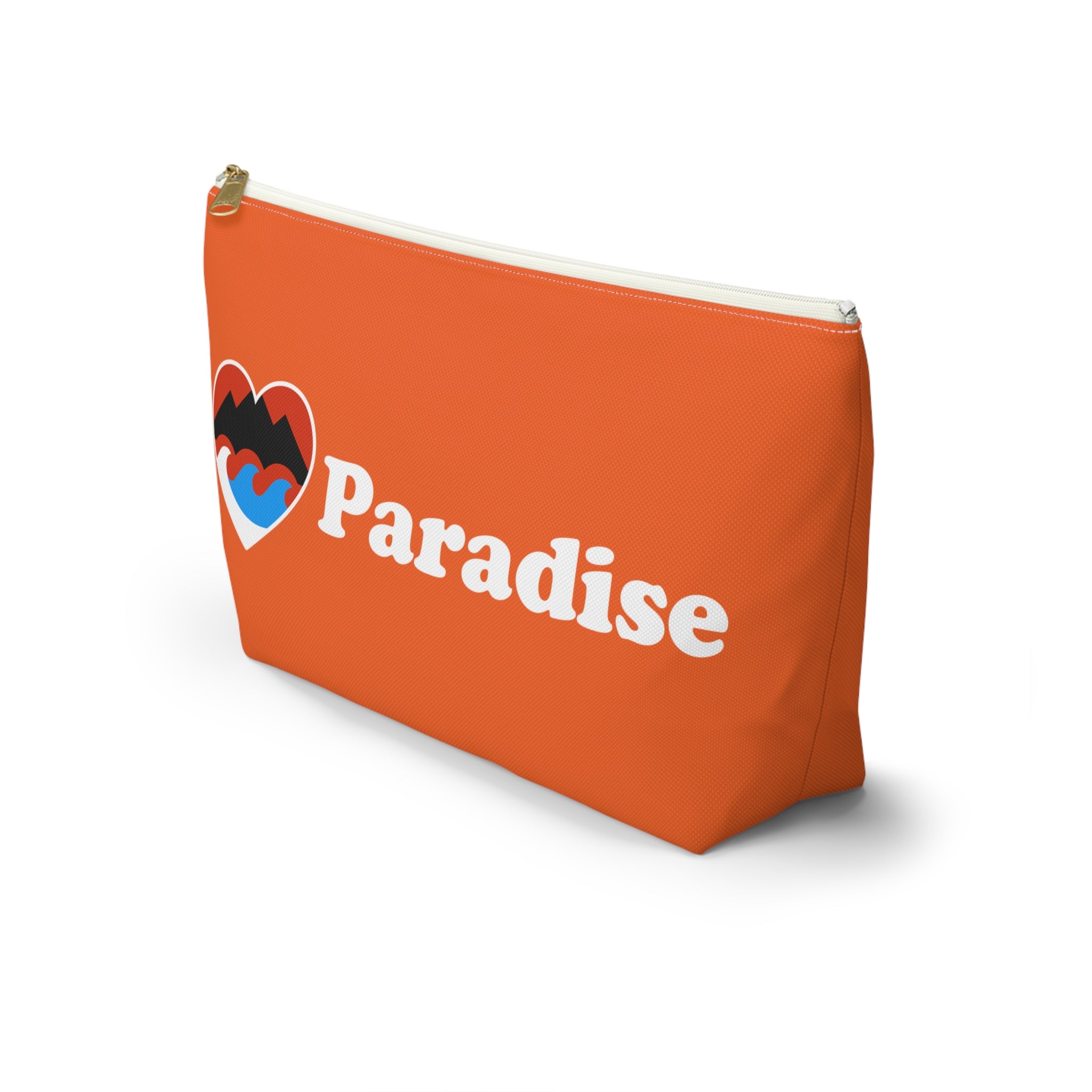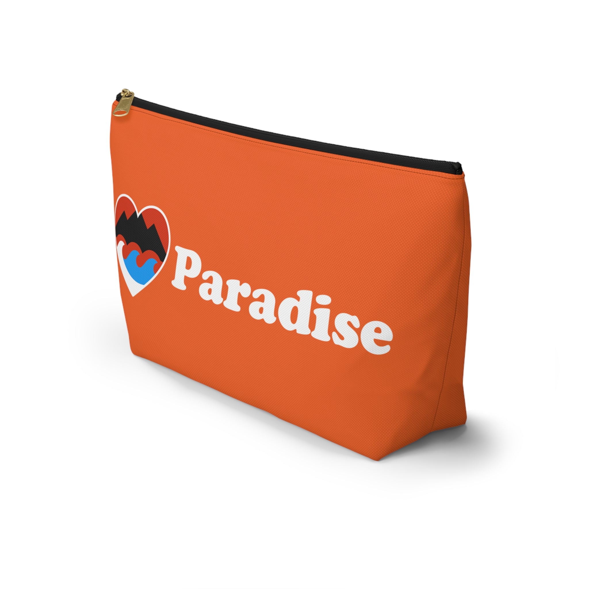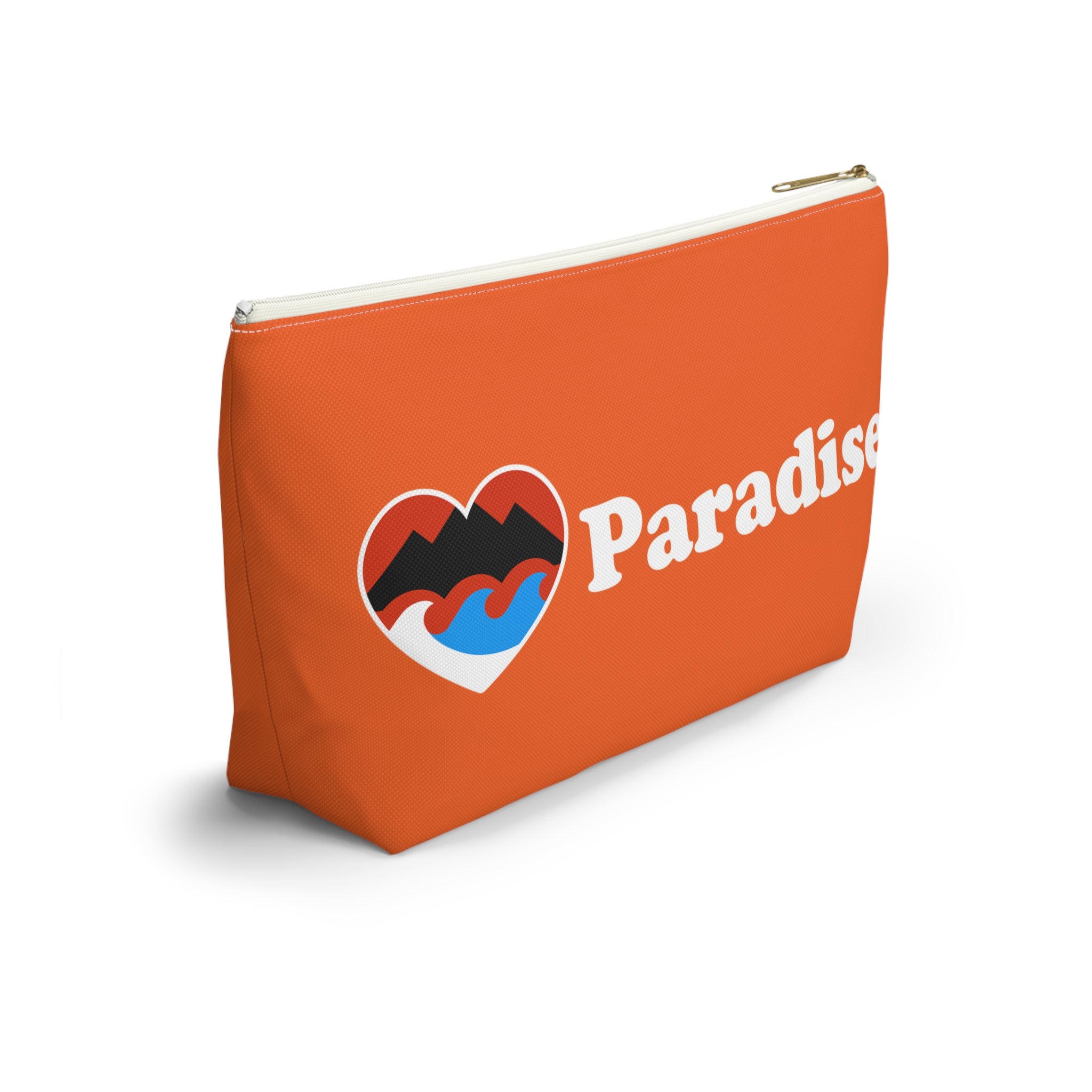 Add a burst of energy to your essentials with our Paradise Heart Icon Accessory Pouch in bold orange. Featuring our iconic logo—ocean waves and mountain peaks forming a heart—this pouch represents a love for nature and outdoor adventures. Perfect for storing pencils, cosmetics, or travel must-haves, it’s both stylish and functional.