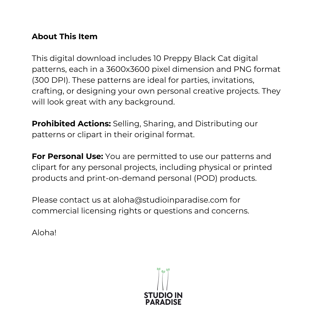 About This Item: This digital download includes 10 Preppy Black Cat patterns, each measuring 12x12 inches and 3600x3600 pixels in PNG format (300 DPI). These patterns are perfect for party invitations, crafting, or any creative project you have in mind. Use them to add a stylish and playful touch to your designs, but please remember they are not for resale.
